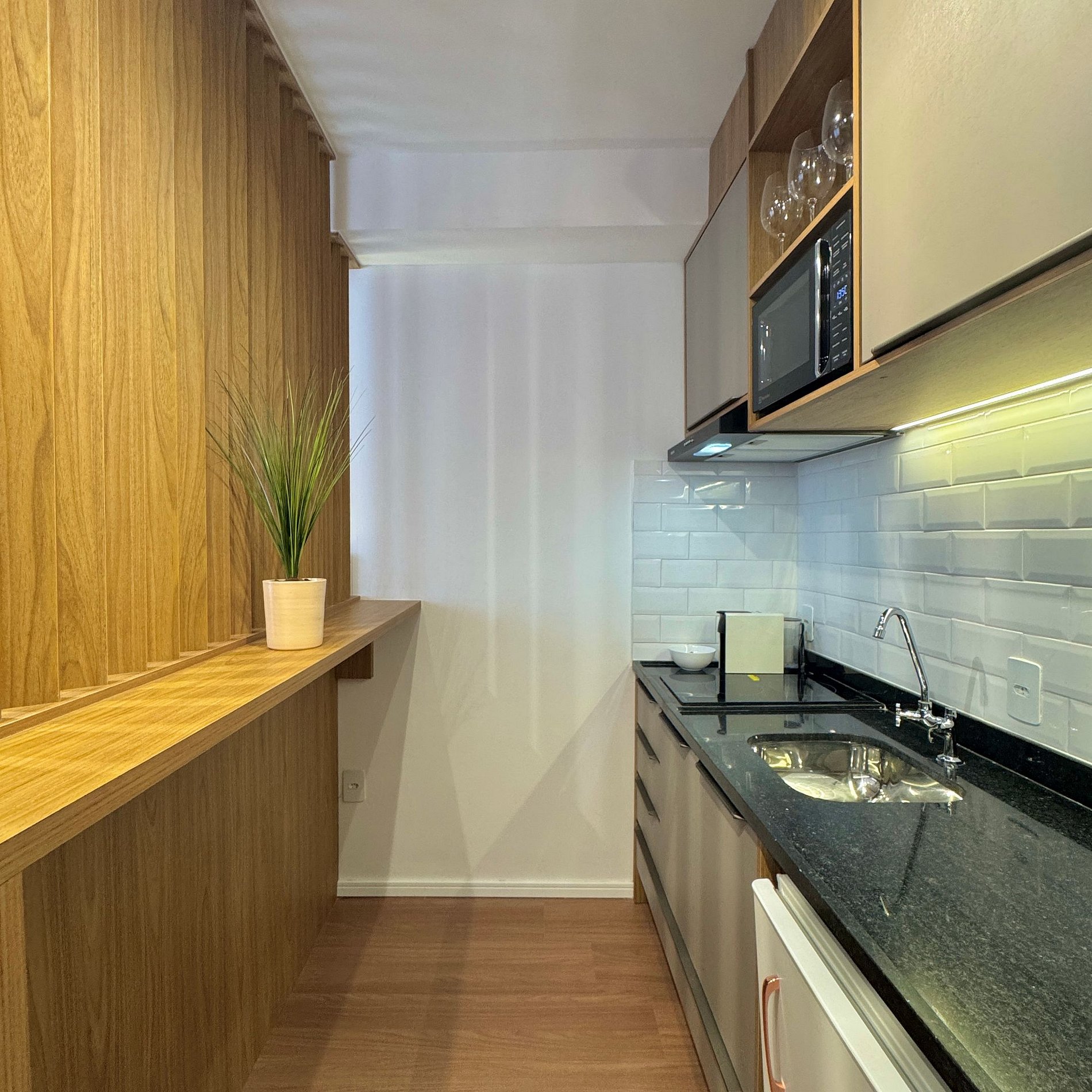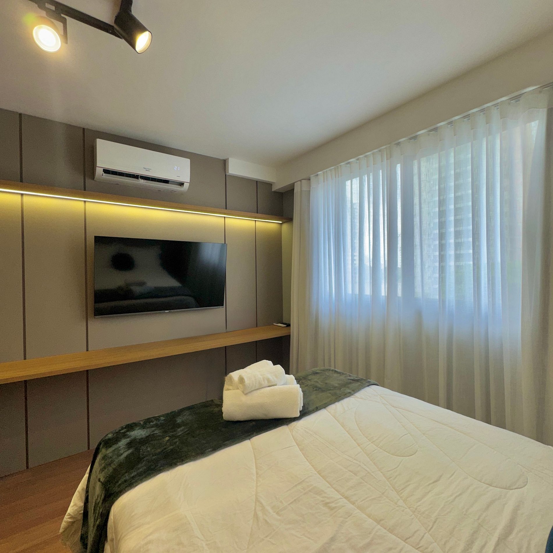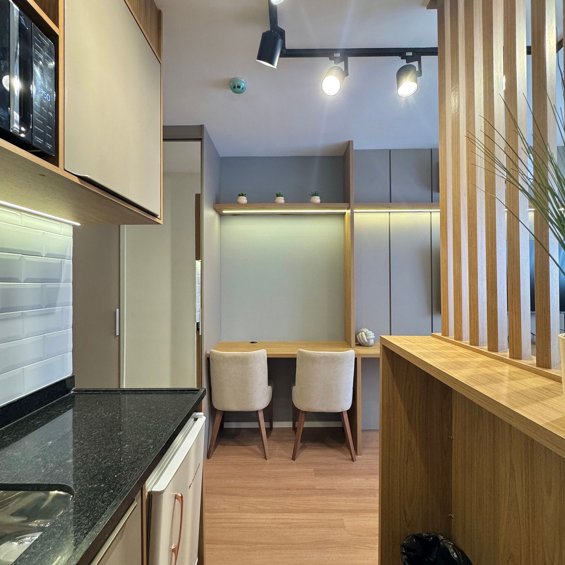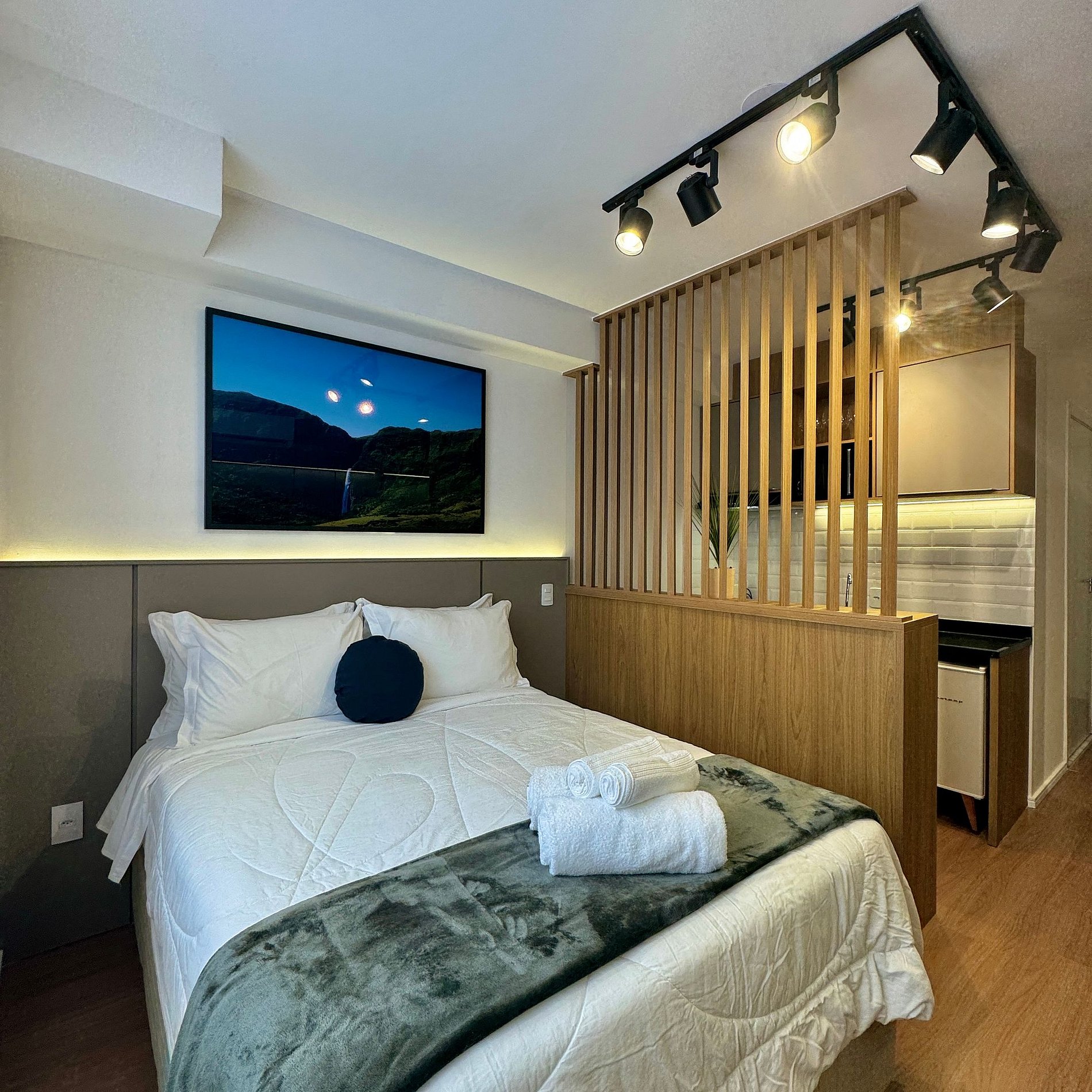 Aqui cada detalhe foi pensado para tornar sua estadia única: cozinha completa com fogão, micro-ondas, cafeteira, frigobar, quarto com cama de casal, blackout, enxoval completo, travesseiros, mantas/edredom para aqueles dias mais frios, Wi-fi, ar-condicionado, TV Smart e um espaço para home office.