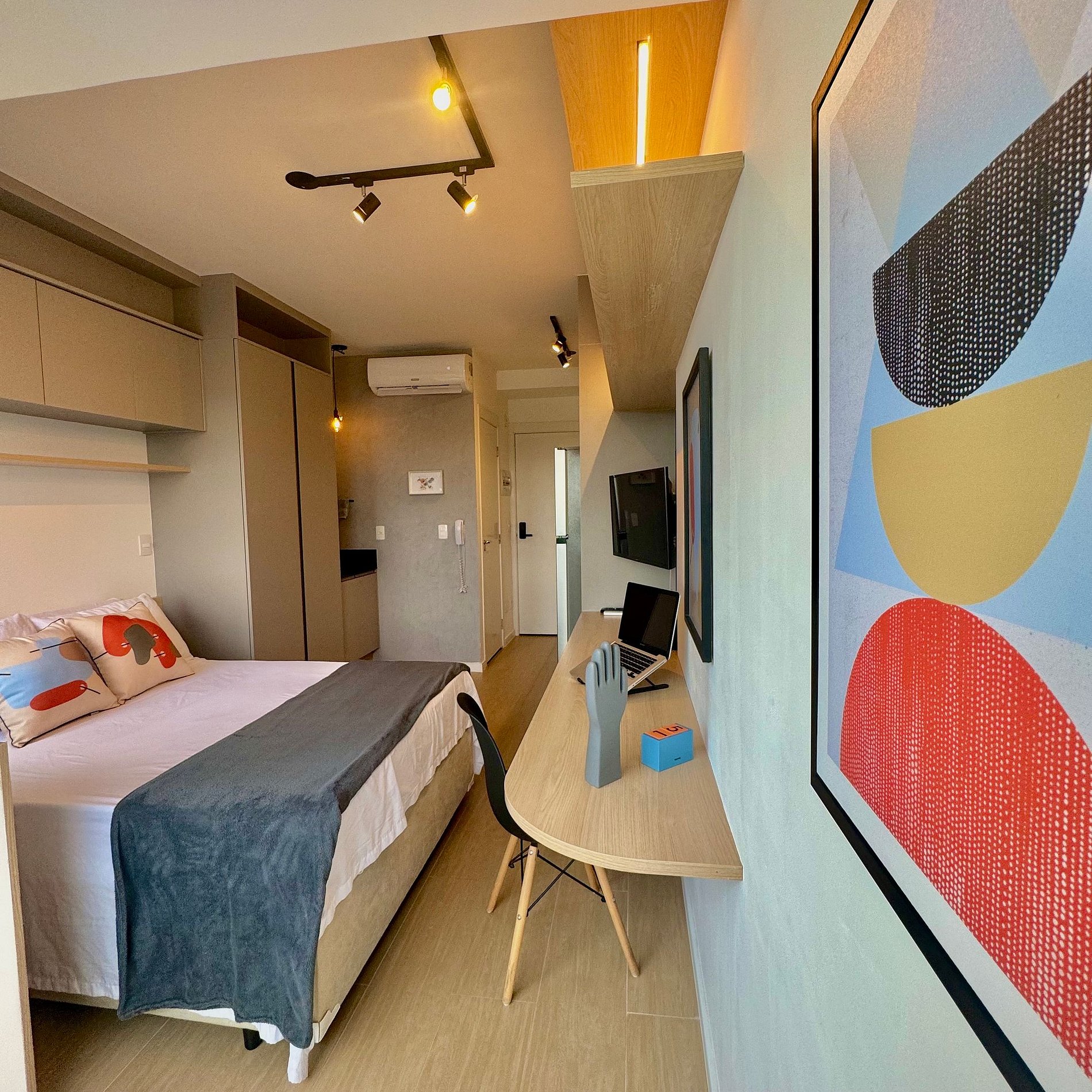 Aqui cada detalhe foi pensado para tornar sua estadia única: Cozinha completa com fogão, mobília, micro-ondas, cafeteira e geladeira, quarto com cama de casal, persiana com blackout, enxoval completo, travesseiros e mantas/edredom para aqueles dias mais frios, banheiro com chuveiro térmico a gás, secadora de cabelos, ar-condicionado, TV Smart, wi-fi. O grande destaque é a localização privilegiada e as áreas de lazer.