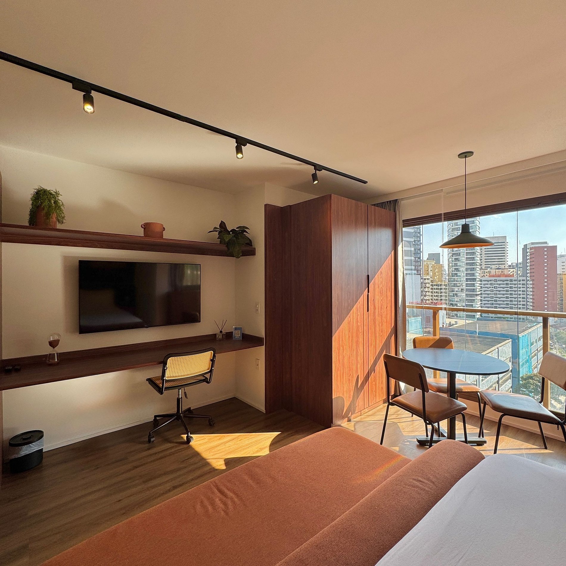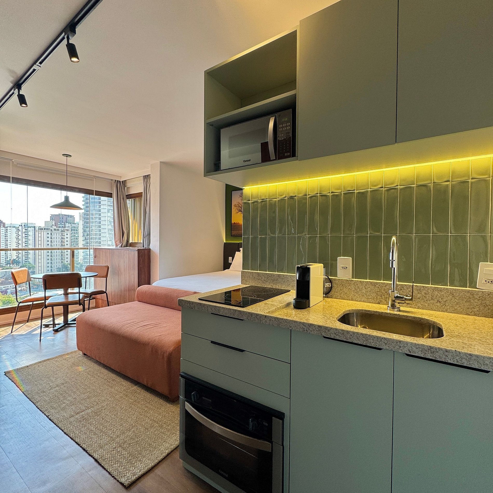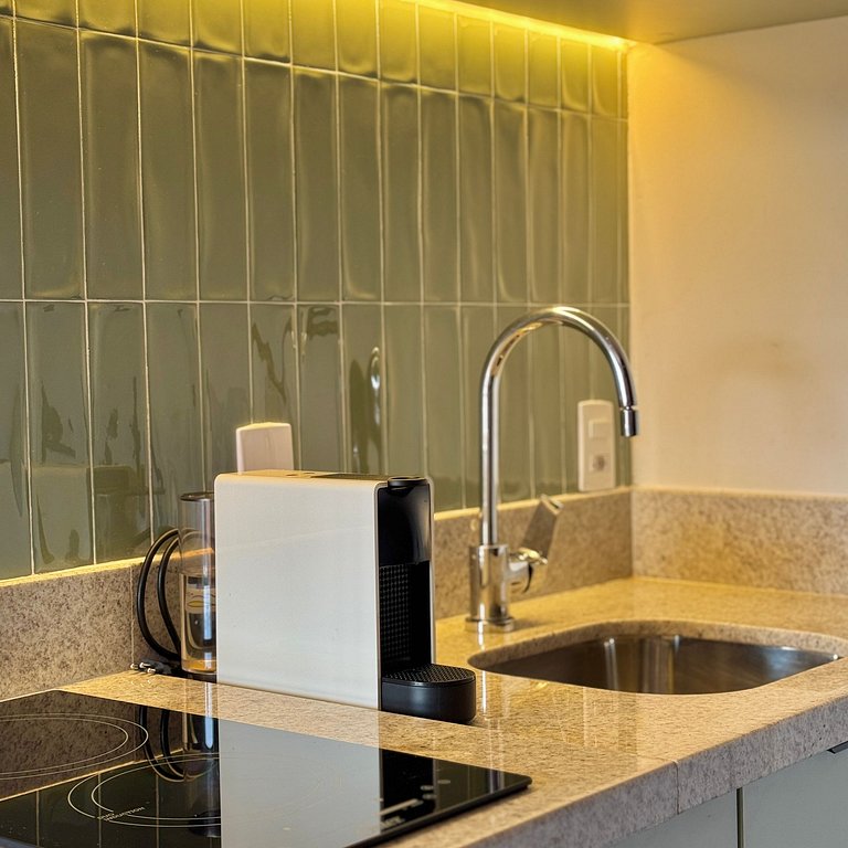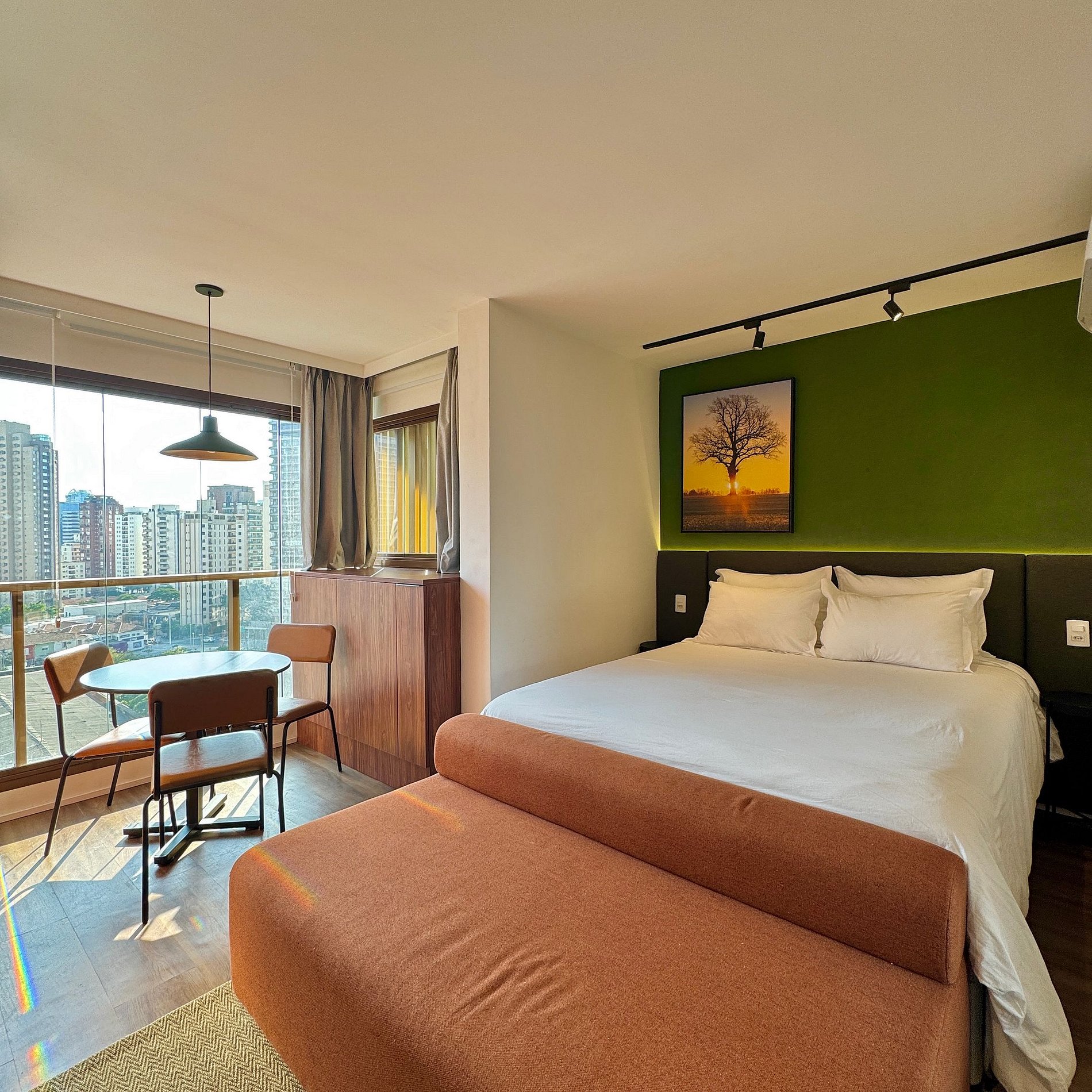 Aqui cada detalhe foi pensado para tornar sua estadia única: cozinha completa com fogão, micro-ondas, cafeteira, geladeira. O quarto com cama queen, sofá, blackout, enxoval completo, travesseiros e mantas/edredom para aqueles dias mais frios, wi-fi, ar-condicionado, TV Smart e um espaço para home office. O grande destaque são os móveis planejados com ótimo acabamento e bom gosto e uma sacada integrada, que garantem mais espaço e iluminação natural.