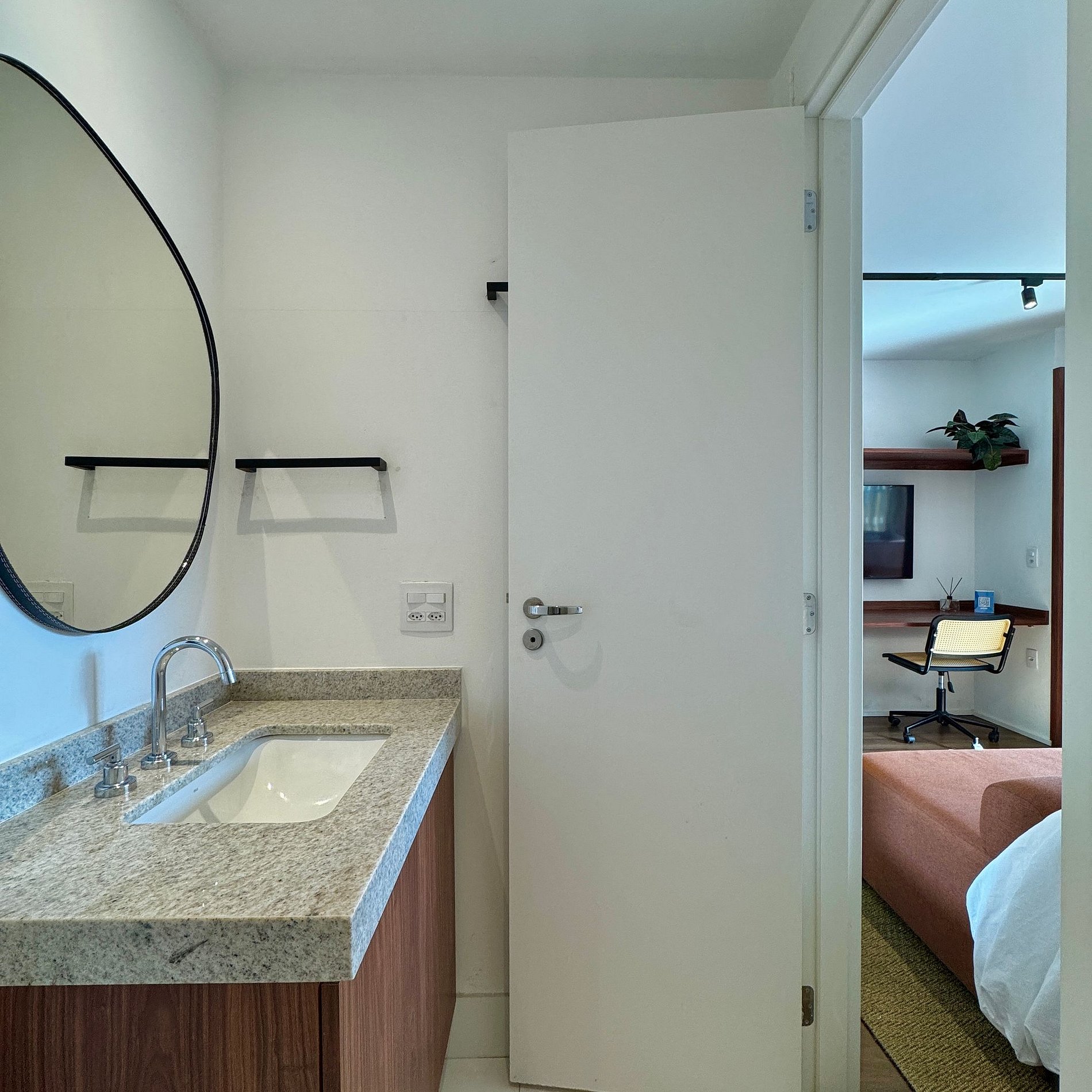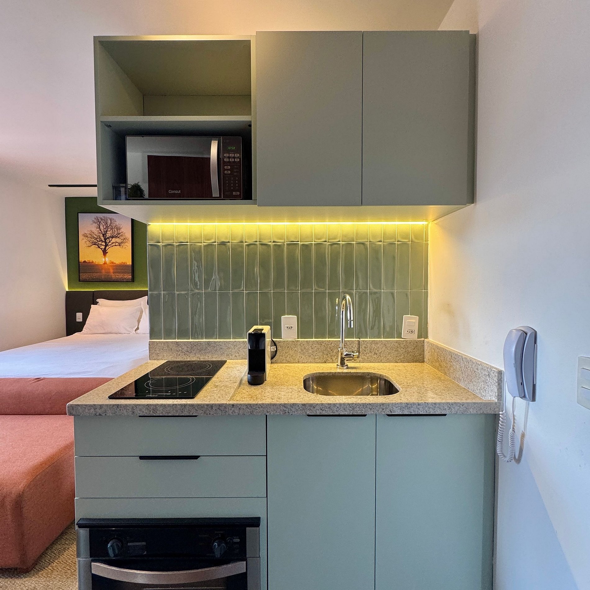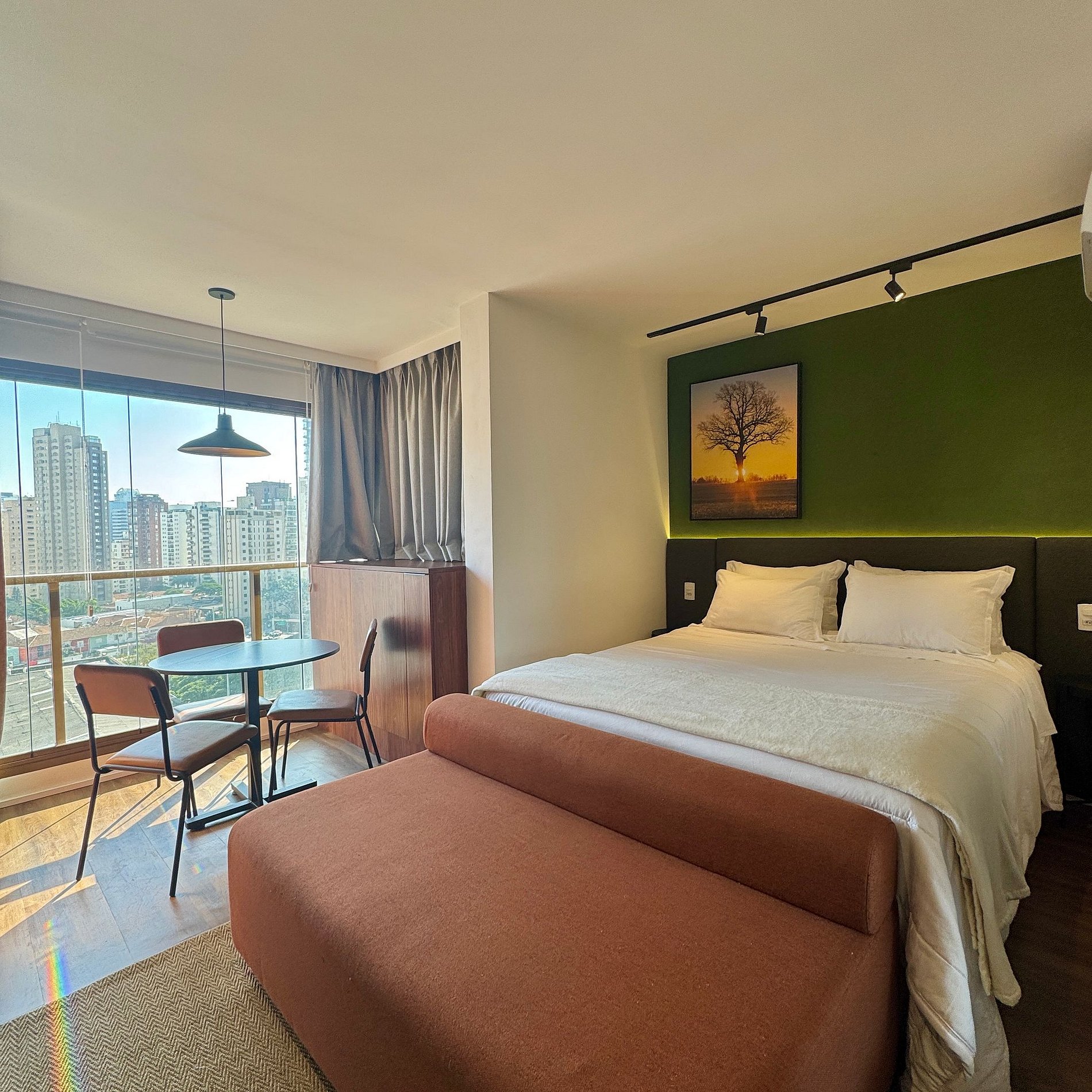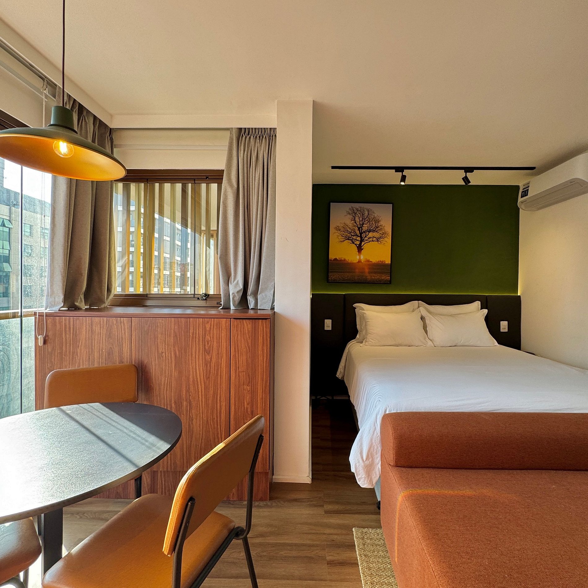 Aqui cada detalhe foi pensado para tornar sua estadia única: cozinha completa com fogão, micro-ondas, cafeteira, geladeira. O quarto com cama queen, sofá, blackout, enxoval completo, travesseiros e mantas/edredom para aqueles dias mais frios, wi-fi, ar-condicionado, TV Smart e um espaço para home office. O grande destaque são os móveis planejados com ótimo acabamento e bom gosto e uma sacada integrada, que garantem mais espaço e iluminação natural.