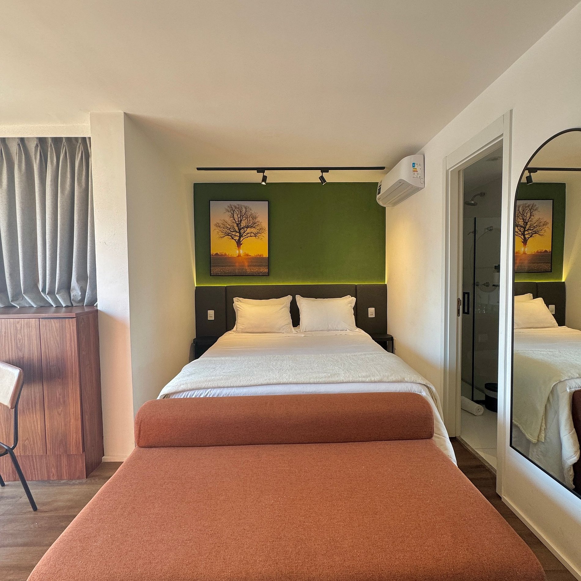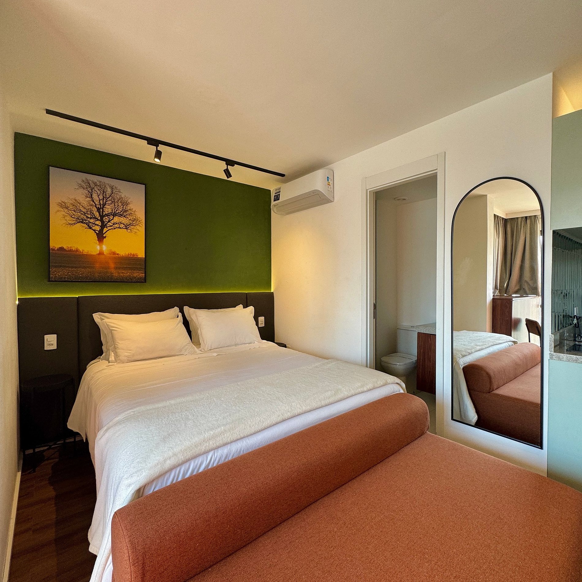 Aqui cada detalhe foi pensado para tornar sua estadia única: cozinha completa com fogão, micro-ondas, cafeteira, geladeira. O quarto com cama queen, sofá, blackout, enxoval completo, travesseiros e mantas/edredom para aqueles dias mais frios, wi-fi, ar-condicionado, TV Smart e um espaço para home office. O grande destaque são os móveis planejados com ótimo acabamento e bom gosto e uma sacada integrada, que garantem mais espaço e iluminação natural.