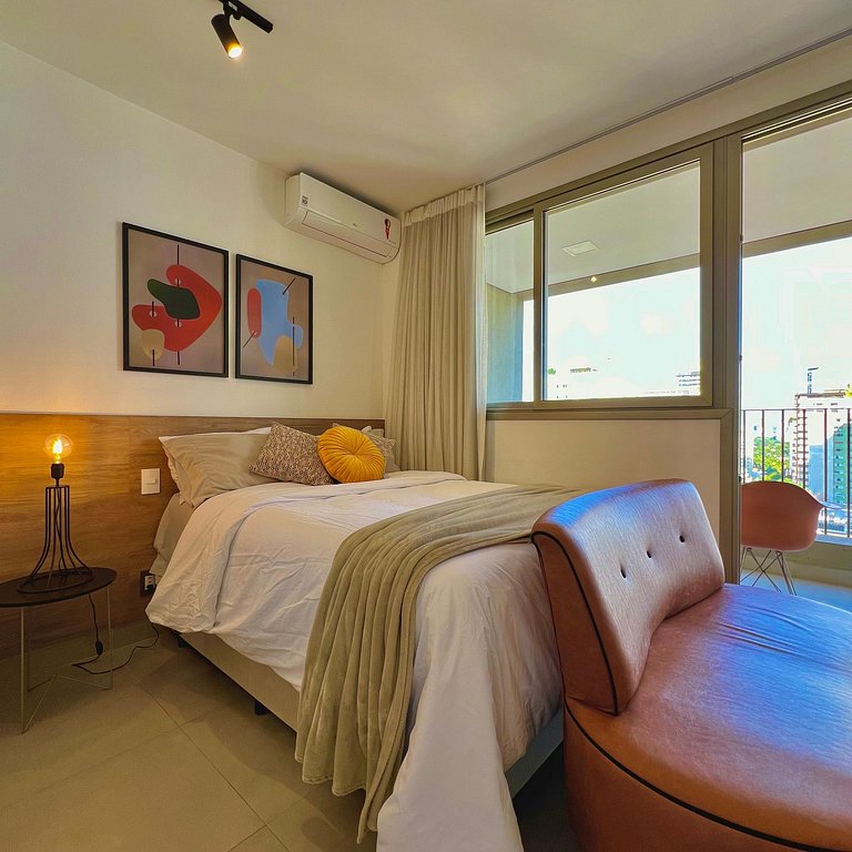 Aqui cada detalhe foi pensado para tornar sua estadia única: cozinha completa com fogão, micro-ondas, cafeteira e geladeira, quarto com cama de casal, blackout, wi-fi, ar-condicionado, vaga de garagem (com manobrista), TV Smart e um espaço para home office. O grande destaque é a sacada com vista marcante para o bairro Jardins, perfeita para trabalhar, relaxar, ler um livro ou simplesmente apreciar momentos tranquilos.