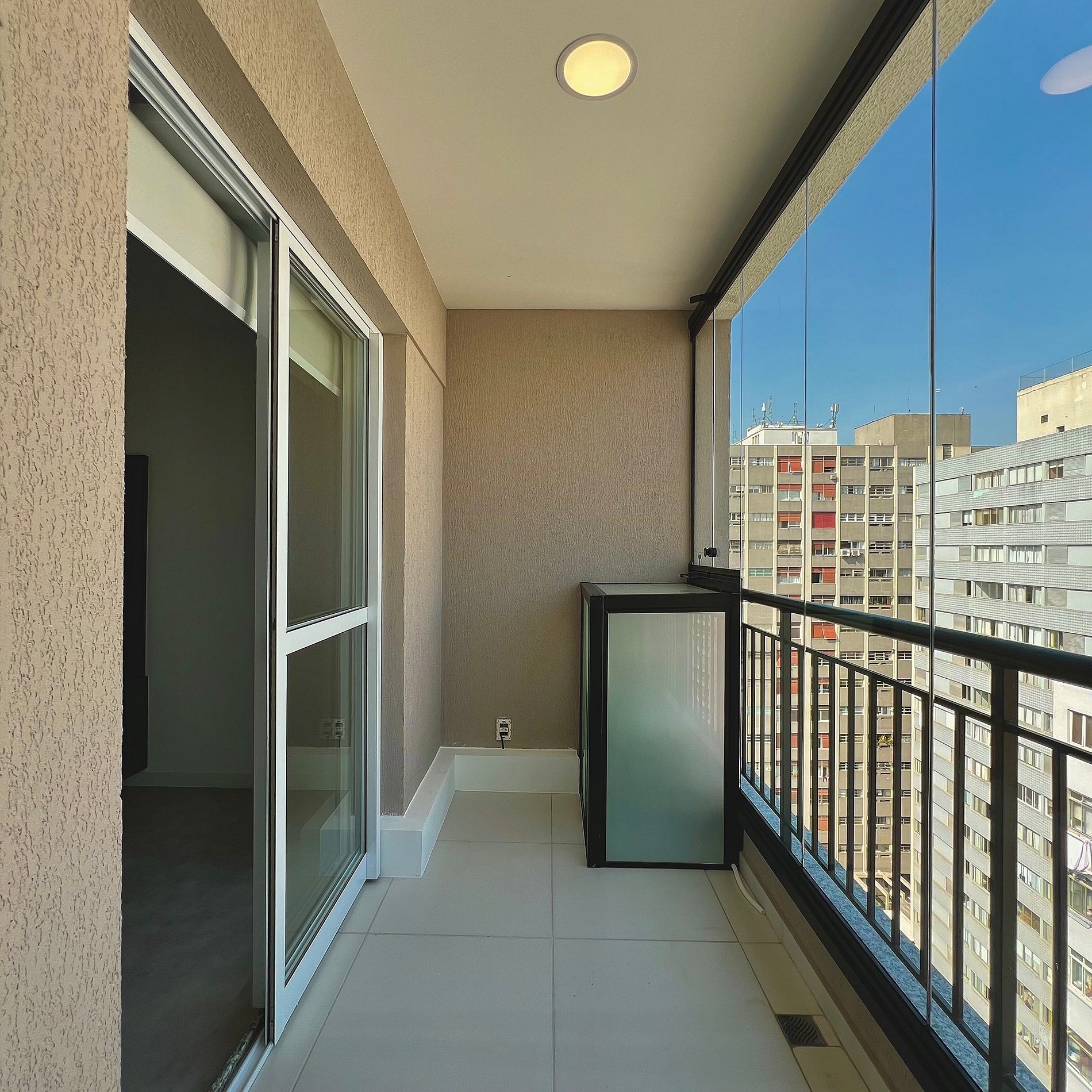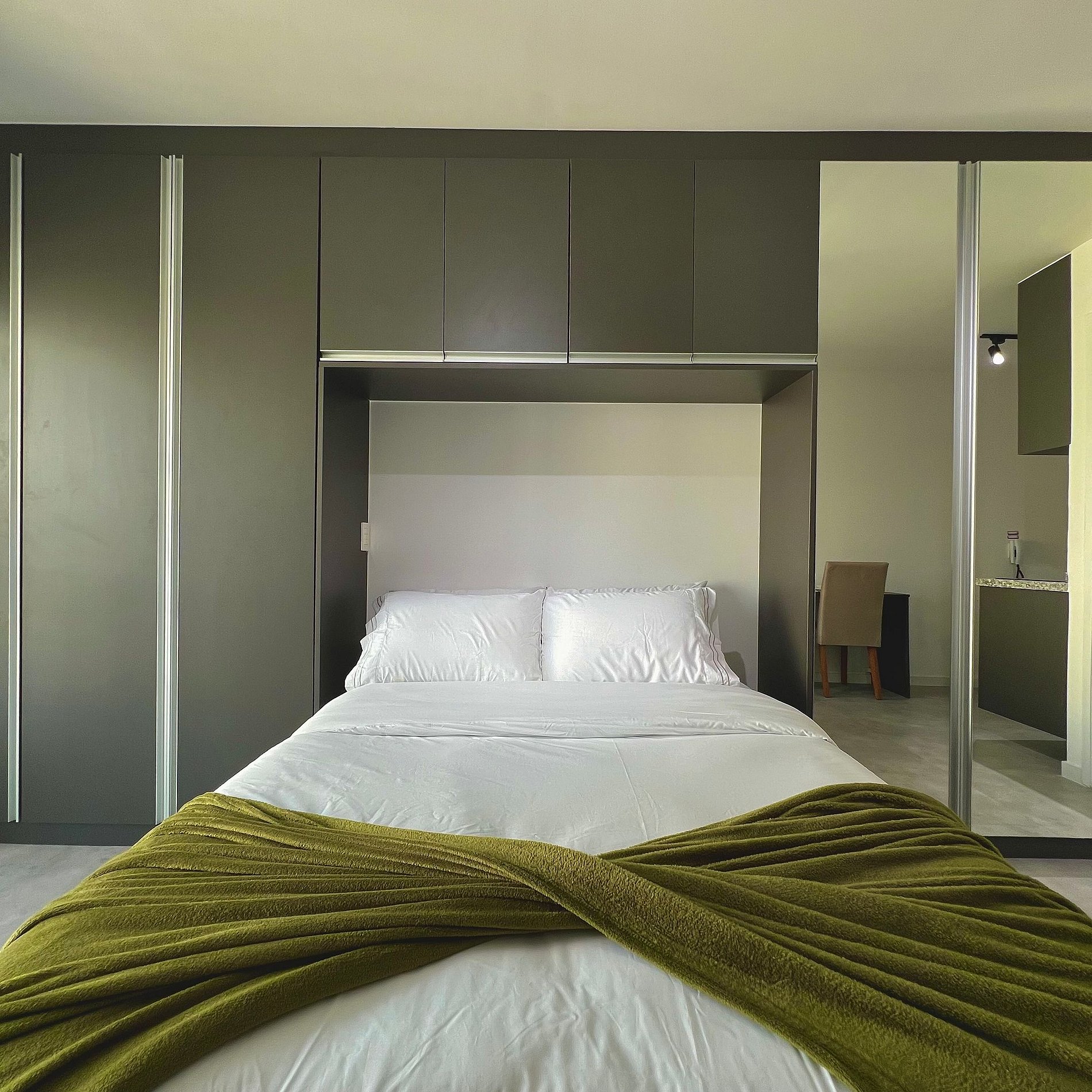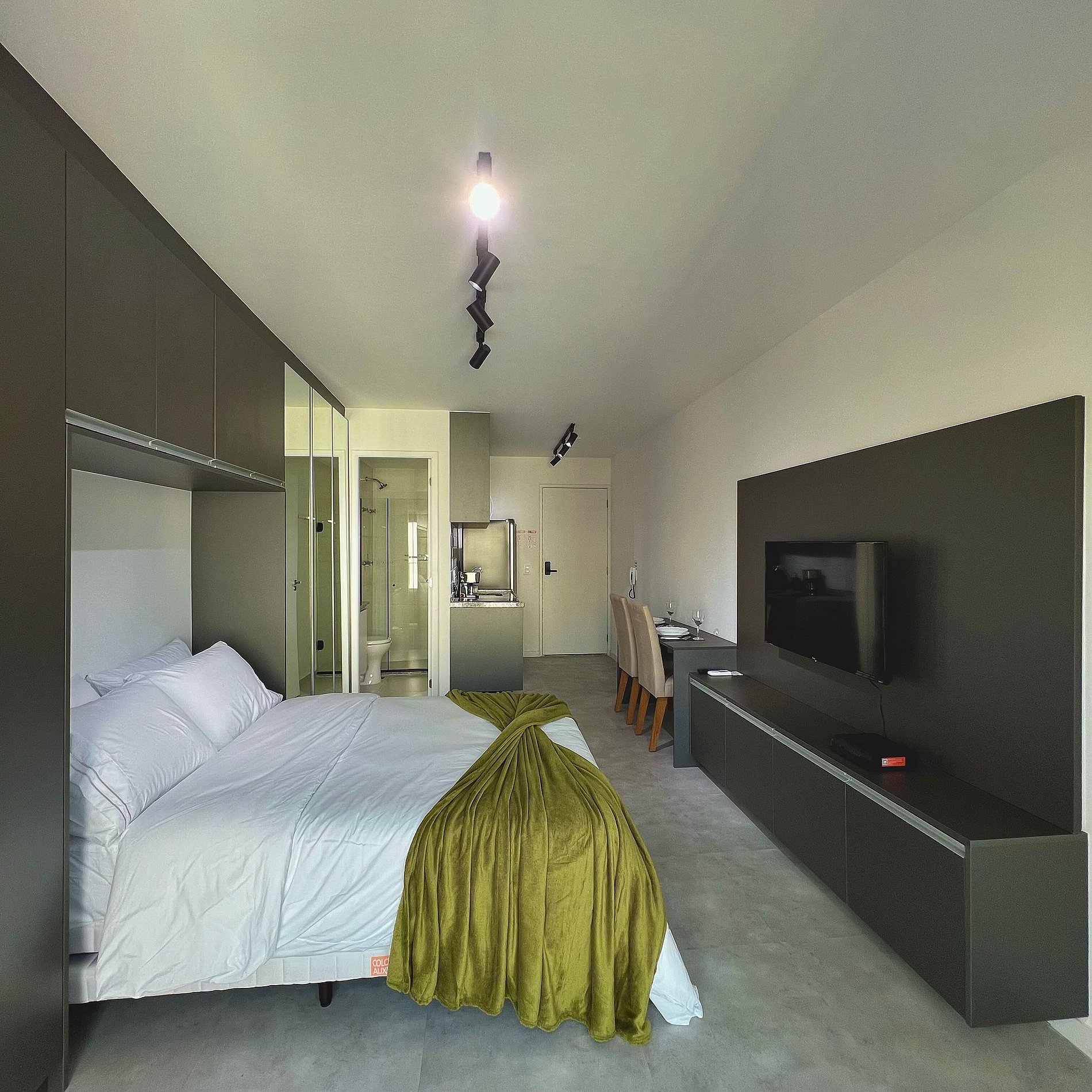 Aqui cada detalhe foi pensado para tornar sua estadia única: cozinha completa com fogão, micro-ondas, cafeteira, geladeira, quarto com cama queen, blackout, enxoval completo, travesseiros e mantas/edredom para aqueles dias mais frios, sacada, wi-fi, ar-condicionado, TV Smart e um espaço para home office. O grande destaque é a sacada fechada que garante iluminação natural e controle de ruído, perfeita para trabalhar, relaxar, ler um livro ou simplesmente apreciar o por do sol.