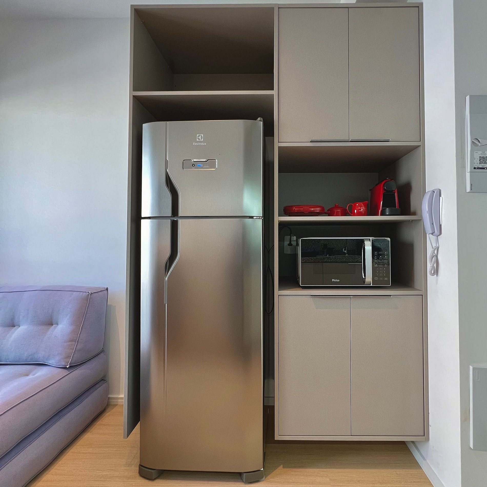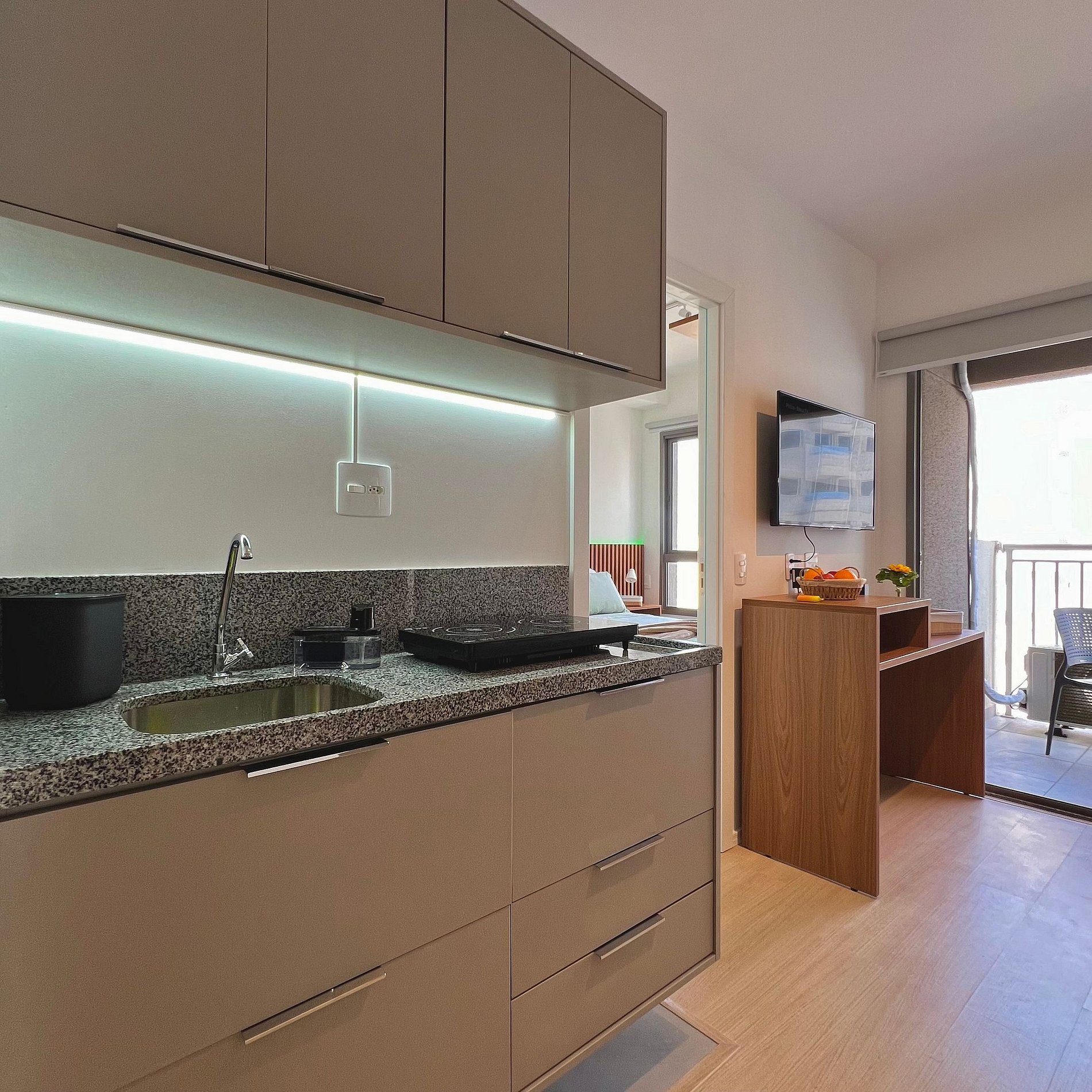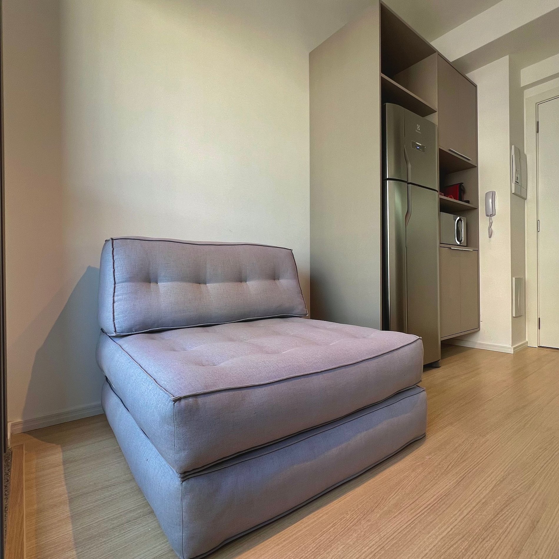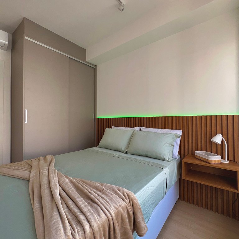 Aqui cada detalhe foi pensado para tornar sua estadia única: cozinha completa com fogão, micro-ondas, cafeteira, geladeira. O quarto com cama queen, sofá cama, blackout, enxoval completo, travesseiros e mantas/edredom para aqueles dias mais frios, wi-fi, ar-condicionado, TV Smart e um espaço para home office. O grande destaque é a varanda que garante iluminação natural, perfeita para tomar um café da manhã, ler um livro ou apreciar momentos tranquilos.