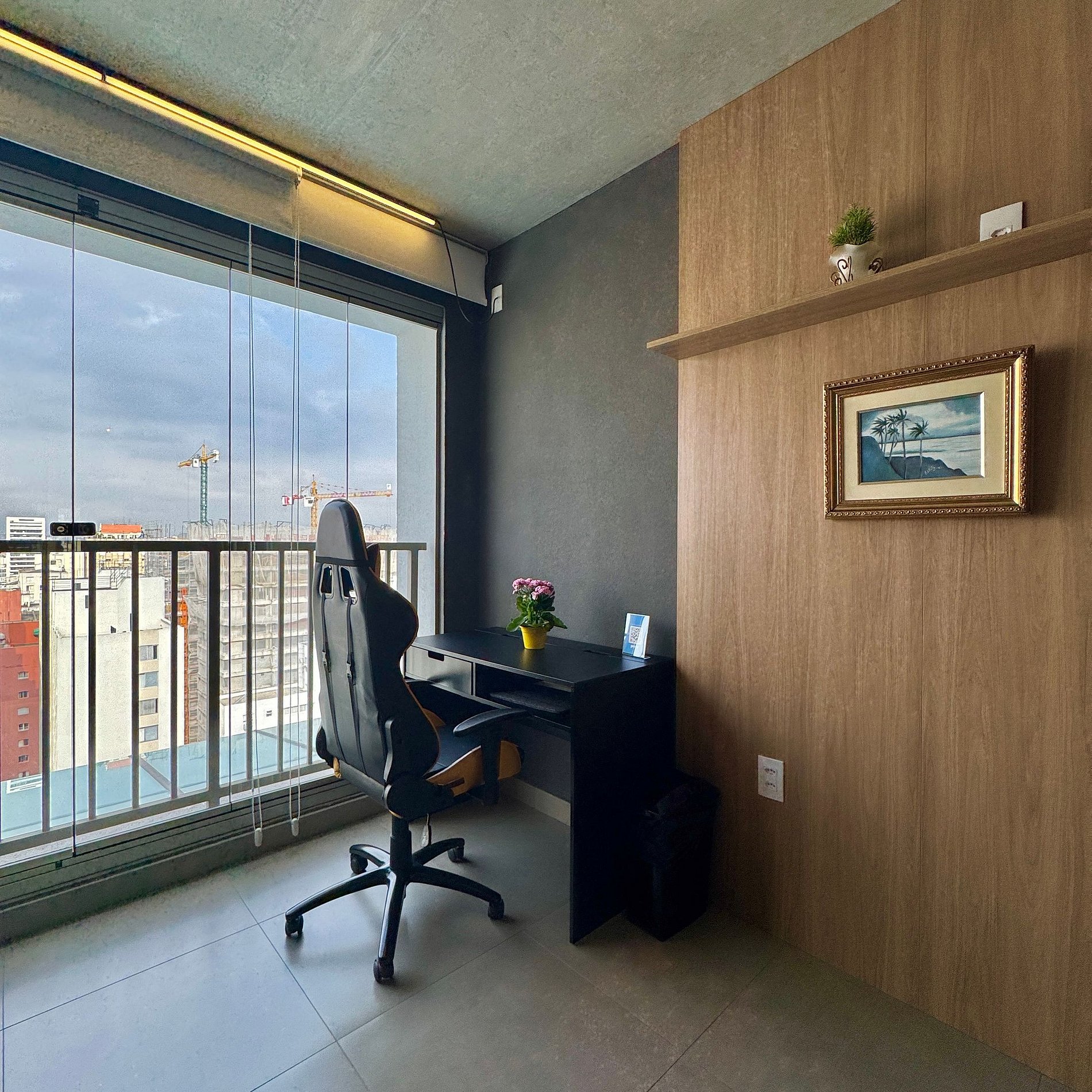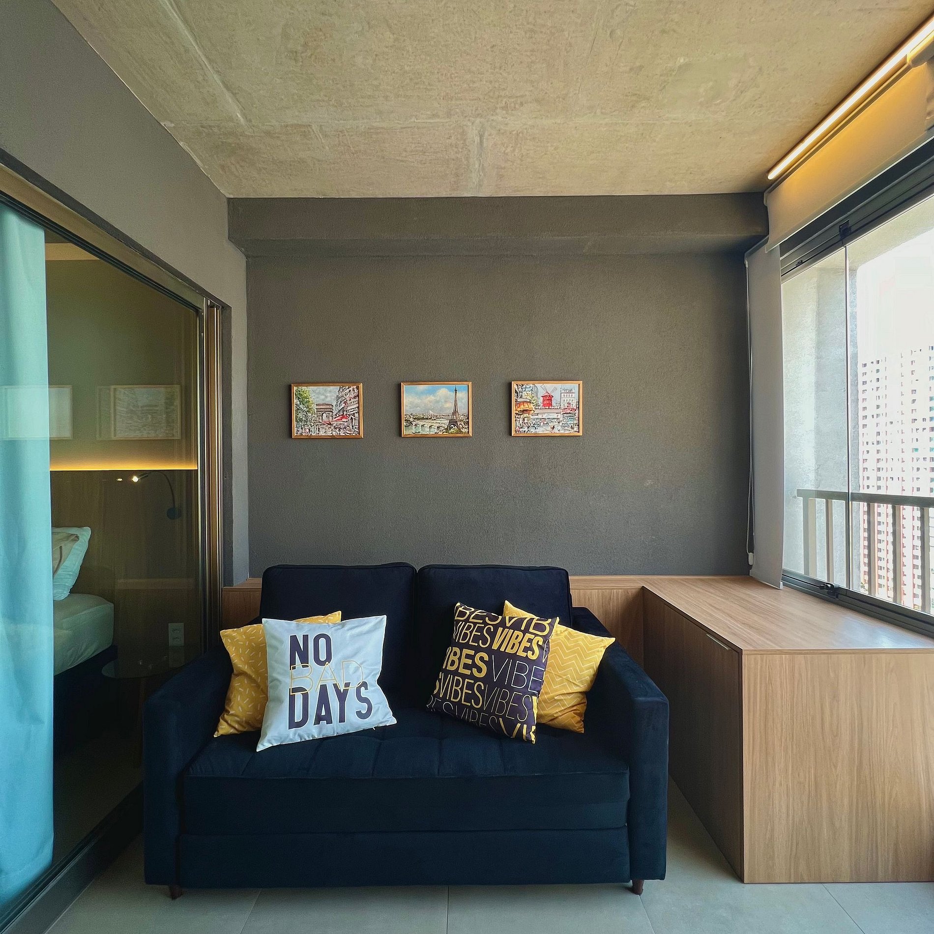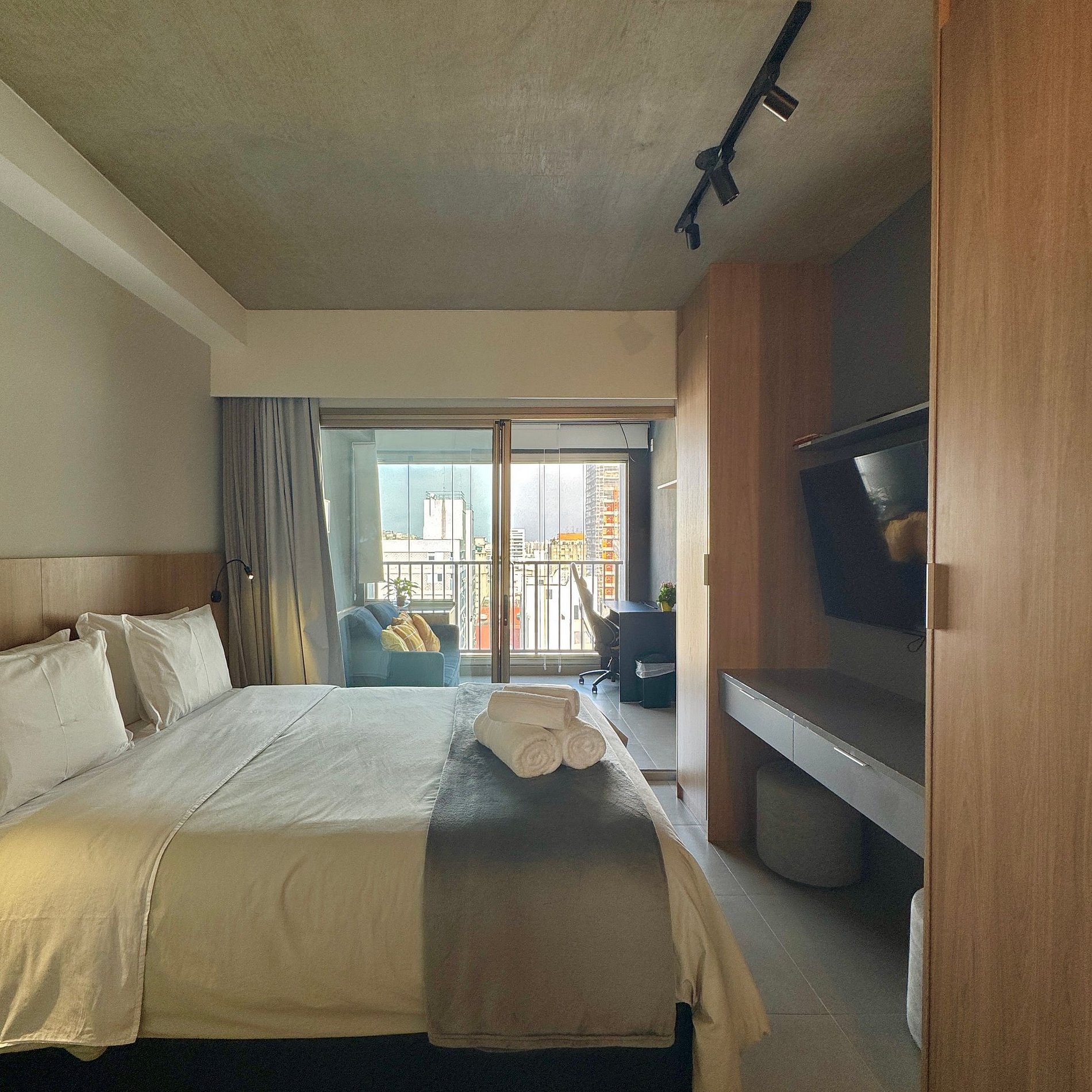 Aqui cada detalhe foi pensado para tornar sua estadia única: cozinha completa com fogão, micro-ondas, cafeteira, geladeira, airfrayer, duas cafeteiras, mixer, sanduicheira, quarto com cama queen, sofá cama, blackout, enxoval completo, travesseiros, mantas/edredom para aqueles dias mais frios, wi-fi, ar-condicionado, TV Smart e um espaço para home office com cadeira especial. O grande destaque do estúdio é a sacada integrada que garante espaço e luminosidade natural com vista marcante para o bairro dos Jardins, perfeito para quem vem a pesseio ou trabalho.