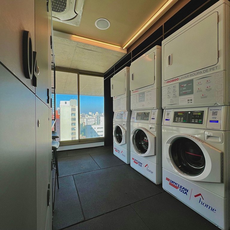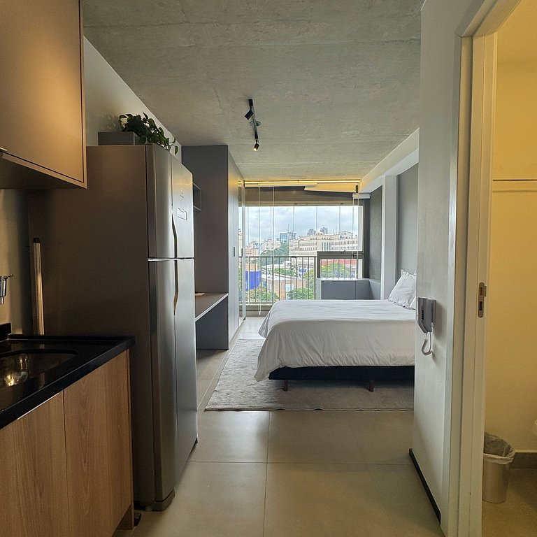 Aqui cada detalhe foi pensado para tornar sua estadia única: cozinha completa com fogão, micro-ondas, cafeteira, geladeira, quarto com cama casal, blackout, enxoval completo, travesseiros, mantas/edredom para aqueles dias mais frios, wi-fi, ar-condicionado, TV Smart e um espaço para home office. O grande destaque do estúdio é a sacada integrada que garante espaço e luminosidade natural com vista marcante para o bairro dos Jardins.