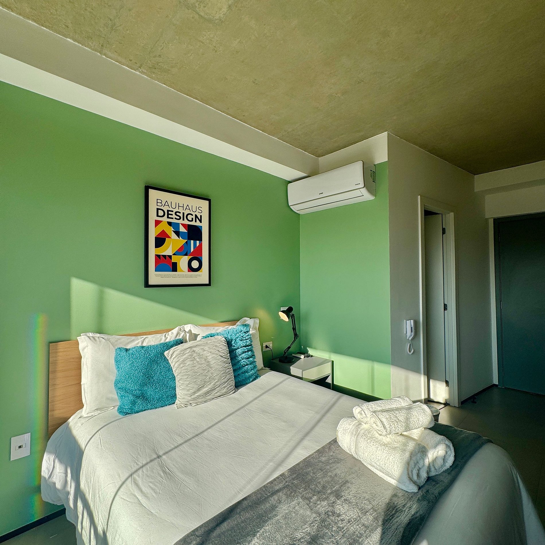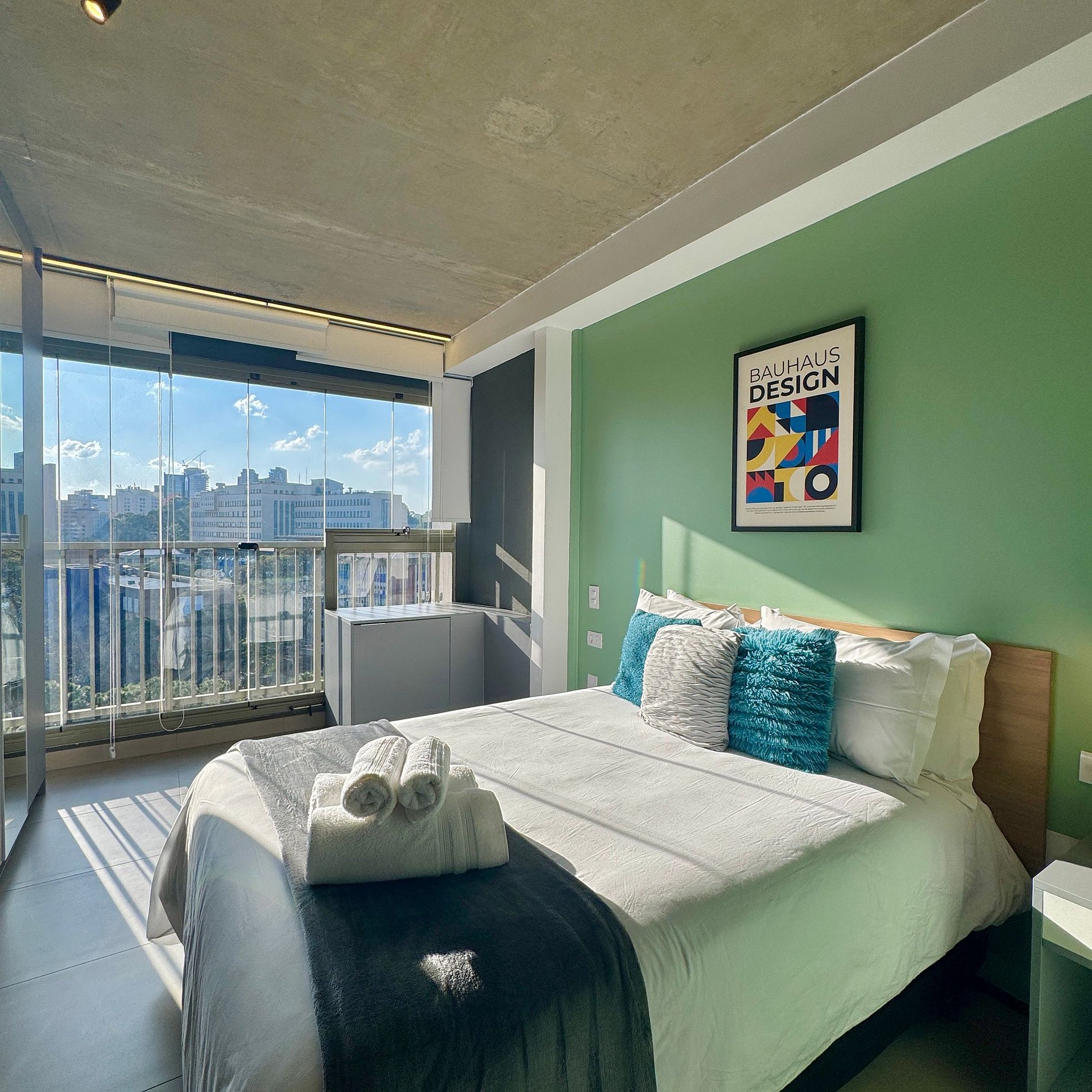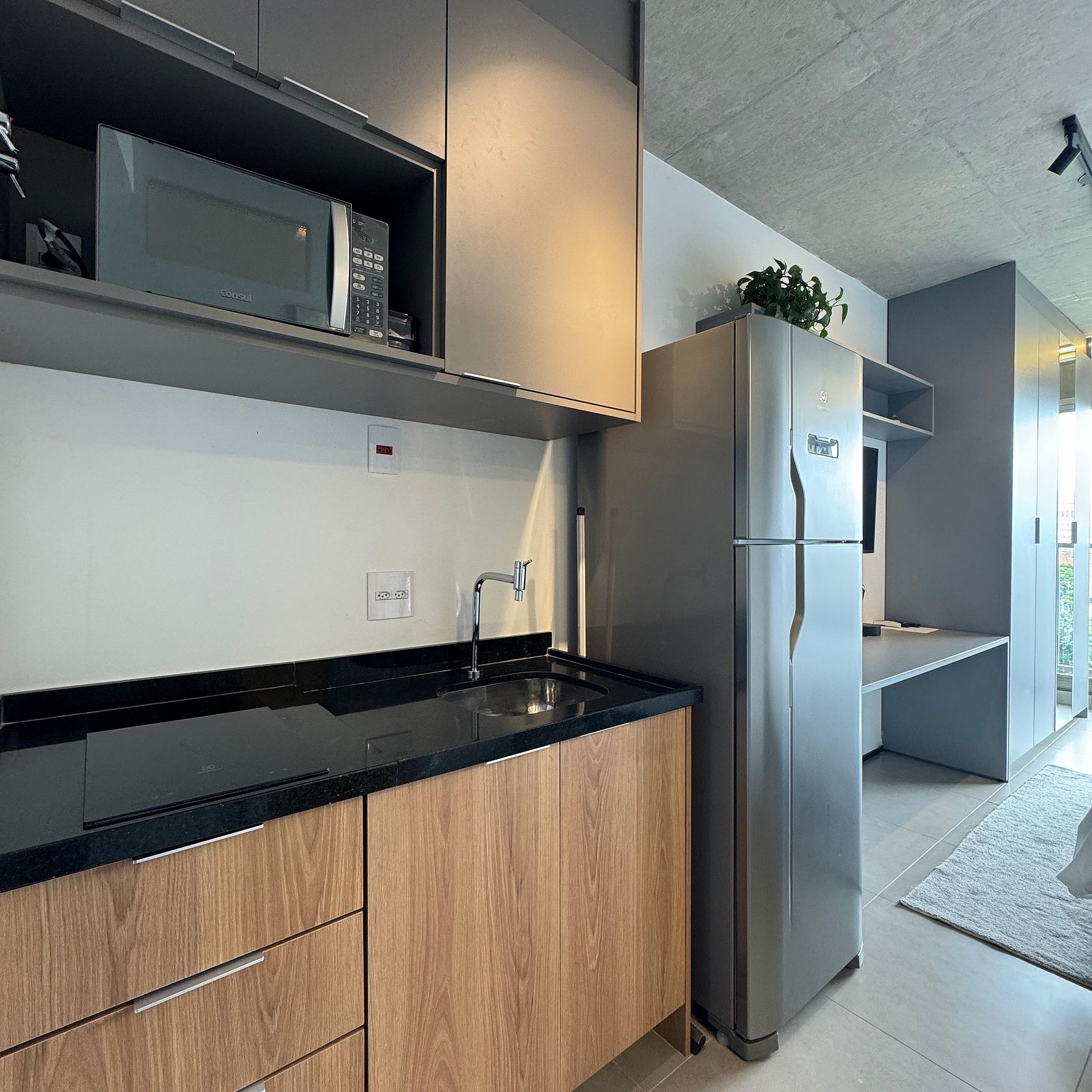 Aqui cada detalhe foi pensado para tornar sua estadia única: cozinha completa com fogão, micro-ondas, cafeteira, geladeira, quarto com cama casal, blackout, enxoval completo, travesseiros, mantas/edredom para aqueles dias mais frios, wi-fi, ar-condicionado, TV Smart e um espaço para home office. O grande destaque do estúdio é a sacada integrada que garante espaço e luminosidade natural com vista marcante para o bairro dos Jardins.