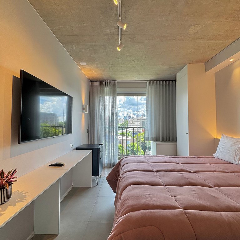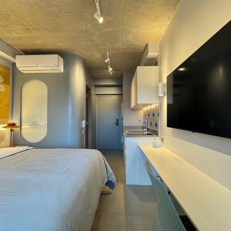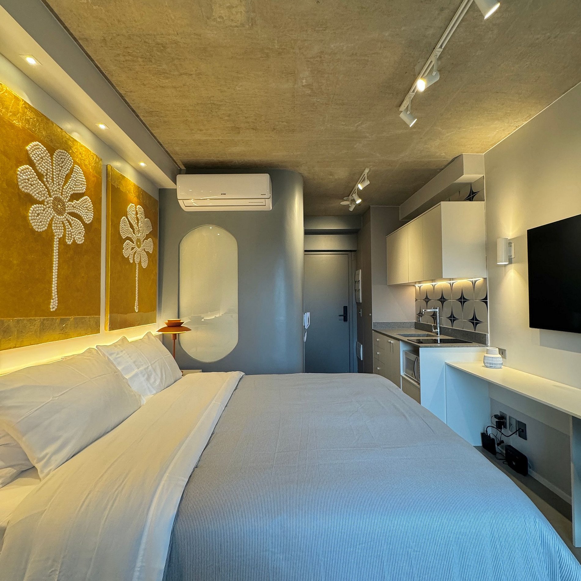 Aqui cada detalhe foi pensado para tornar sua estadia única: cozinha completa com fogão, micro-ondas, cafeteira, geladeira, quarto com cama casal, blackout, enxoval completo, travesseiros, mantas/edredom para aqueles dias mais frios, wi-fi, ar-condicionado, TV Smart e um espaço para home office. O grande destaque do estúdio é sua decoração única com parede curva, revestimentos decorados que dão o charme para o studio e uma sacada integrada que garante espaço e luminosidade natural com vista marcante para o bairro dos Jardins.