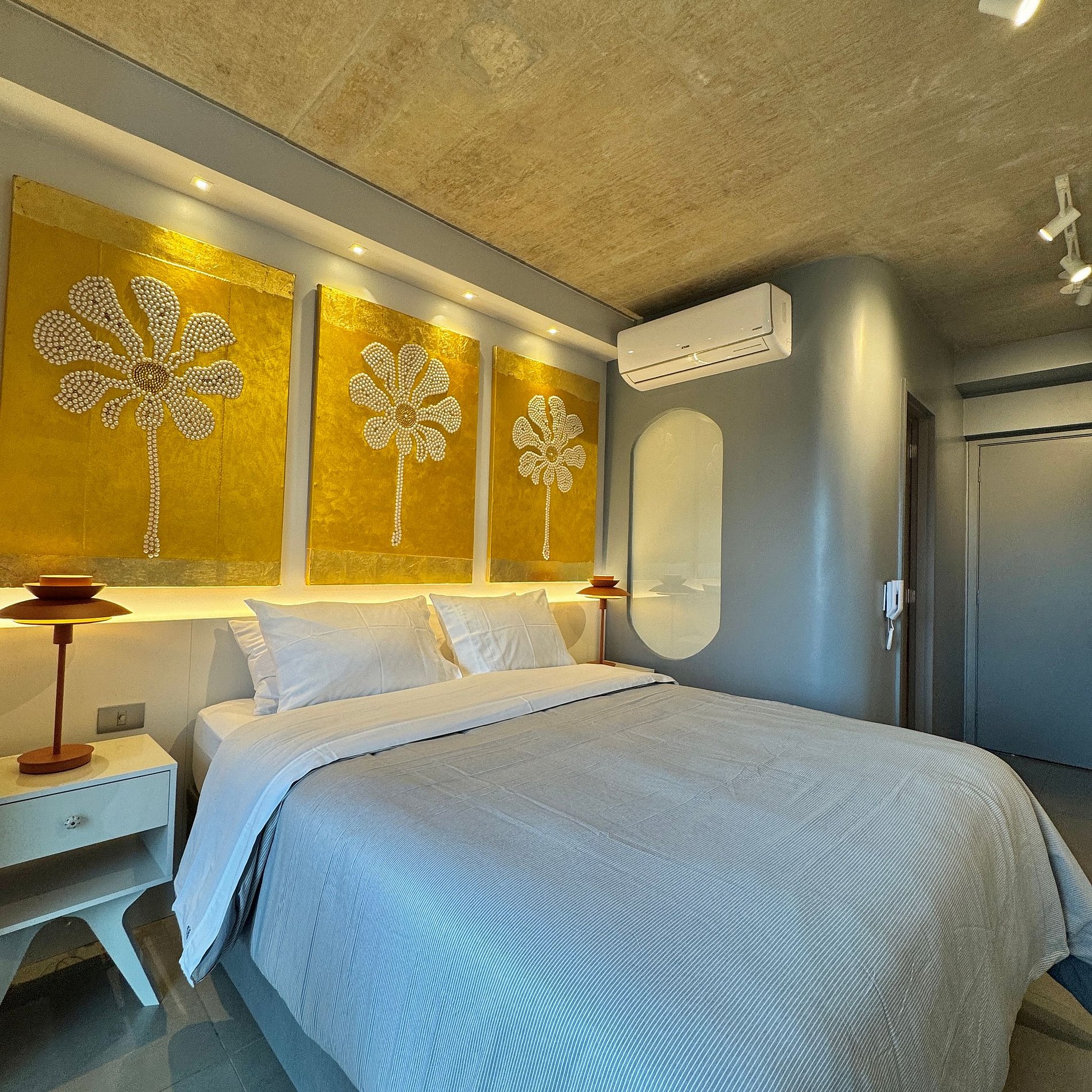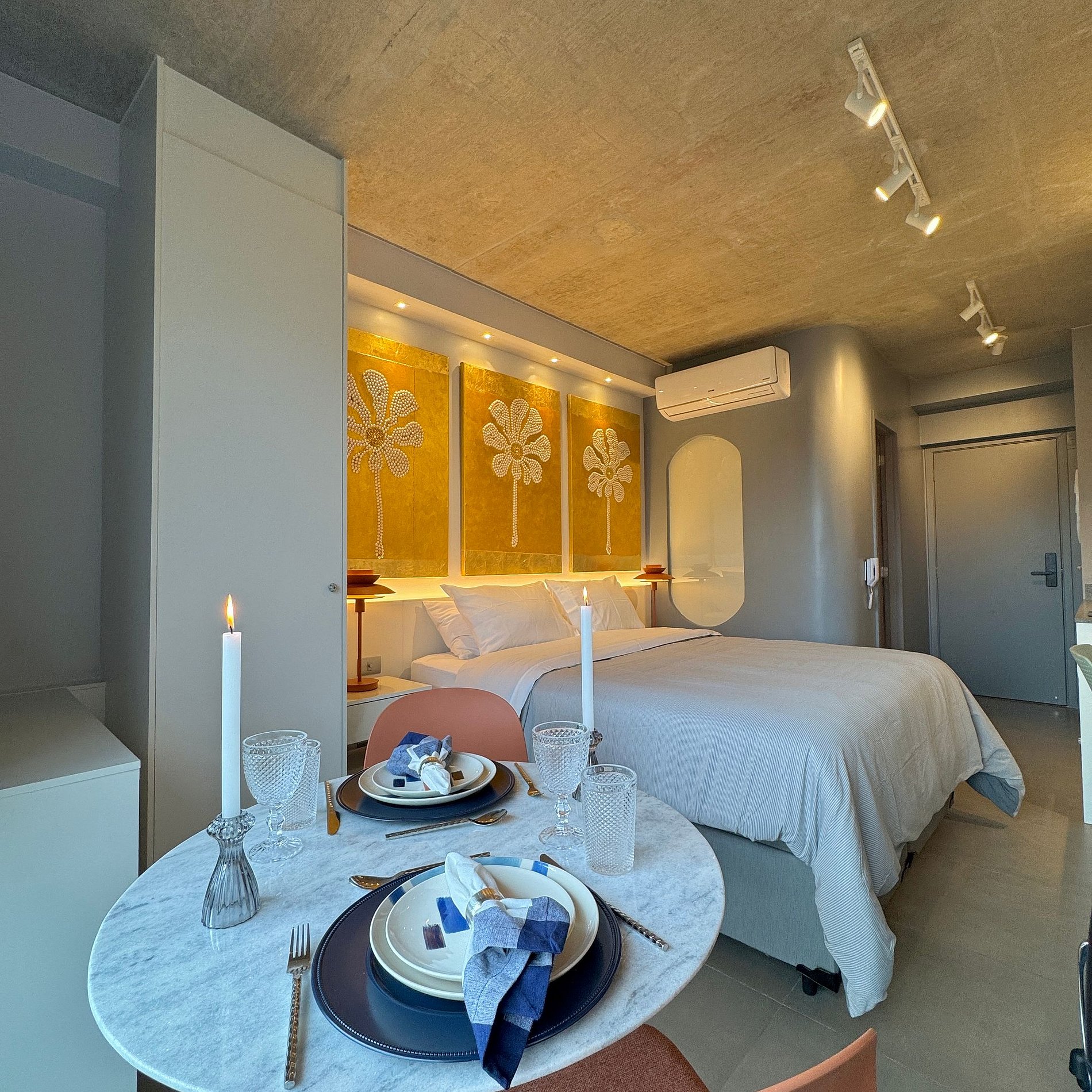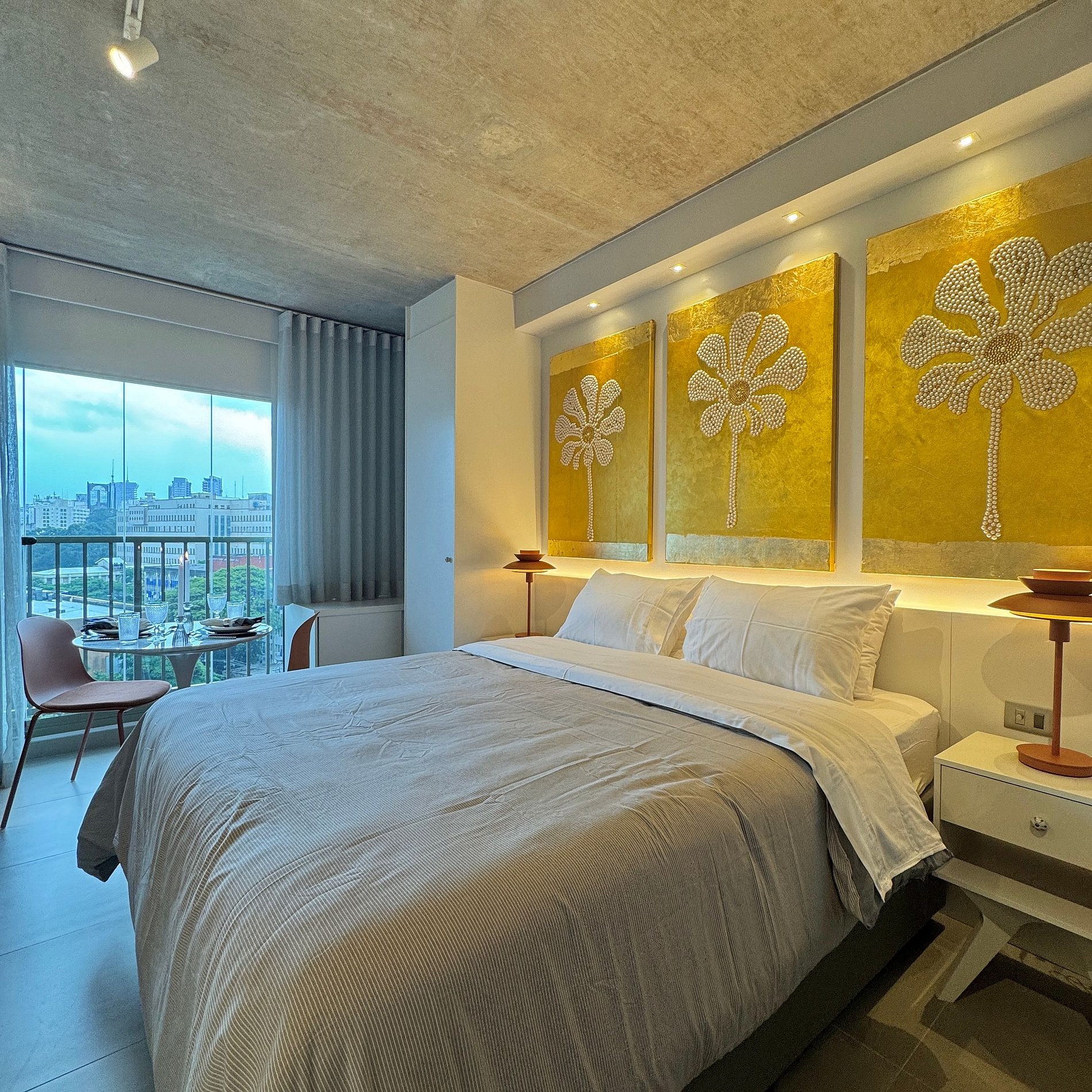 Aqui cada detalhe foi pensado para tornar sua estadia única: cozinha completa com fogão, micro-ondas, cafeteira, geladeira, quarto com cama casal, blackout, enxoval completo, travesseiros, mantas/edredom para aqueles dias mais frios, wi-fi, ar-condicionado, TV Smart e um espaço para home office. O grande destaque do estúdio é sua decoração única com parede curva, revestimentos decorados que dão o charme para o studio e uma sacada integrada que garante espaço e luminosidade natural com vista marcante para o bairro dos Jardins.