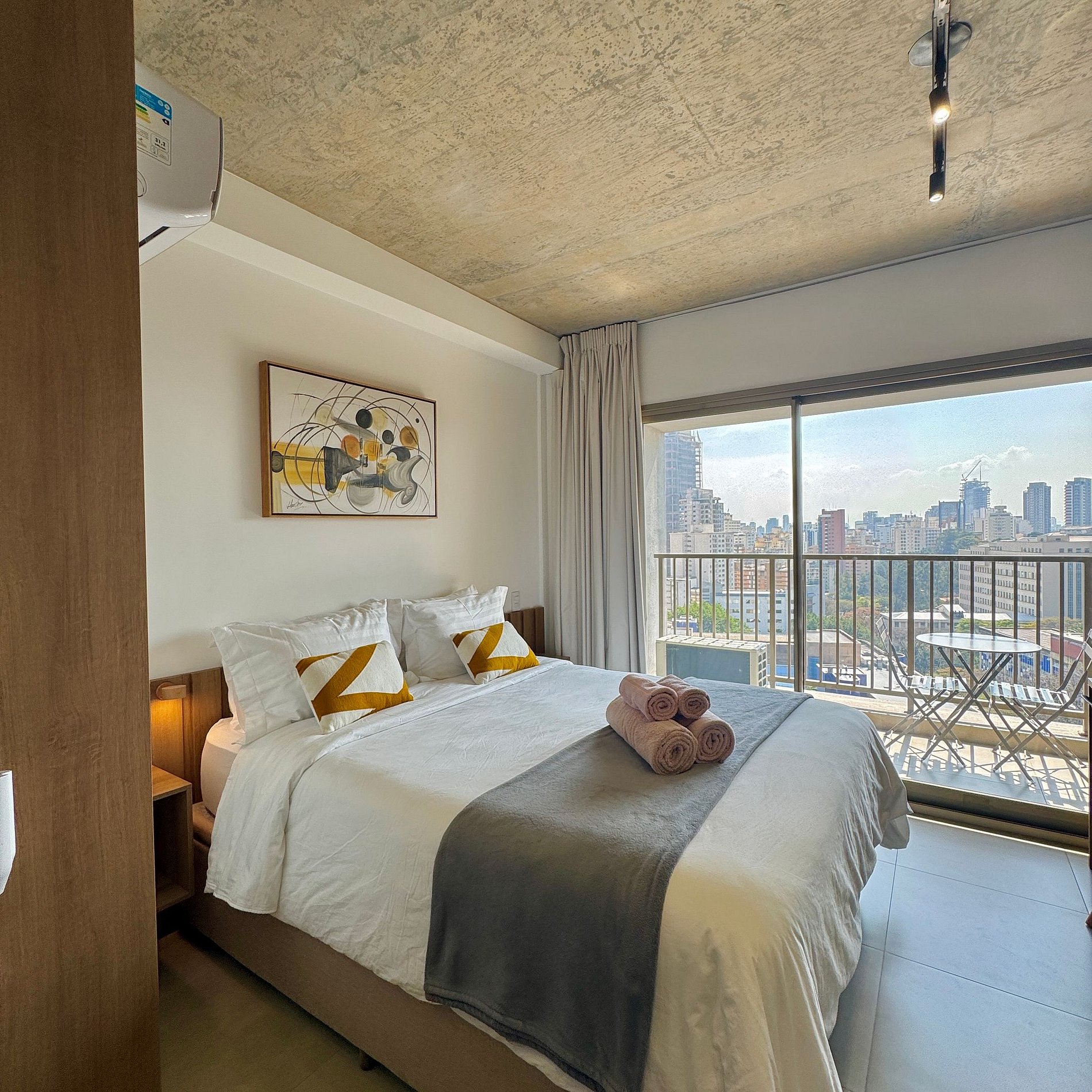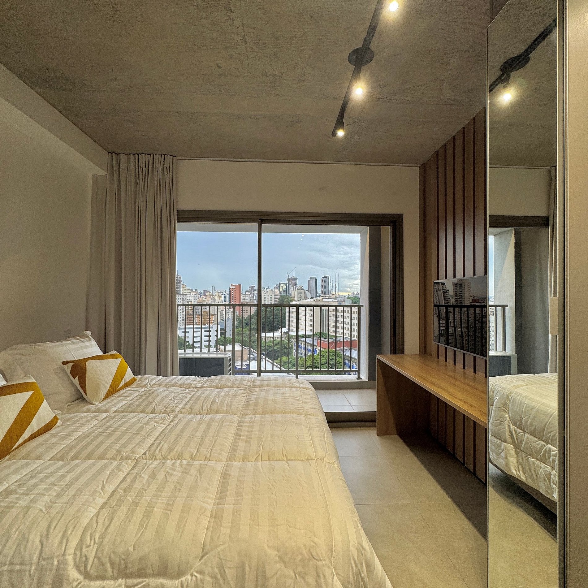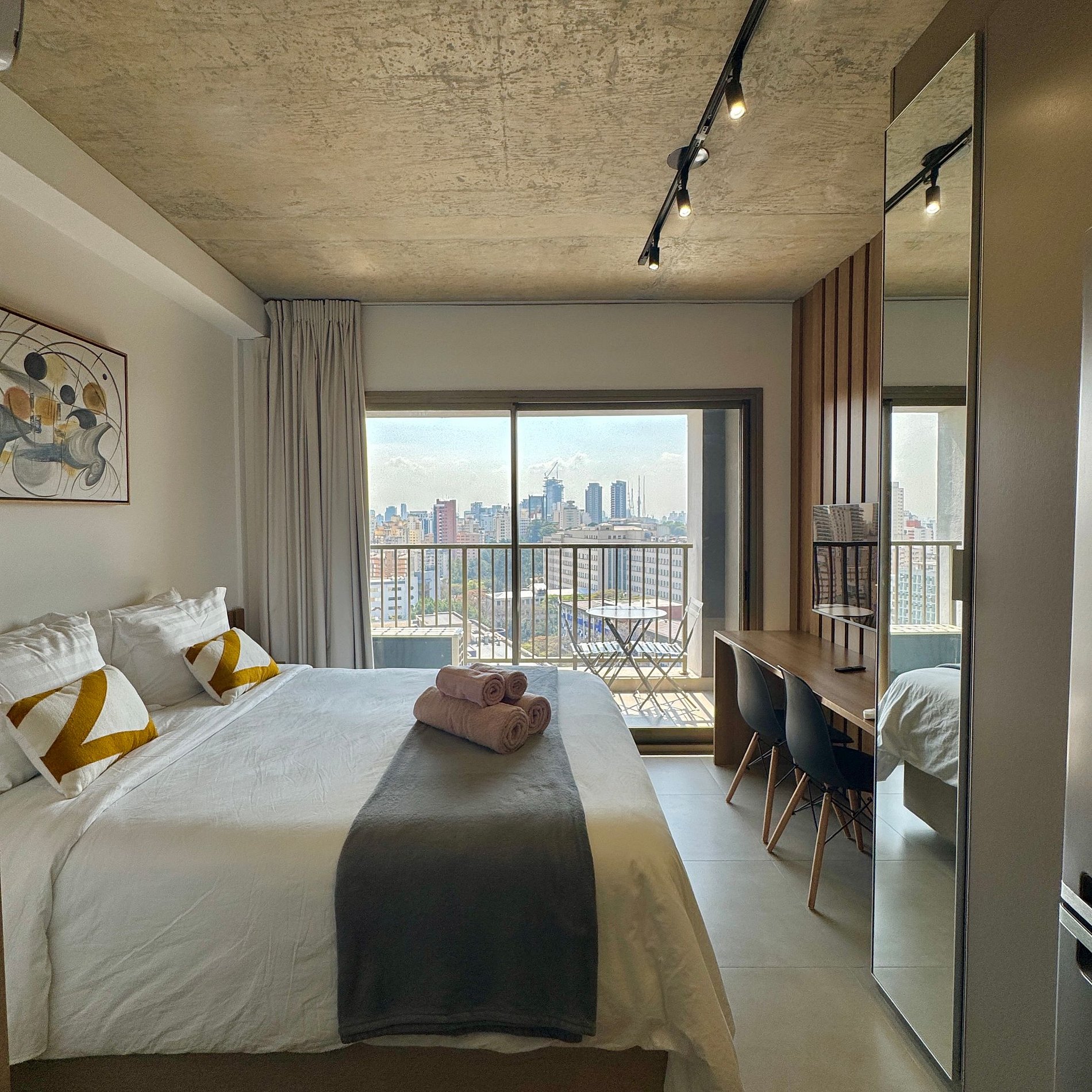 Aqui cada detalhe foi pensado para tornar sua estadia única: cozinha completa com fogão, micro-ondas, cafeteira, geladeira, quarto com cama queen, blackout, enxoval completo, travesseiros, mantas/edredom para aqueles dias mais frios, sacada, wi-fi, ar-condicionado, TV Smart e um espaço para home office. O grande destaque do estúdio é uma sacada ampla com vista marcante para o bairro dos Jardins, perfeita para trabalhar, relaxar, ler um livro ou simplesmente apreciar momentos tranquilos.