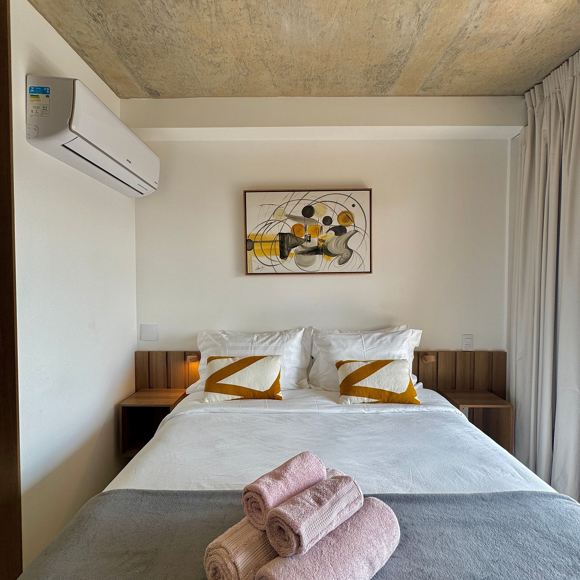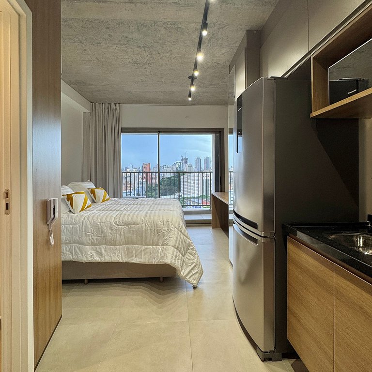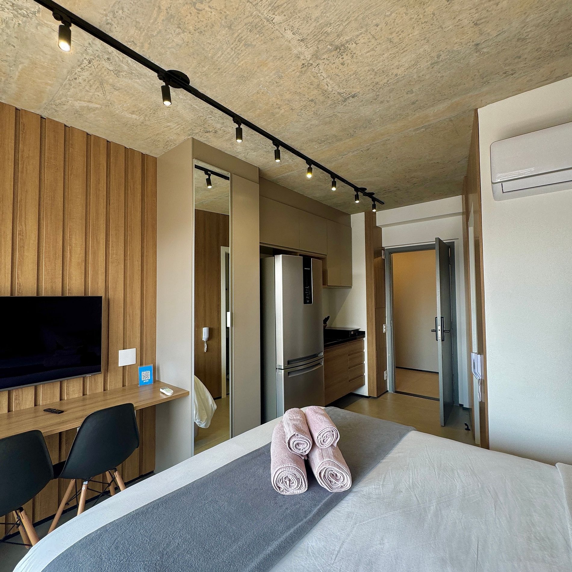 Aqui cada detalhe foi pensado para tornar sua estadia única: cozinha completa com fogão, micro-ondas, cafeteira, geladeira, quarto com cama queen, blackout, enxoval completo, travesseiros, mantas/edredom para aqueles dias mais frios, sacada, wi-fi, ar-condicionado, TV Smart e um espaço para home office. O grande destaque do estúdio é uma sacada ampla com vista marcante para o bairro dos Jardins, perfeita para trabalhar, relaxar, ler um livro ou simplesmente apreciar momentos tranquilos.