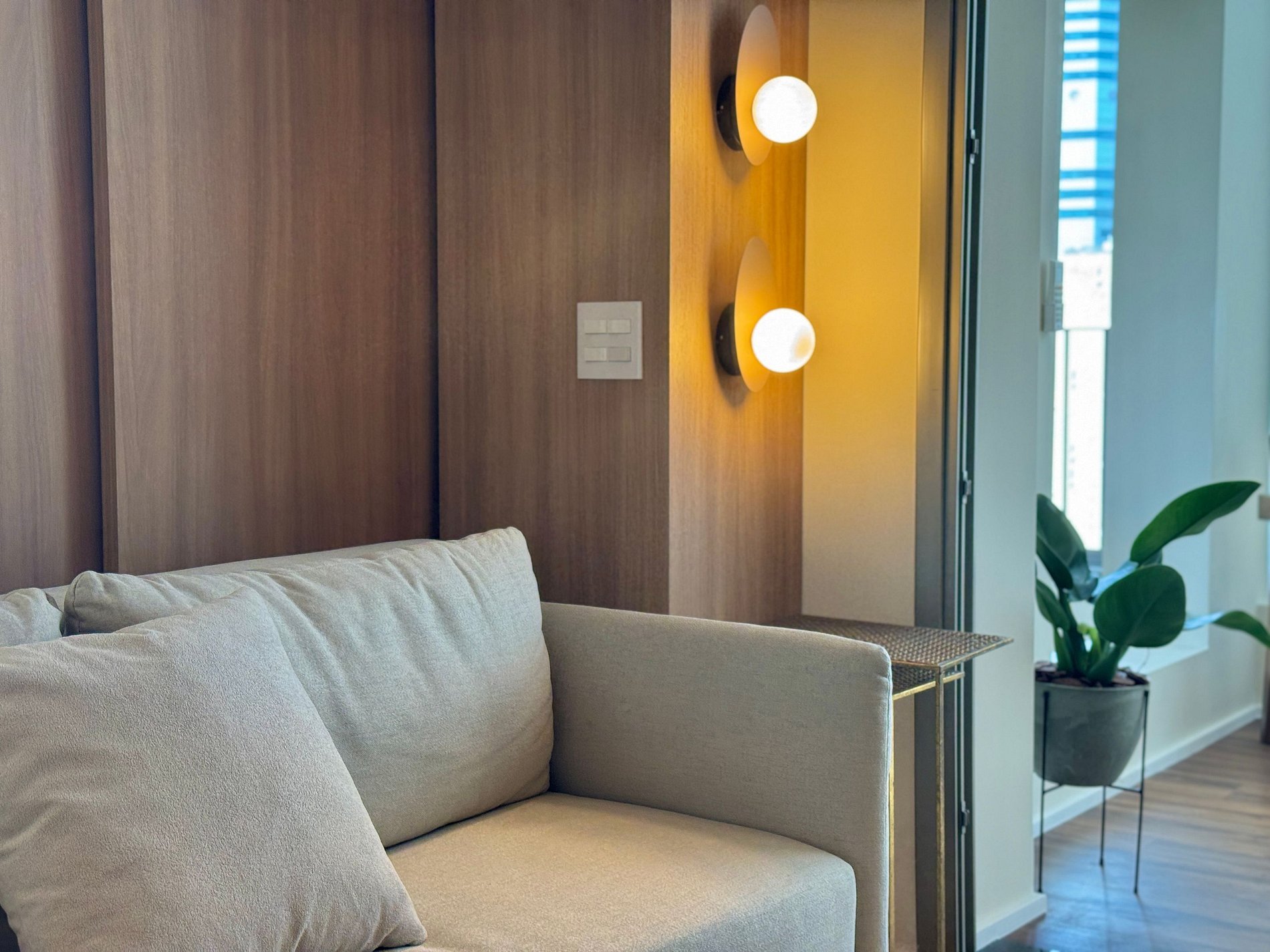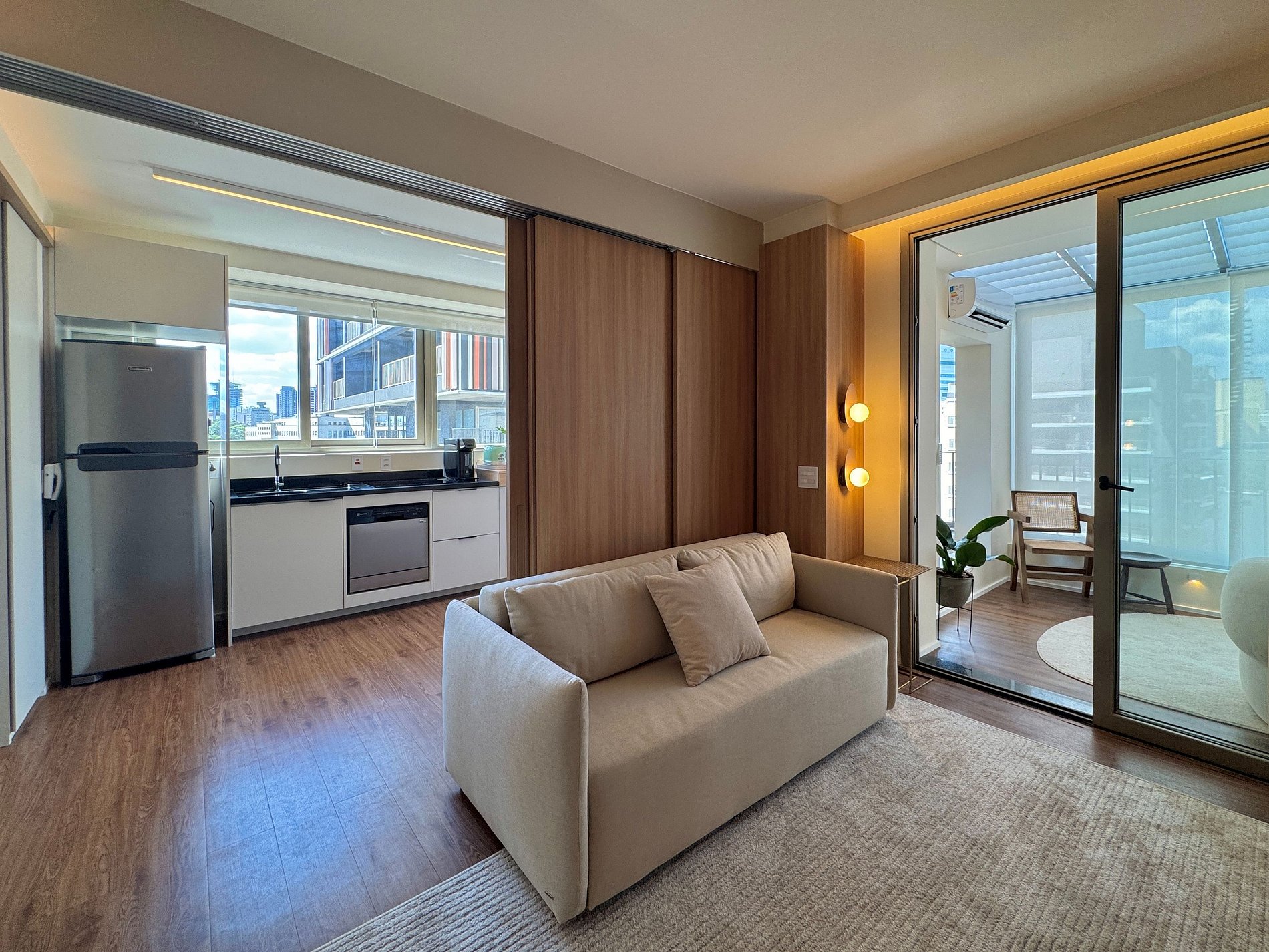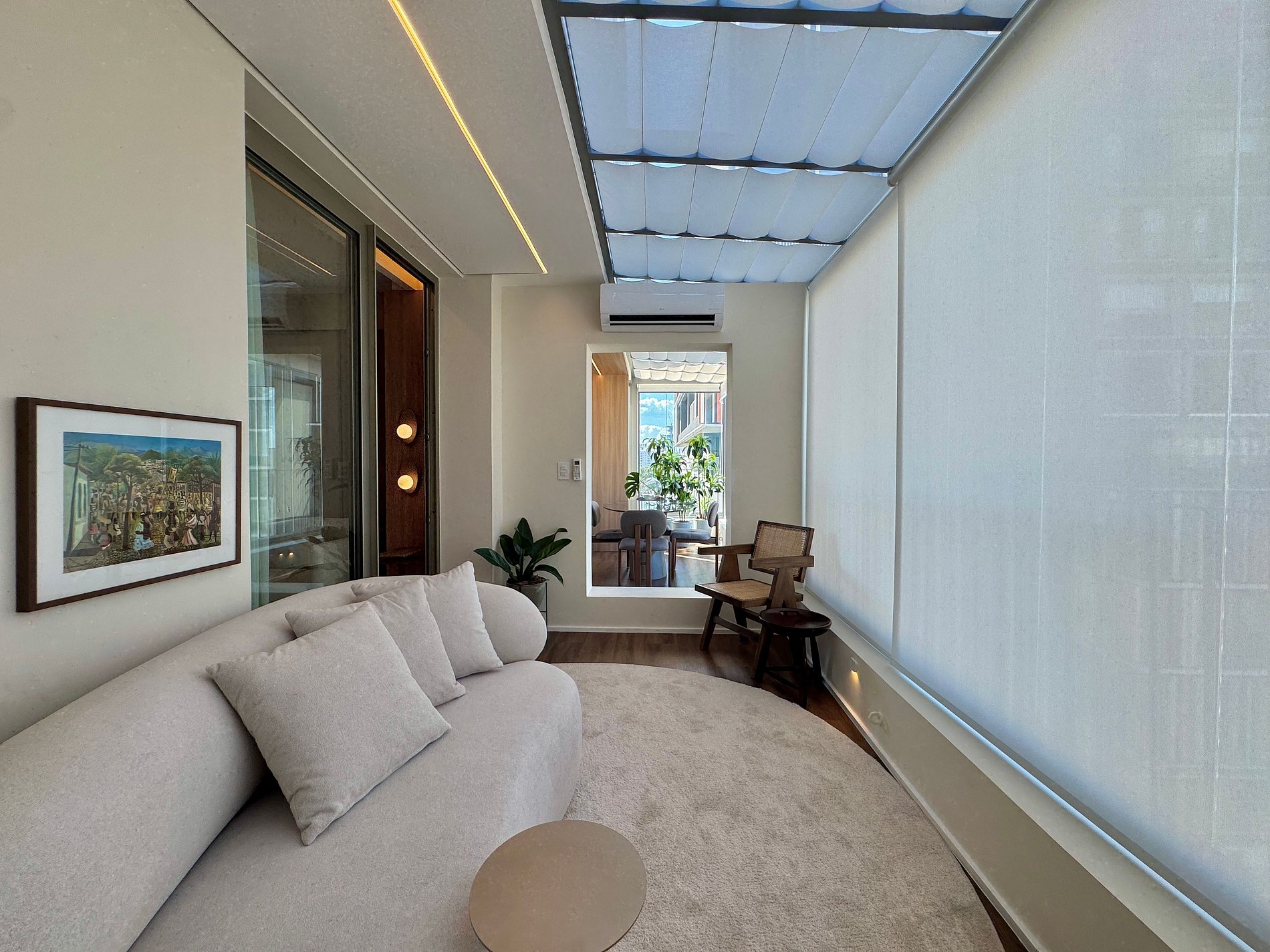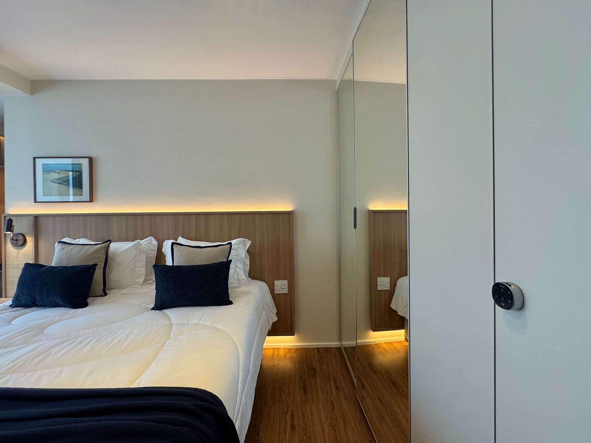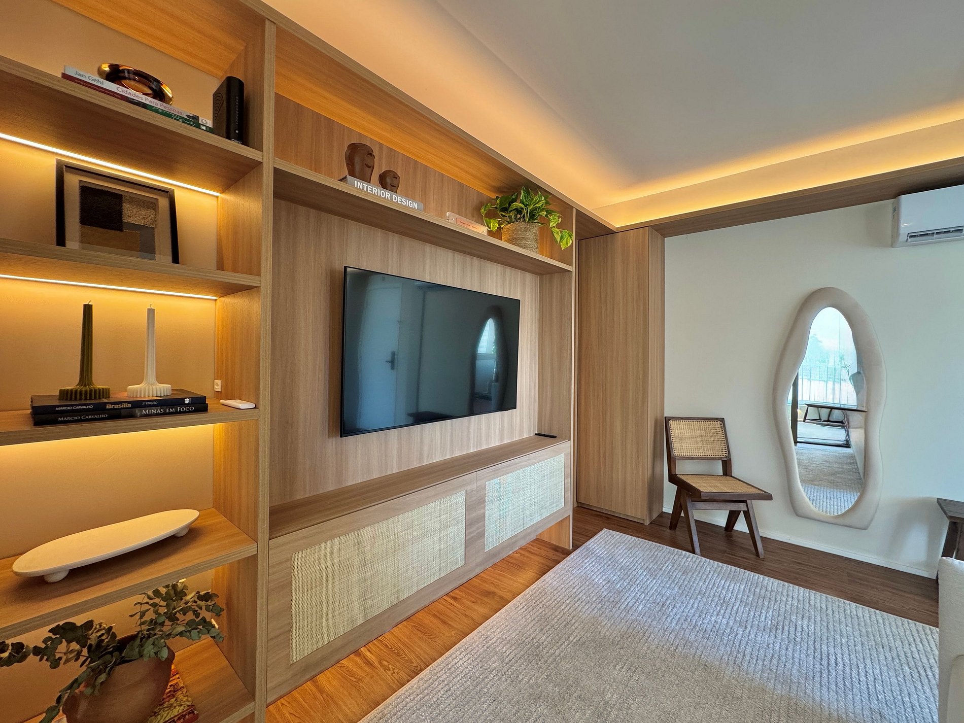 • Sala híbrida com porta de correr que permite total privacidade ao ambiente, transformando-o em um segundo quarto aconchegante, equipado com um sofá-cama de alta qualidade.