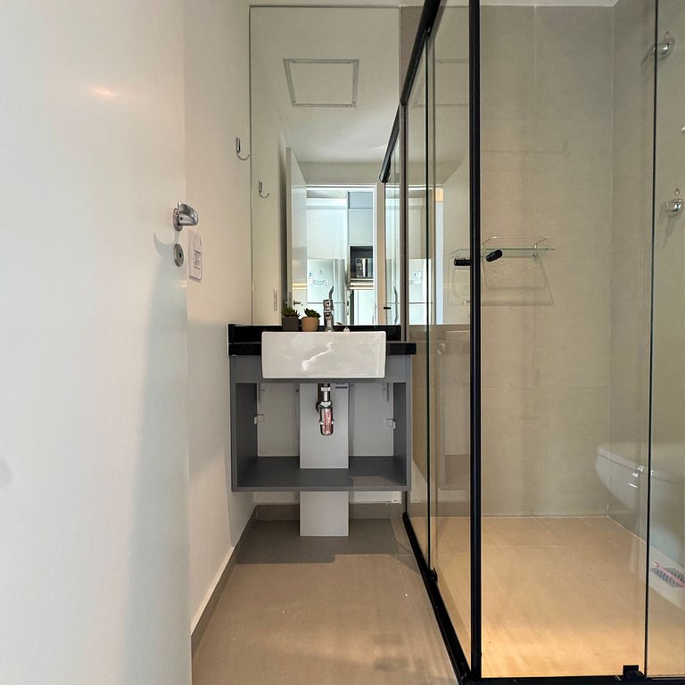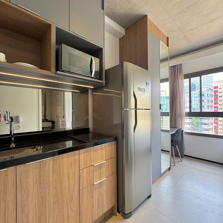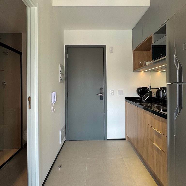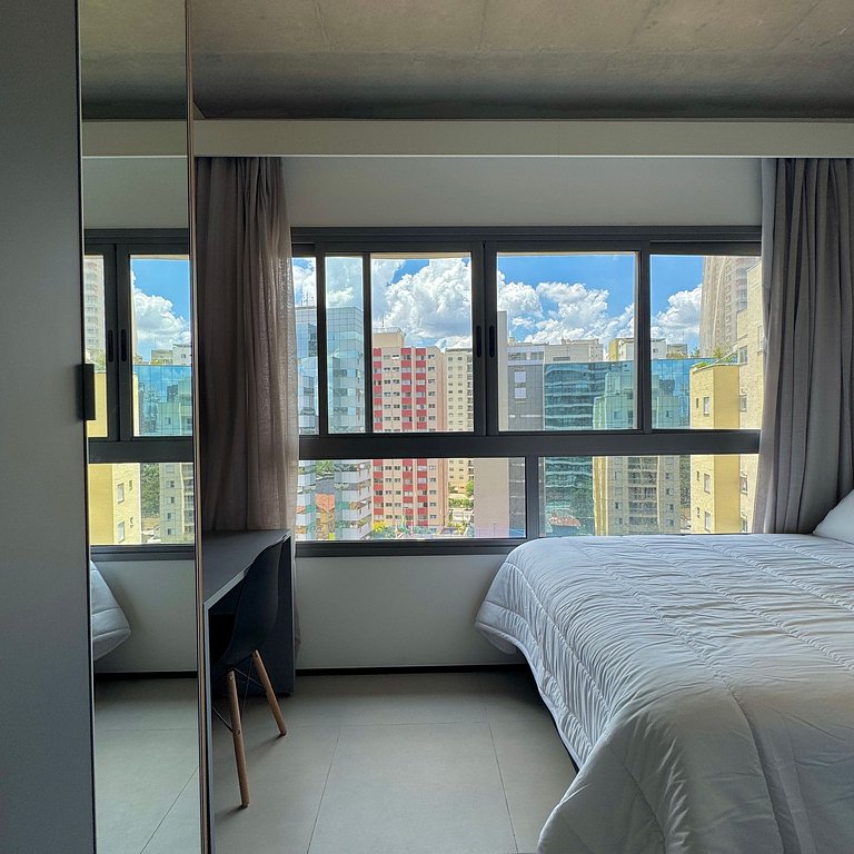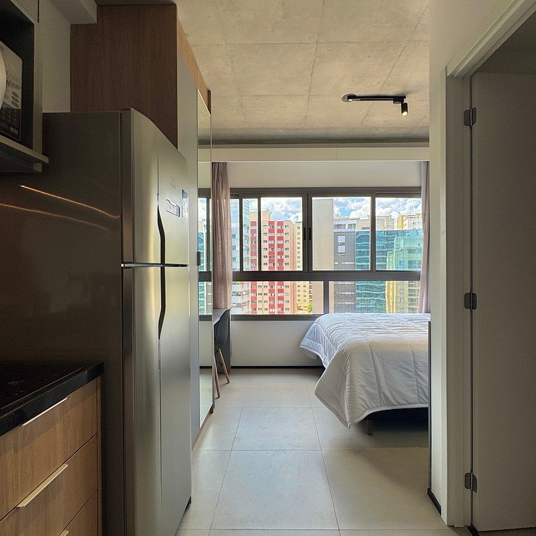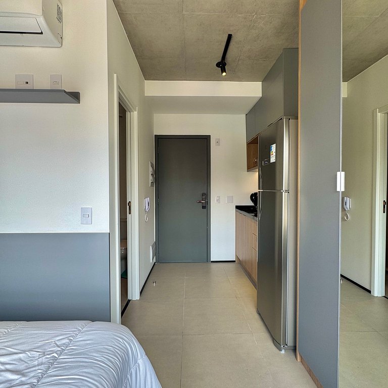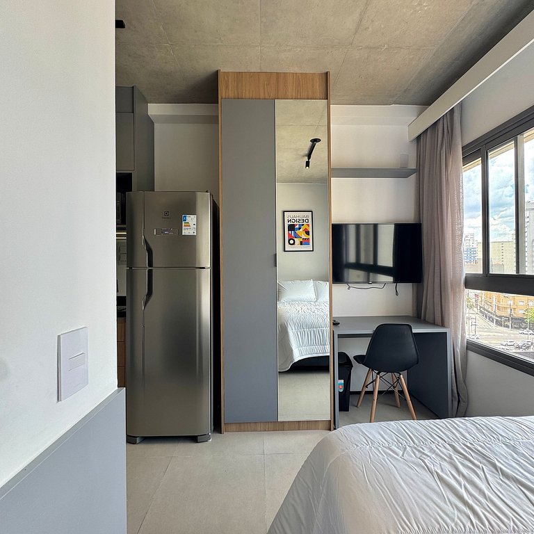 Aqui cada detalhe foi pensado para tornar sua estadia única: cozinha funcional, quarto com cama casal atendendo até 2 pessoas, blackout, wi-fi, ar-condicionado, TV Smart e um espaço para home office. O estúdio é idêntico às fotos e perfeito para quem vem a trabalho ou passeio, devido à excelente localização e facilidade de locomoção.