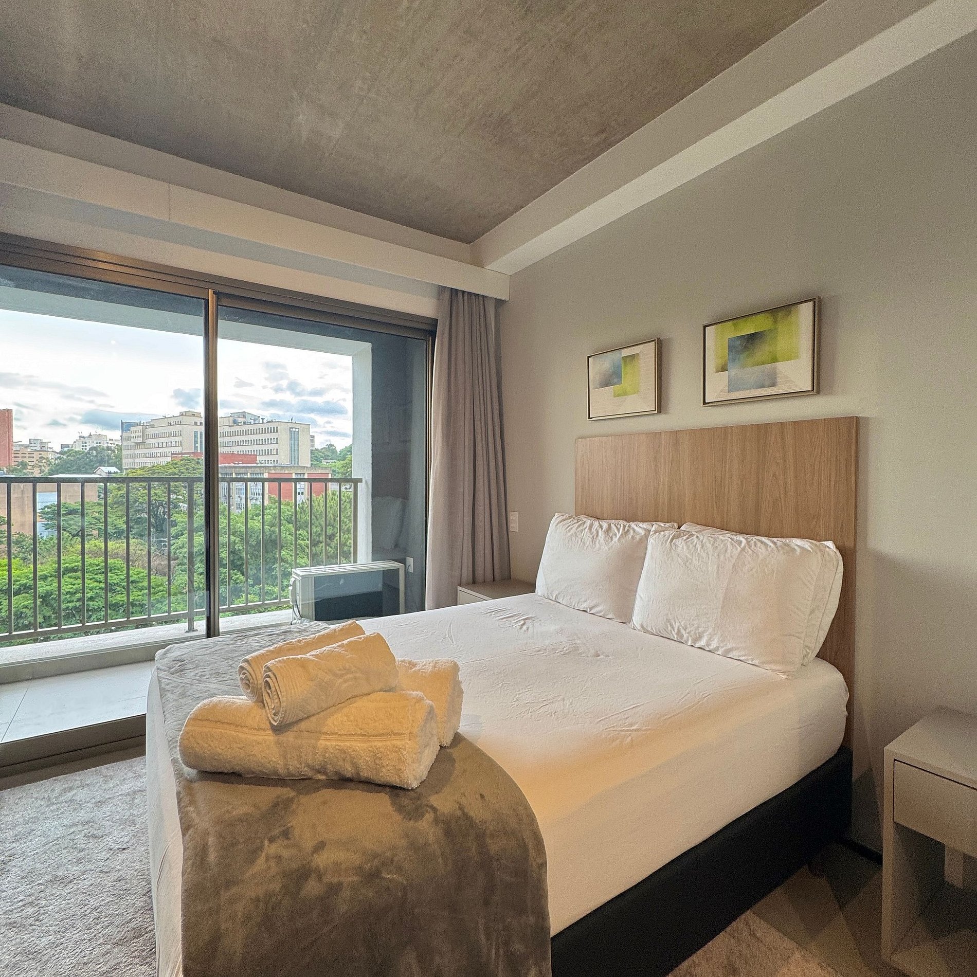Aqui cada detalhe foi pensado para tornar sua estadia única: cozinha completa com fogão, micro-ondas, cafeteira, geladeira, quarto com cama casal, blackout, enxoval completo, travesseiros, mantas/edredom para aqueles dias mais frios, sacada, wi-fi, ar-condicionado, TV Smart e um espaço para home office. O grande destaque do estúdio é a sacada ampla com vista marcante para o bairro dos Jardins, perfeita para trabalhar, relaxar, ler um livro ou simplesmente apreciar momentos tranquilos.