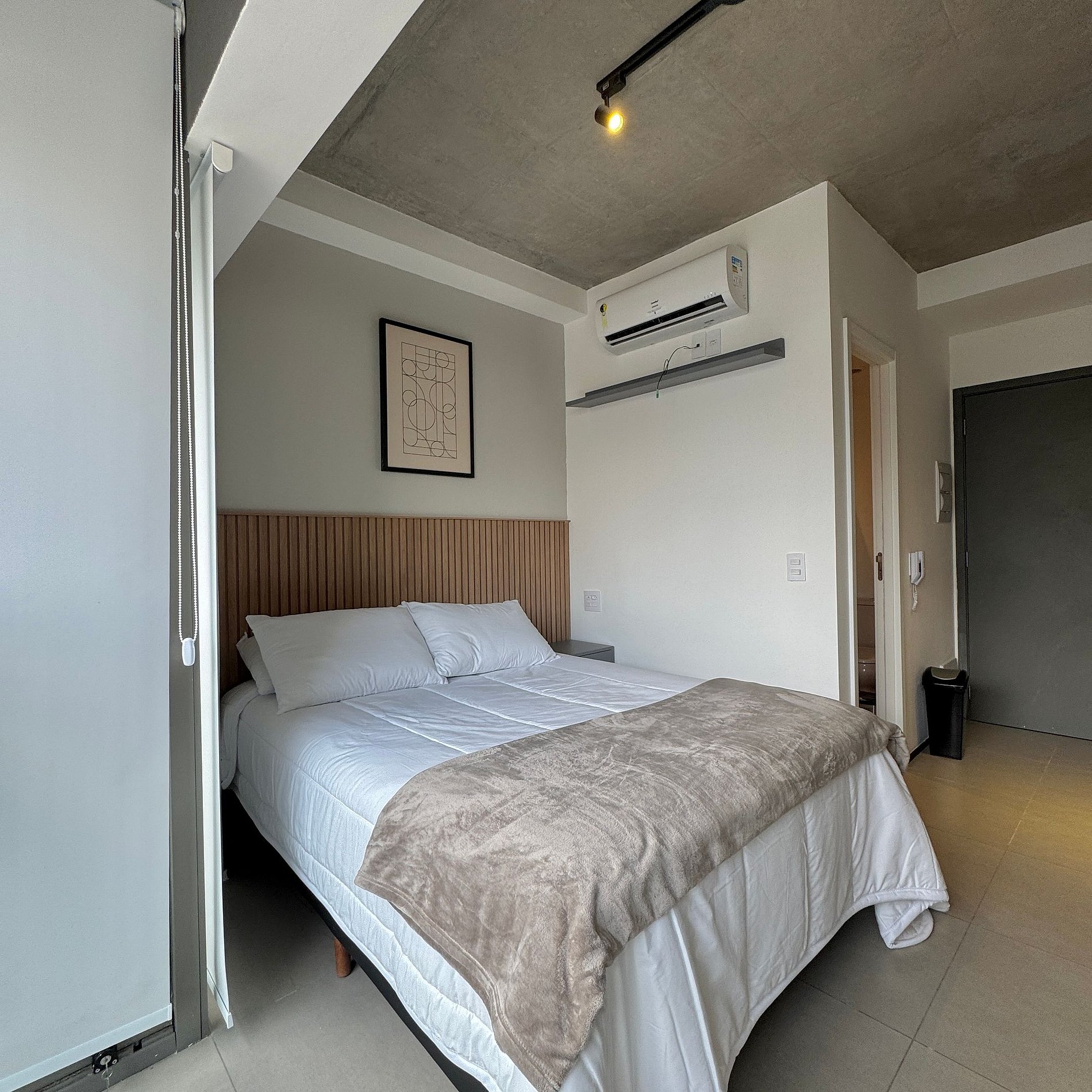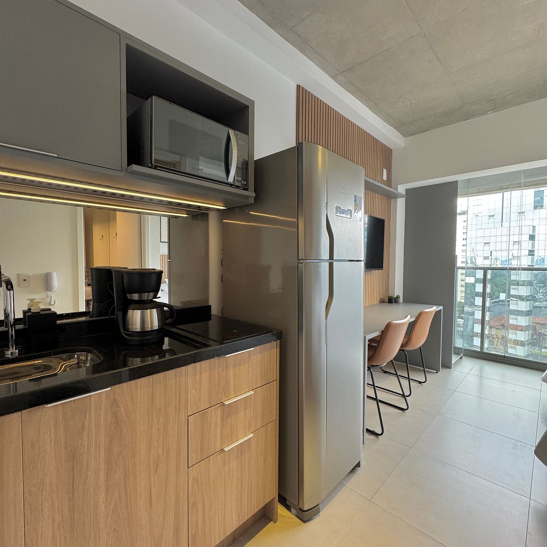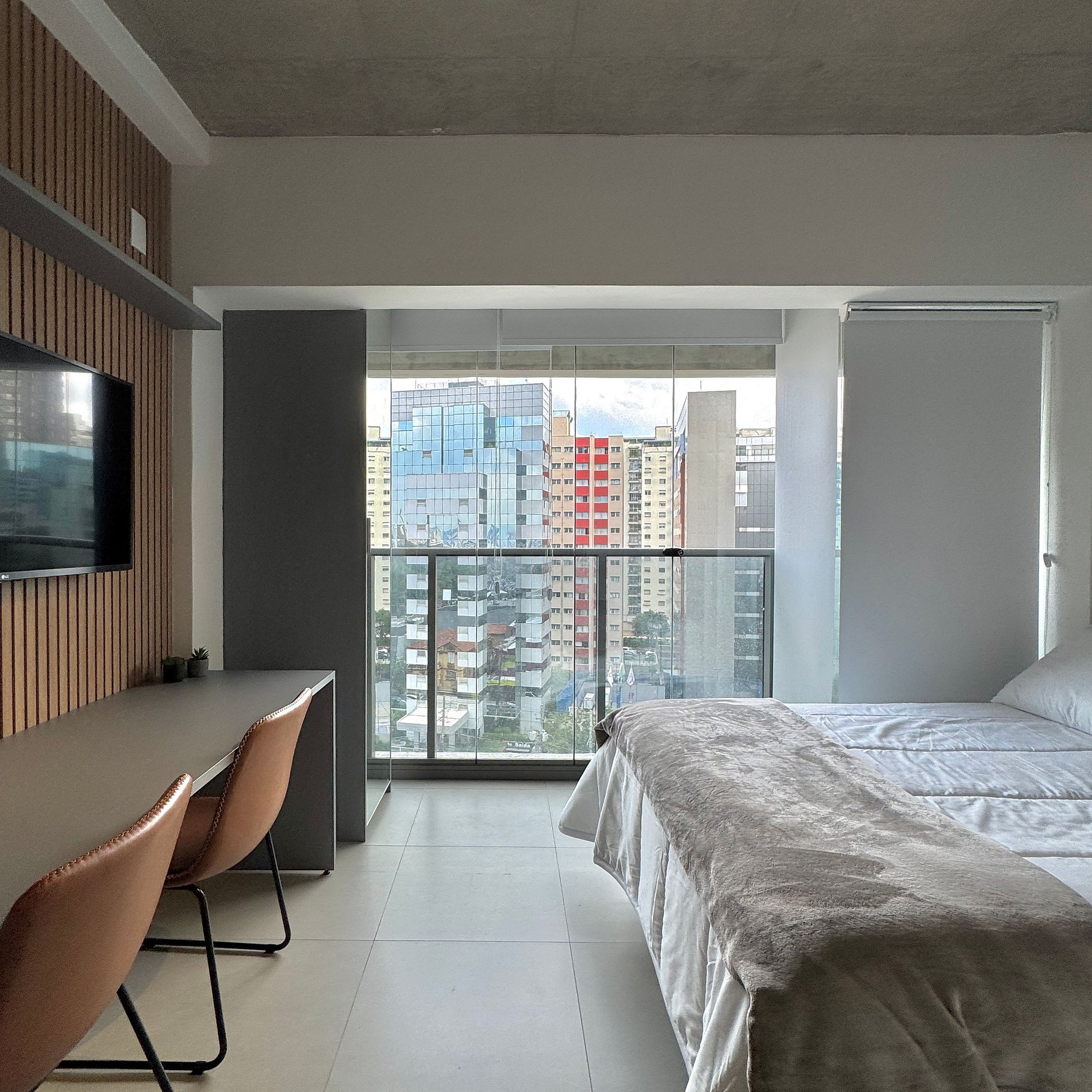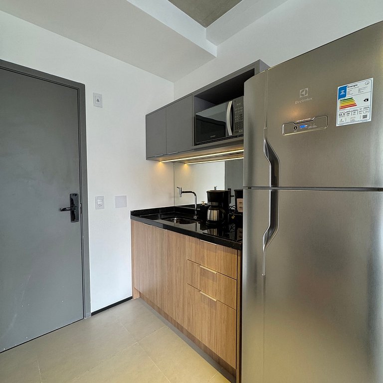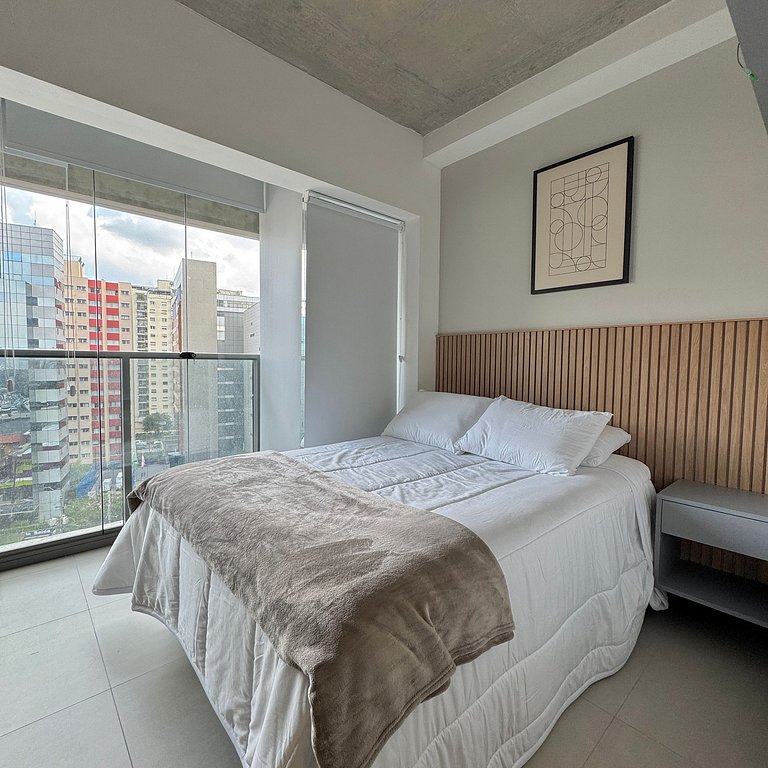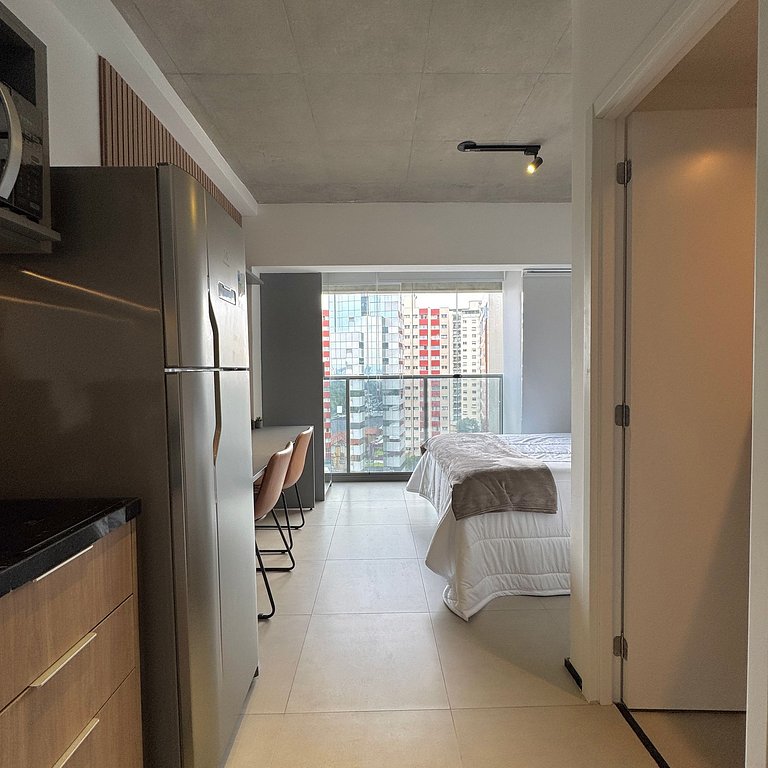 Aqui cada detalhe foi pensado para tornar sua estadia única: cozinha funcional, quarto com cama casal atendendo até 2 pessoas, blackout, wi-fi, ar-condicionado, TV Smart e um espaço para home office. O grande destaque é a varanda integrada que garante mais espaço e luminosidade natural, além de uma vista para o bairro, o estúdio é idêntico as fotos e perfeito para quem vem a trabalho ou passeio, devido à excelente localização e facilidade de locomoção.