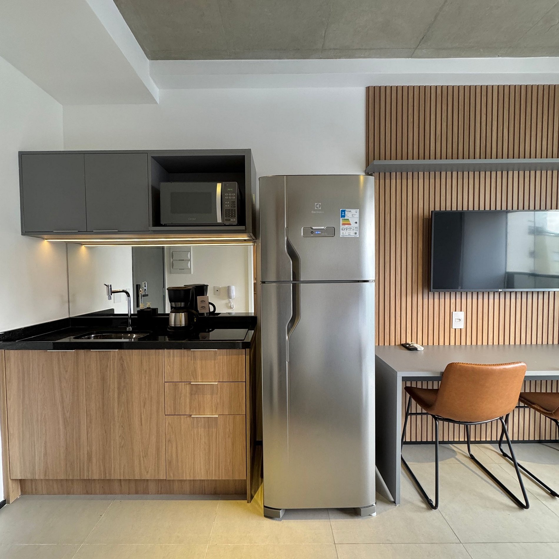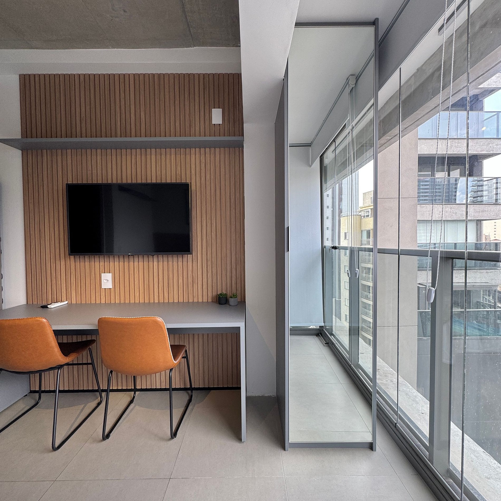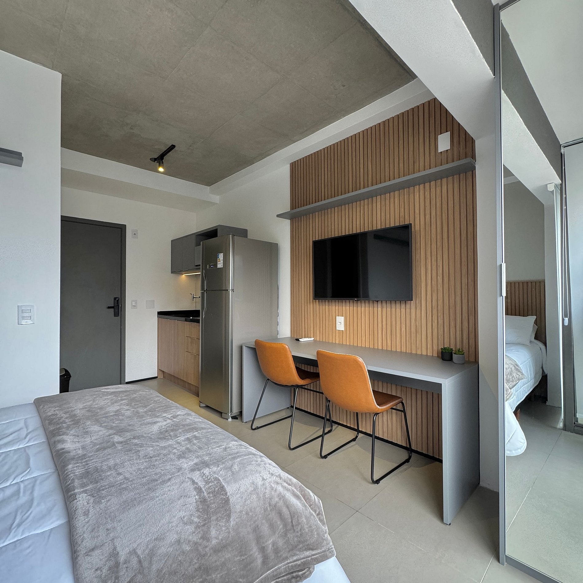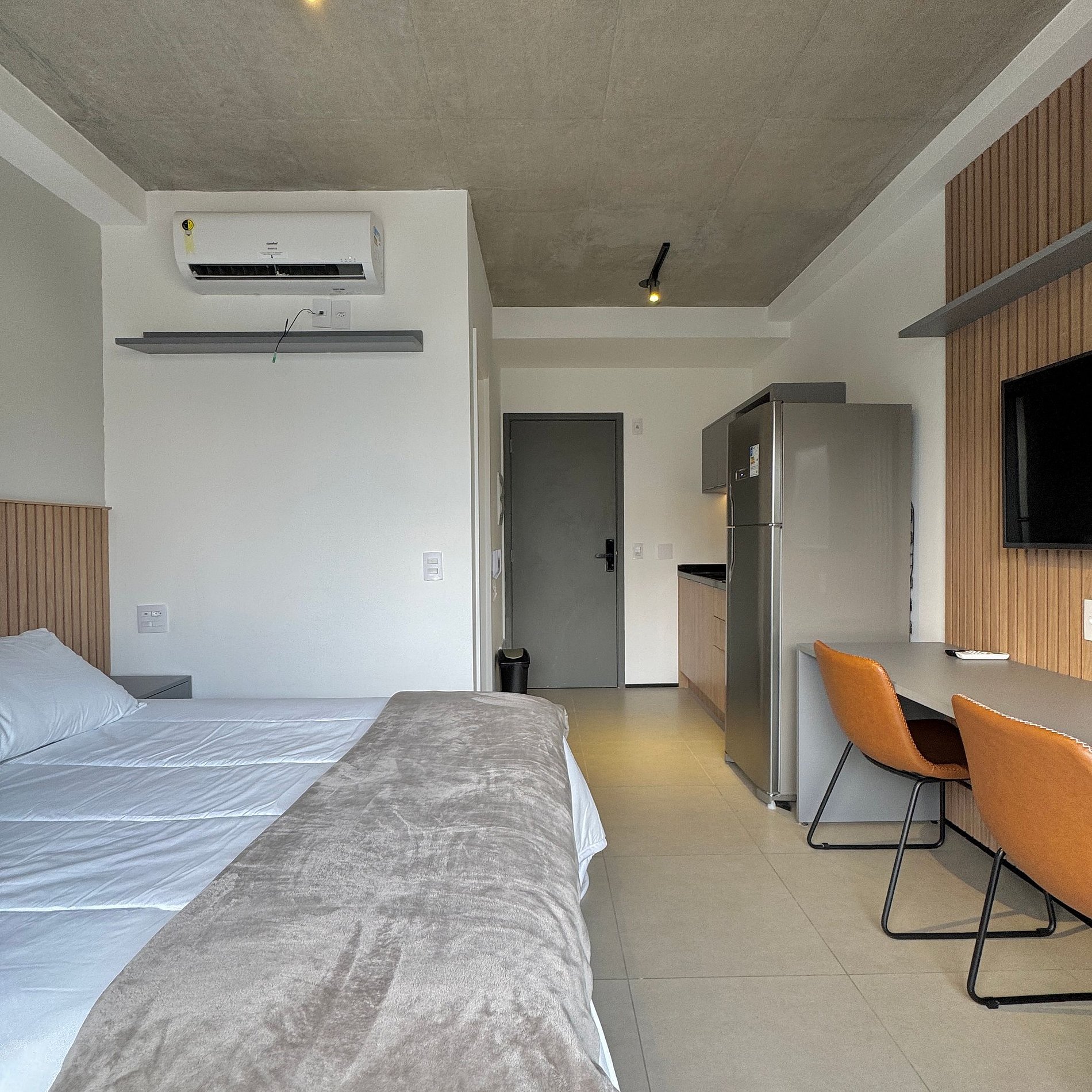 Aqui cada detalhe foi pensado para tornar sua estadia única: cozinha funcional, quarto com cama casal atendendo até 2 pessoas, blackout, wi-fi, ar-condicionado, TV Smart e um espaço para home office. O grande destaque é a varanda integrada que garante mais espaço e luminosidade natural, além de uma vista para o bairro, o estúdio é idêntico as fotos e perfeito para quem vem a trabalho ou passeio, devido à excelente localização e facilidade de locomoção.