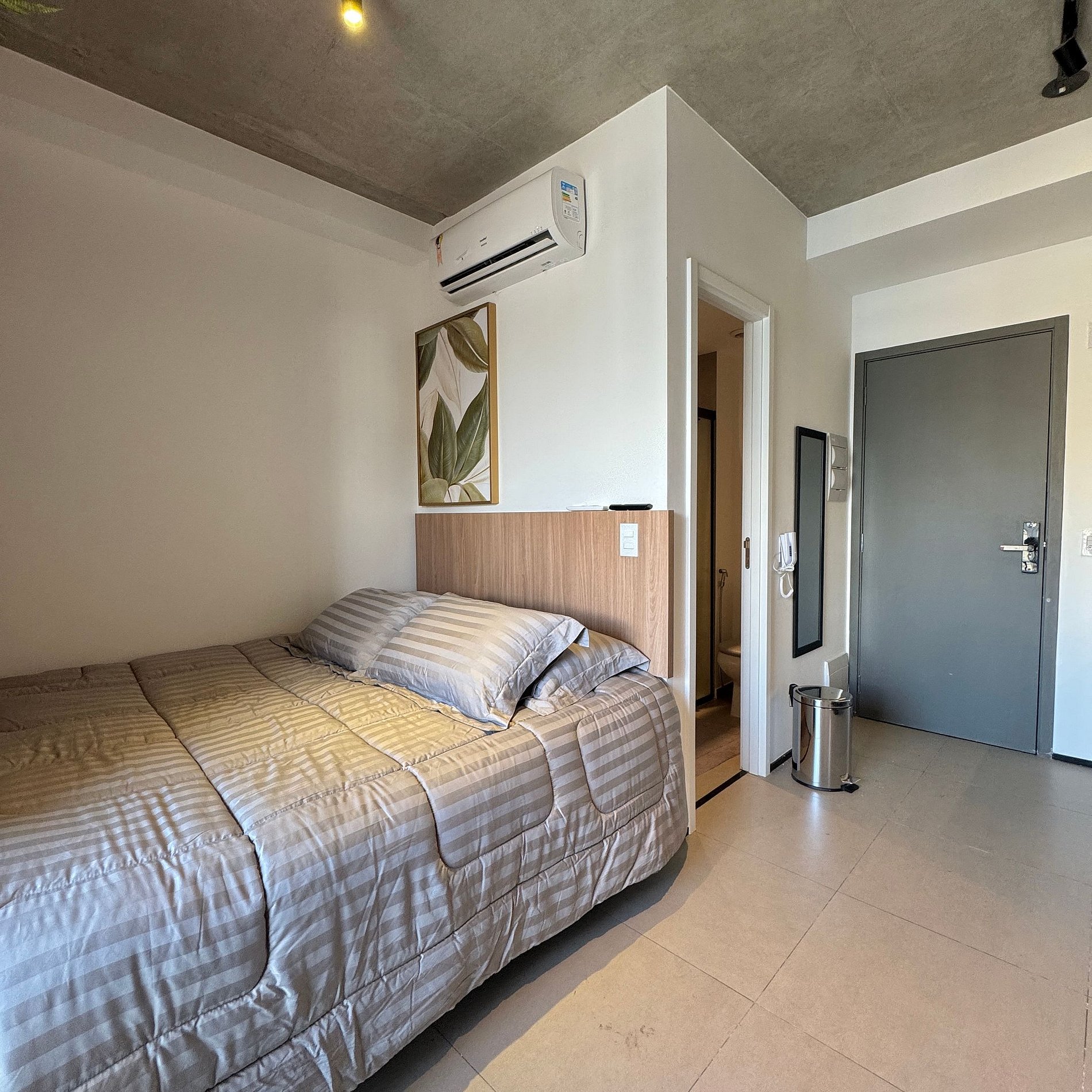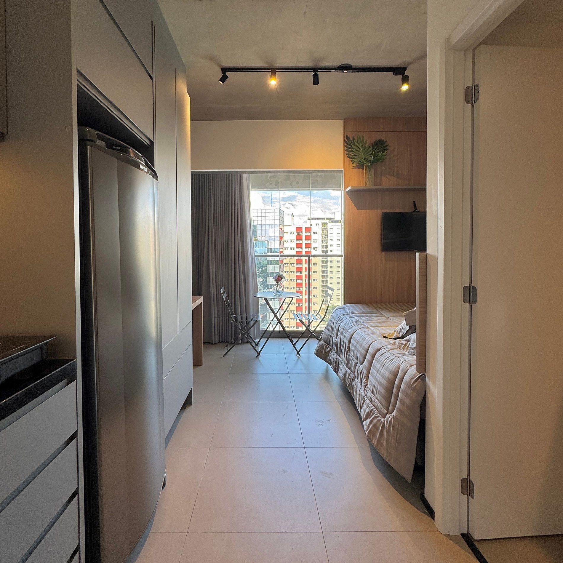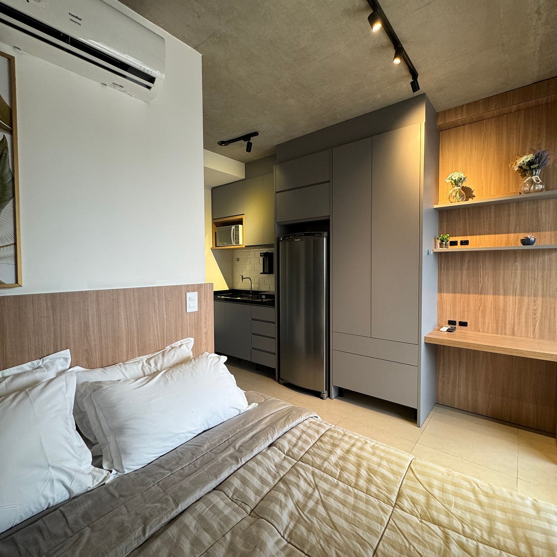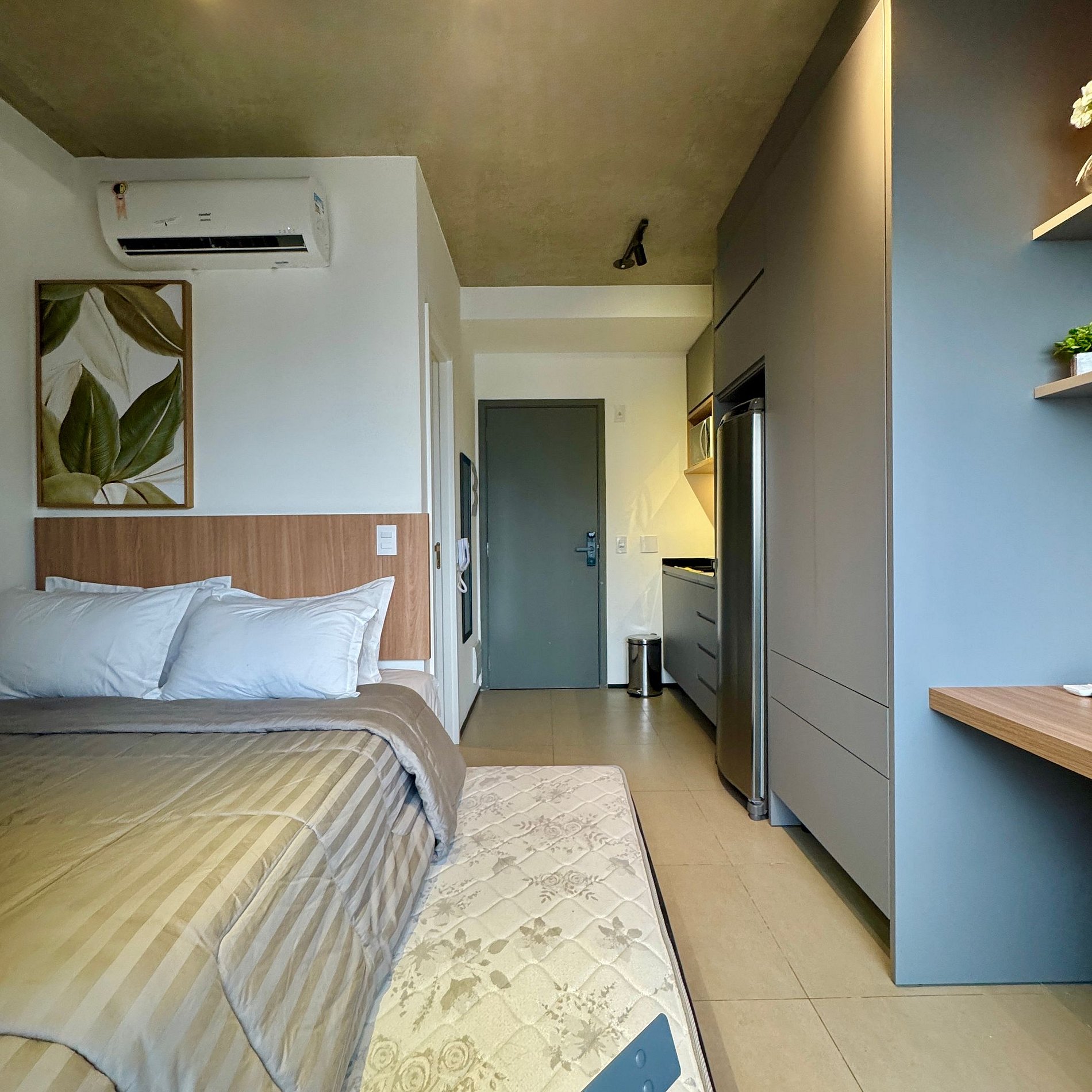 Aqui cada detalhe foi pensado para tornar sua estadia única: cozinha funcional, quarto com cama queen e um colchão de solteiro atendendo até 3 pessoas, blackout, wi-fi, ar-condicionado, TV Smart e um espaço para home office. O grande destaque é a varanda integrada que garante mais espaço e luminosidade natural, além de uma vista livre para o bairro, o studio é identico as fotos e perfeito para quem vem a trabalho ou passeio, devido a excelente localização e facilidade de locomoção.