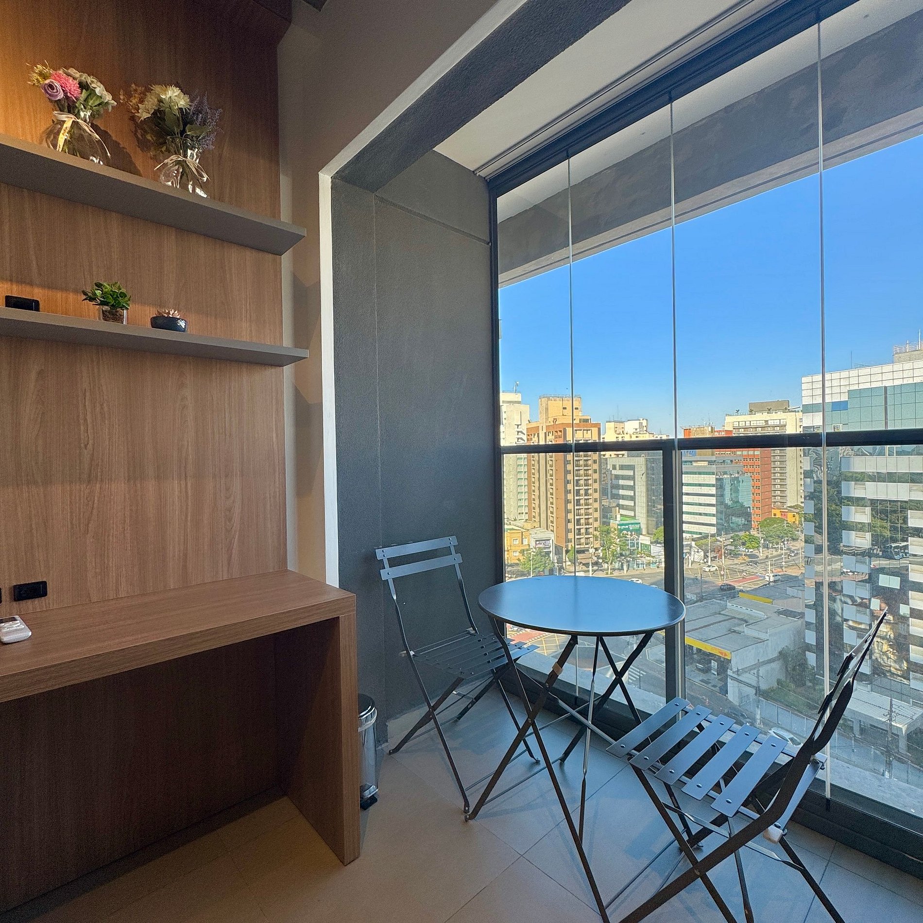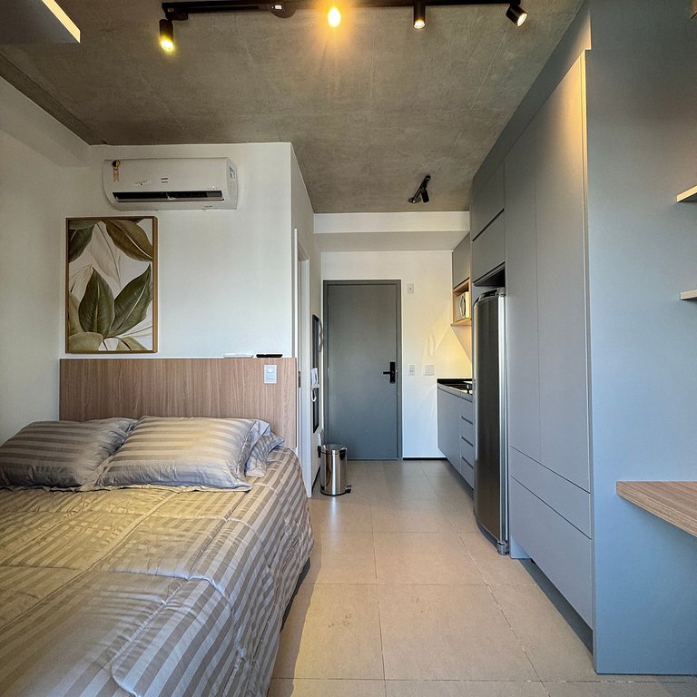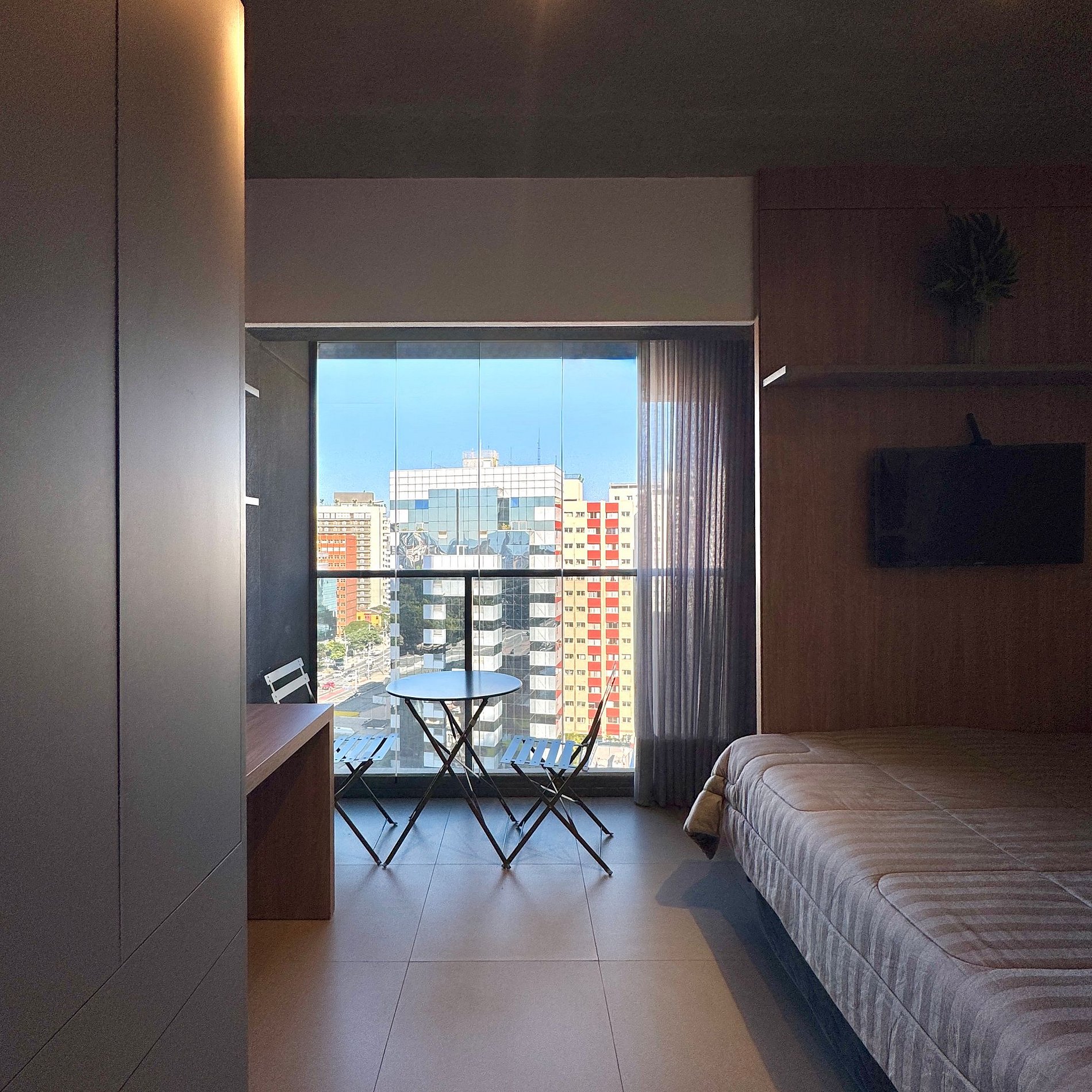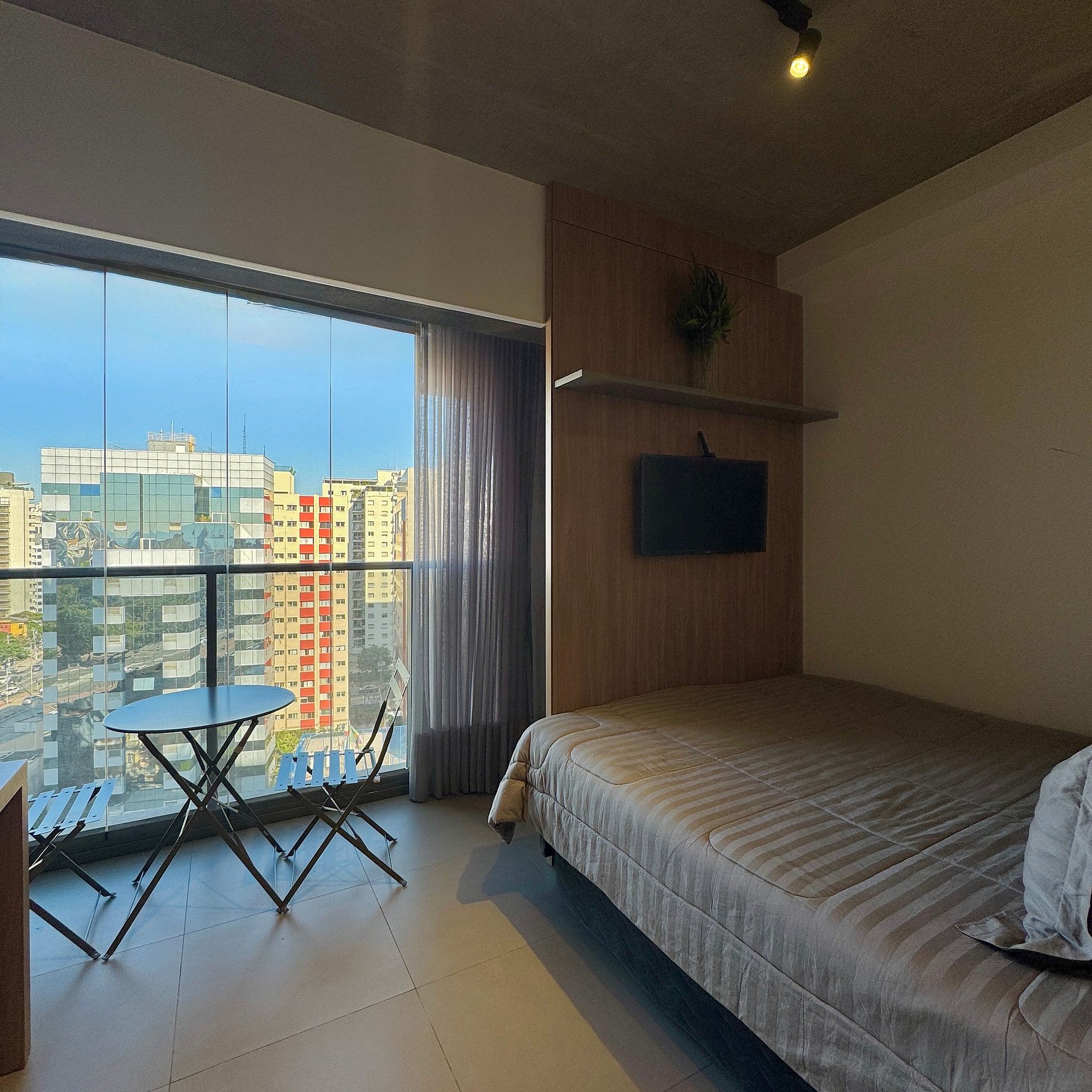 Aqui cada detalhe foi pensado para tornar sua estadia única: cozinha funcional, quarto com cama queen e um colchão de solteiro atendendo até 3 pessoas, blackout, wi-fi, ar-condicionado, TV Smart e um espaço para home office. O grande destaque é a varanda integrada que garante mais espaço e luminosidade natural, além de uma vista livre para o bairro, o studio é identico as fotos e perfeito para quem vem a trabalho ou passeio, devido a excelente localização e facilidade de locomoção.