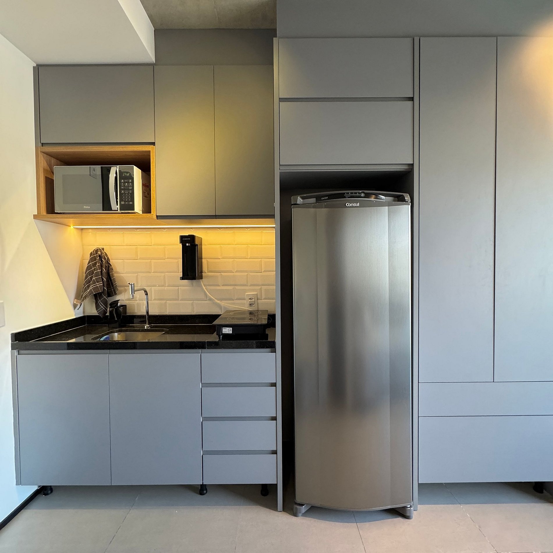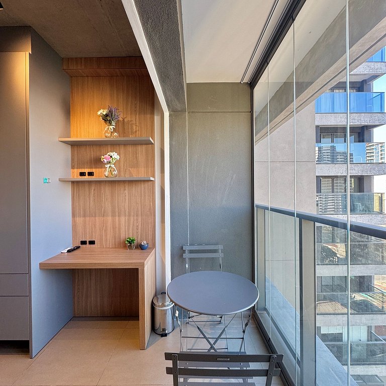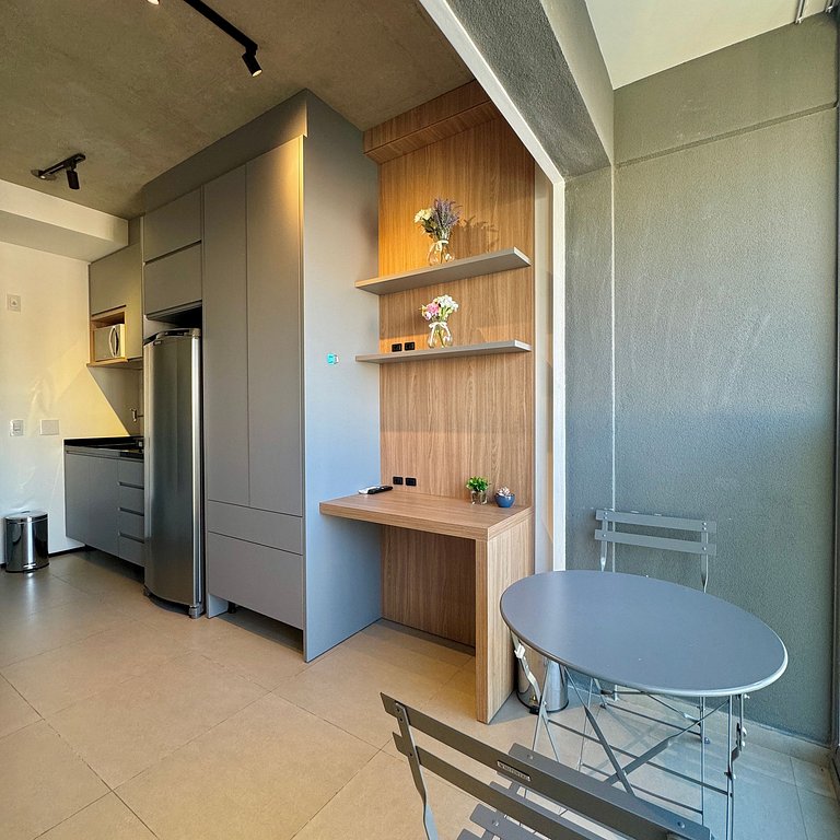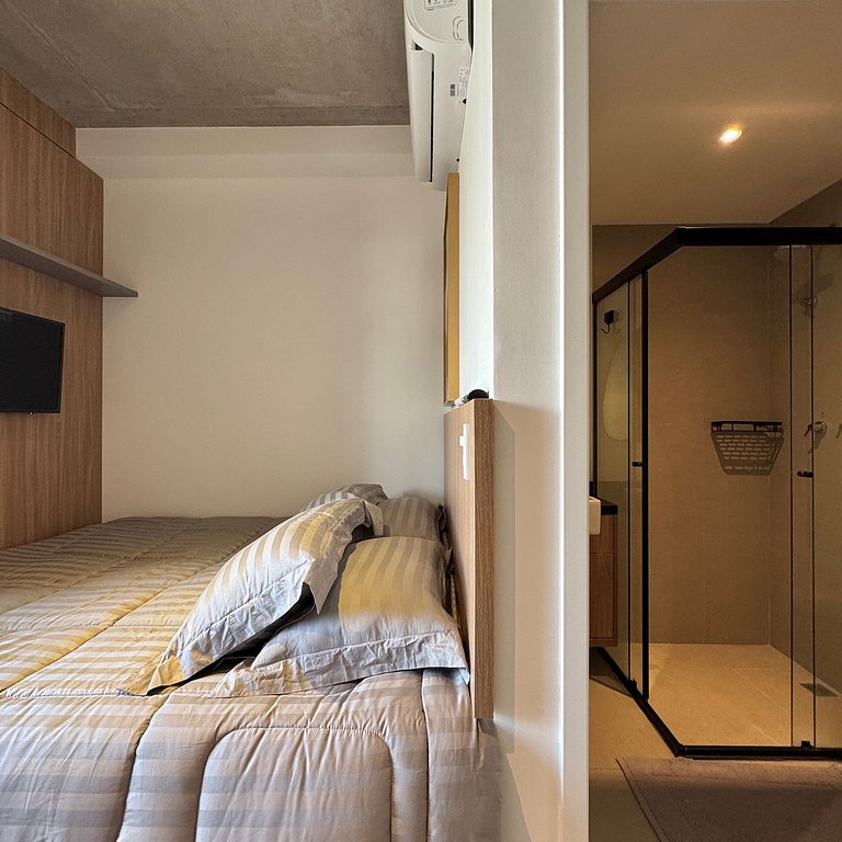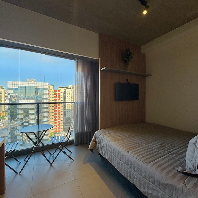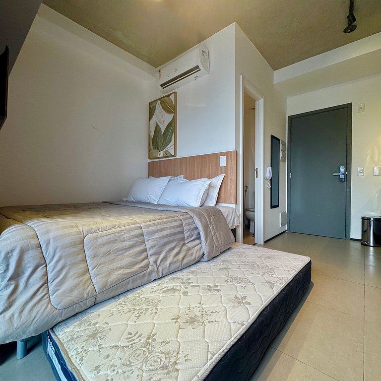 Aqui cada detalhe foi pensado para tornar sua estadia única: cozinha funcional, quarto com cama queen e um colchão de solteiro atendendo até 3 pessoas, blackout, wi-fi, ar-condicionado, TV Smart e um espaço para home office. O grande destaque é a varanda integrada que garante mais espaço e luminosidade natural, além de uma vista livre para o bairro, o studio é identico as fotos e perfeito para quem vem a trabalho ou passeio, devido a excelente localização e facilidade de locomoção.