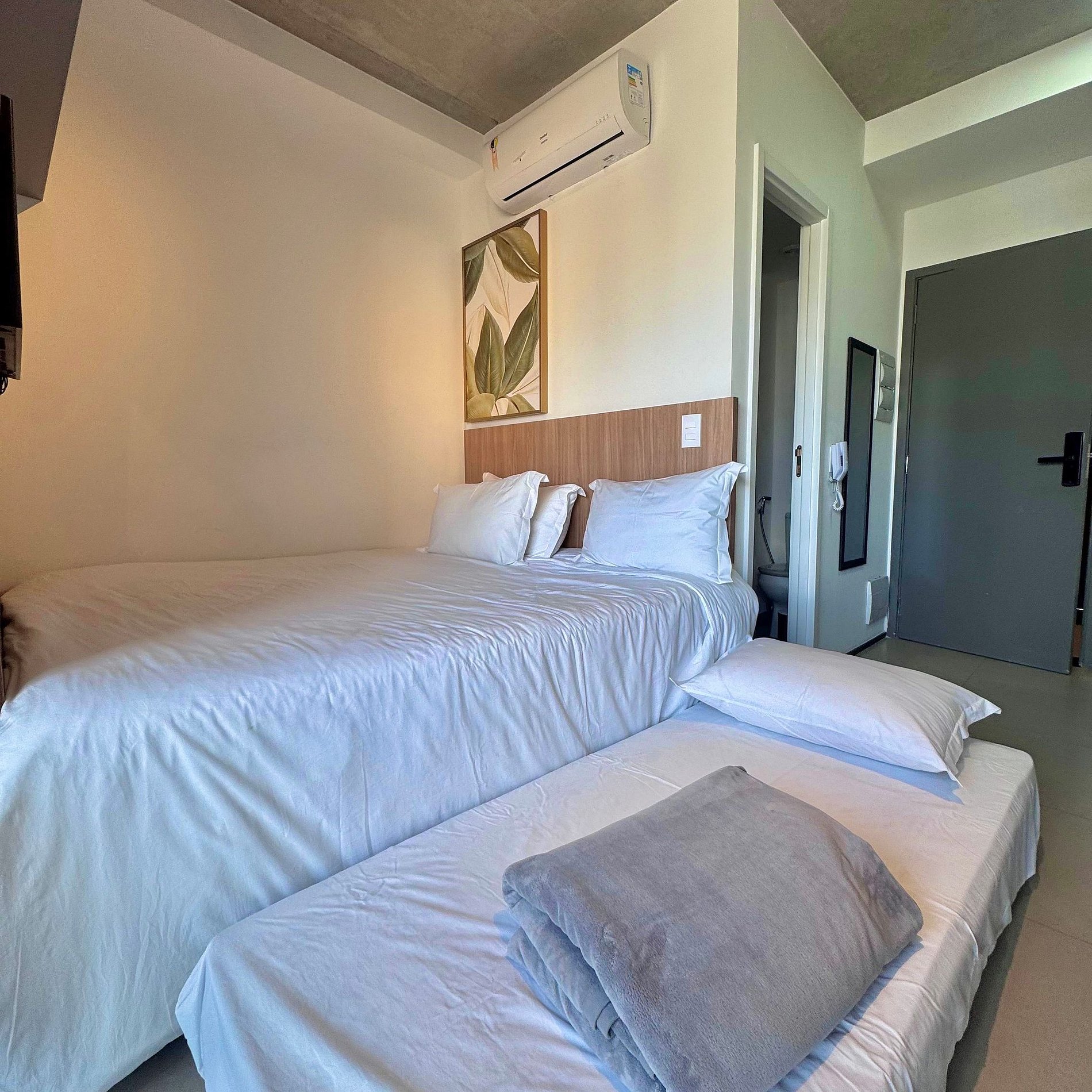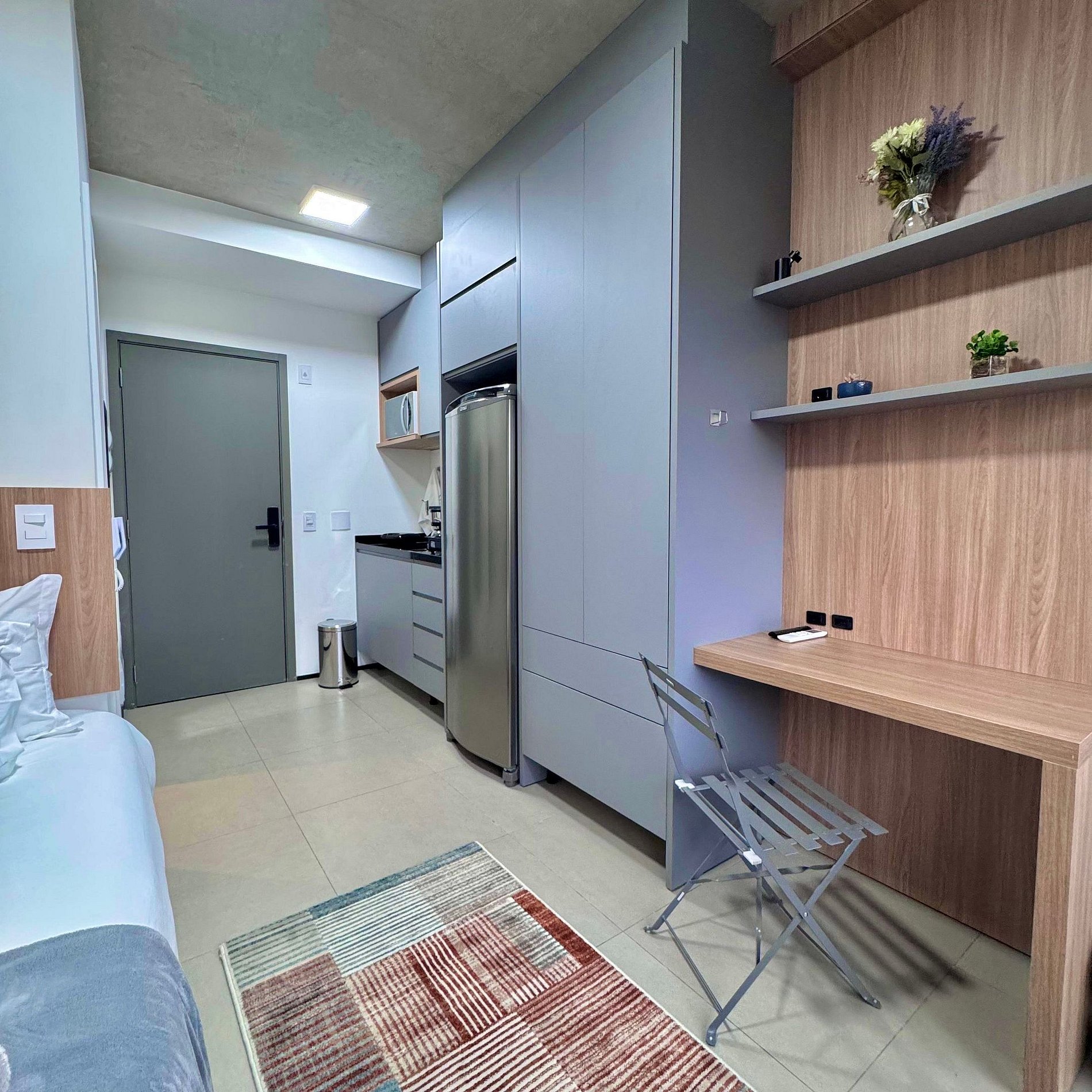 Aqui cada detalhe foi pensado para tornar sua estadia única: cozinha funcional, quarto com cama queen e um colchão de solteiro atendendo até 3 pessoas, blackout, wi-fi, ar-condicionado, TV Smart e um espaço para home office. O grande destaque é a varanda integrada que garante mais espaço e luminosidade natural, além de uma vista livre para o bairro, o studio é identico as fotos e perfeito para quem vem a trabalho ou passeio, devido a excelente localização e facilidade de locomoção.