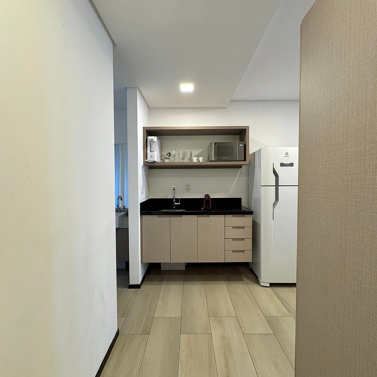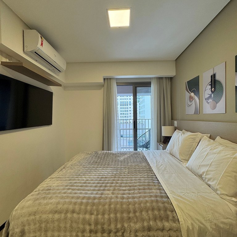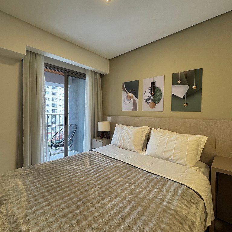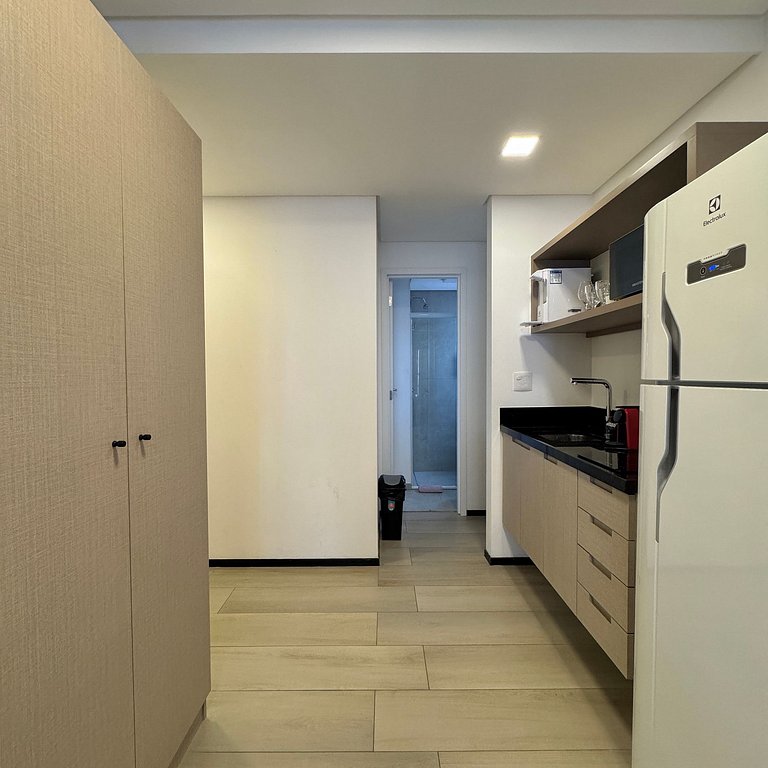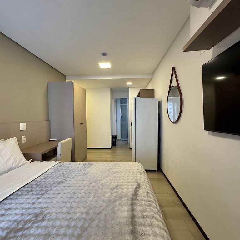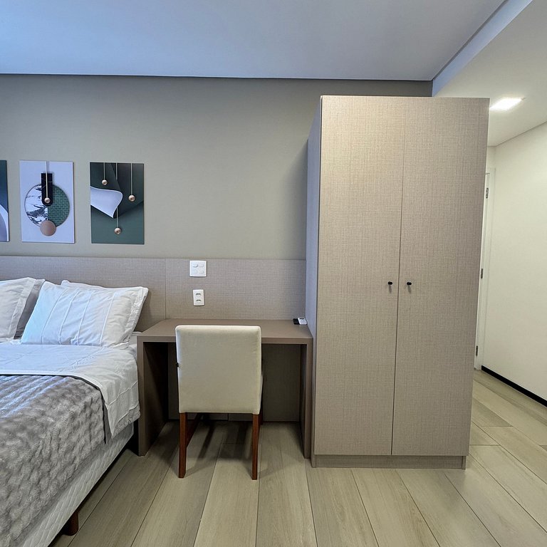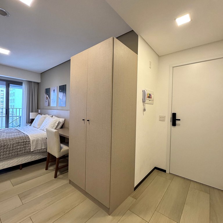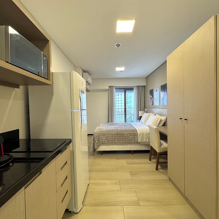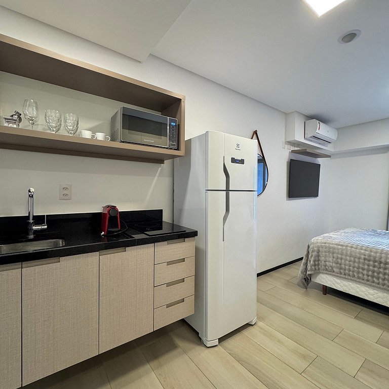 Aqui cada detalhe foi pensado para tornar sua estadia única: cozinha funcional, quarto com cama queen atendendo até 2 pessoas, blackout, filtro de água, cafeteira, wi-fi, ar-condicionado, TV Smart e um espaço para home office. O estúdio é todo planejado e é idêntico às fotos e perfeito para quem vem a trabalho ou passeio, devido à excelente localização e facilidade de locomoção.