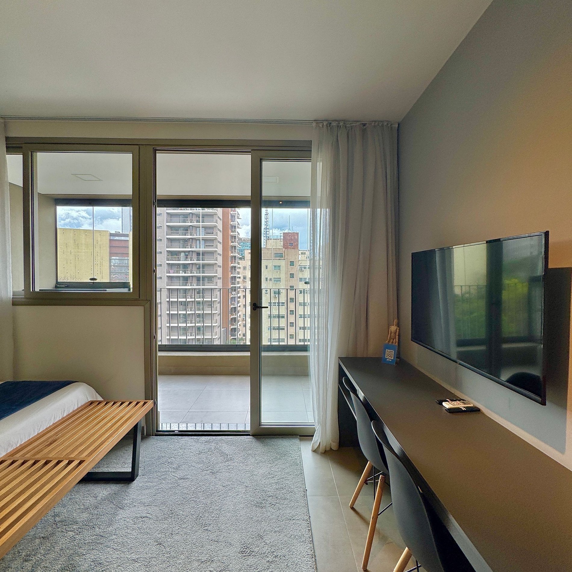 Aqui cada detalhe foi pensado para tornar sua estadia única: cozinha completa com fogão, micro-ondas, cafeteira e geladeira. O quarto com cama de casal, blackout, wi-fi, ar-condicionado, vaga de garagem (com manobrista), TV Smart e um espaço para home office. O grande destaque é a sacada fechada com vista marcante para o bairro Jardins que garante luminosidade e menos ruído durante o dia e a noite, perfeita para trabalhar, relaxar, ler um livro ou simplesmente apreciar momentos tranquilos.