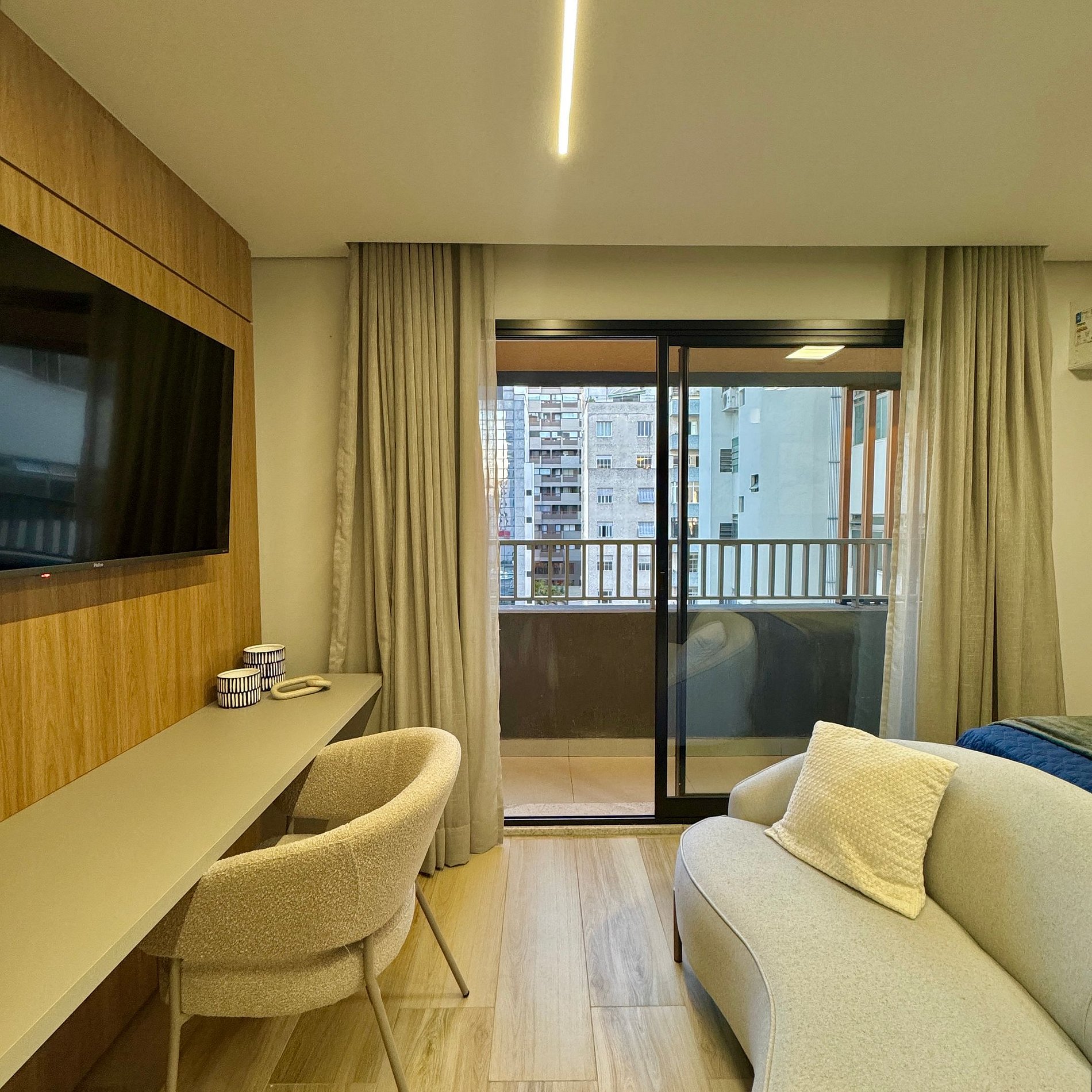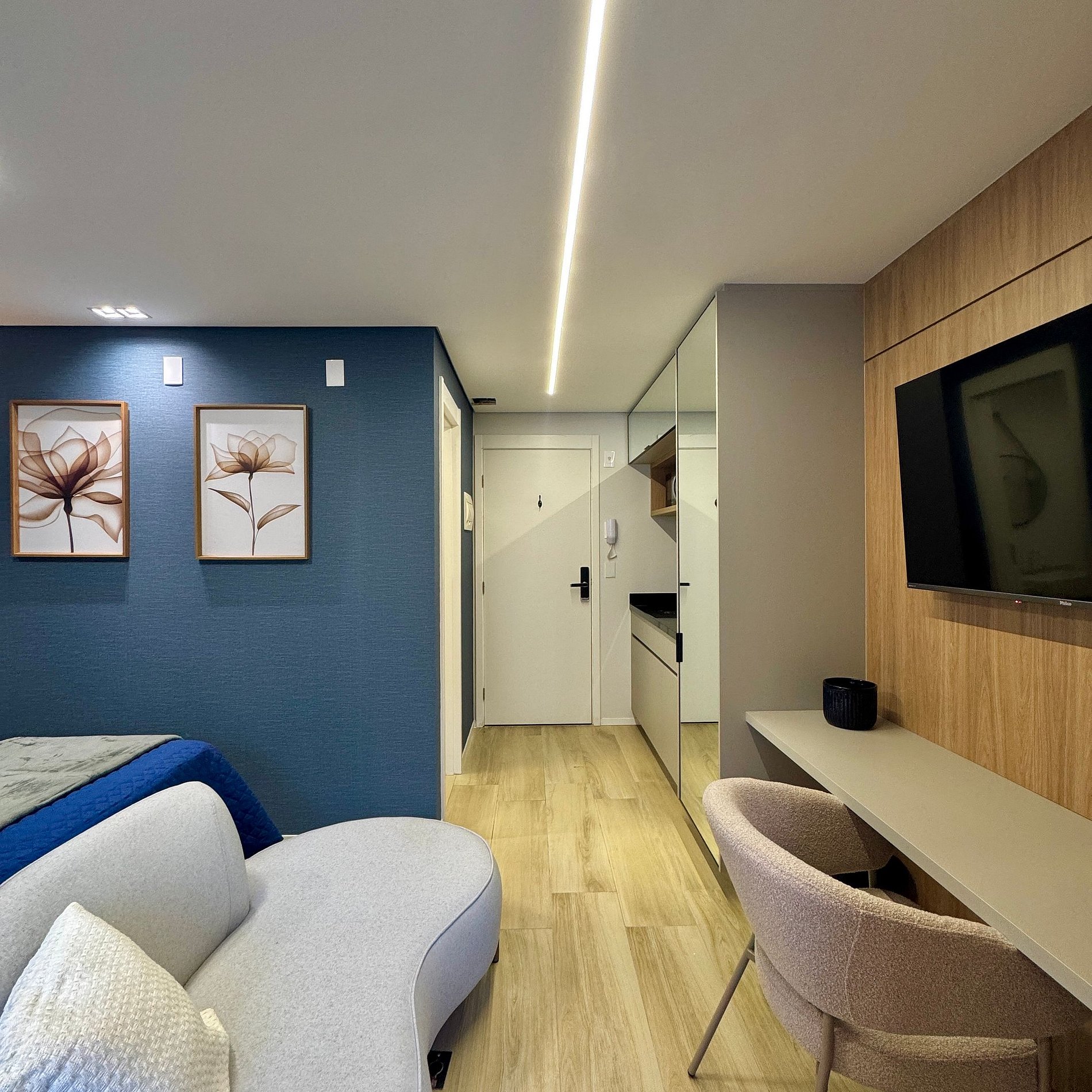 Aqui cada detalhe foi pensado para tornar sua estadia única: cozinha funcional, quarto com cama queen atendendo até 2 pessoas, blackout, filtro de água, cafeteira, wi-fi, ar-condicionado, TV Smart e um espaço para home office. O estúdio é todo planejado, com excelente bom gosto e acabamento, é idêntico às fotos e perfeito para quem vem a trabalho ou passeio, devido à excelente localização e facilidade de locomoção.
