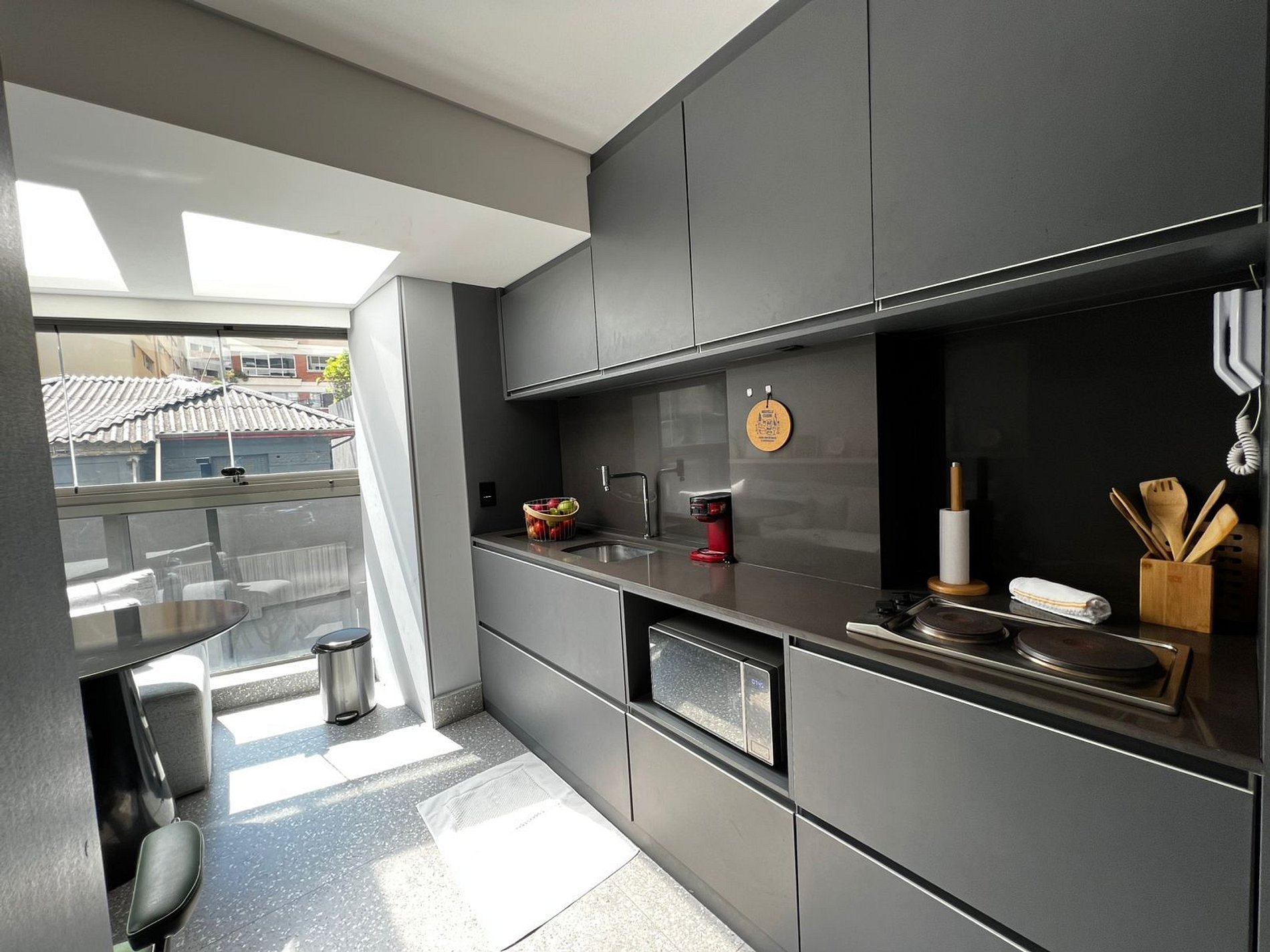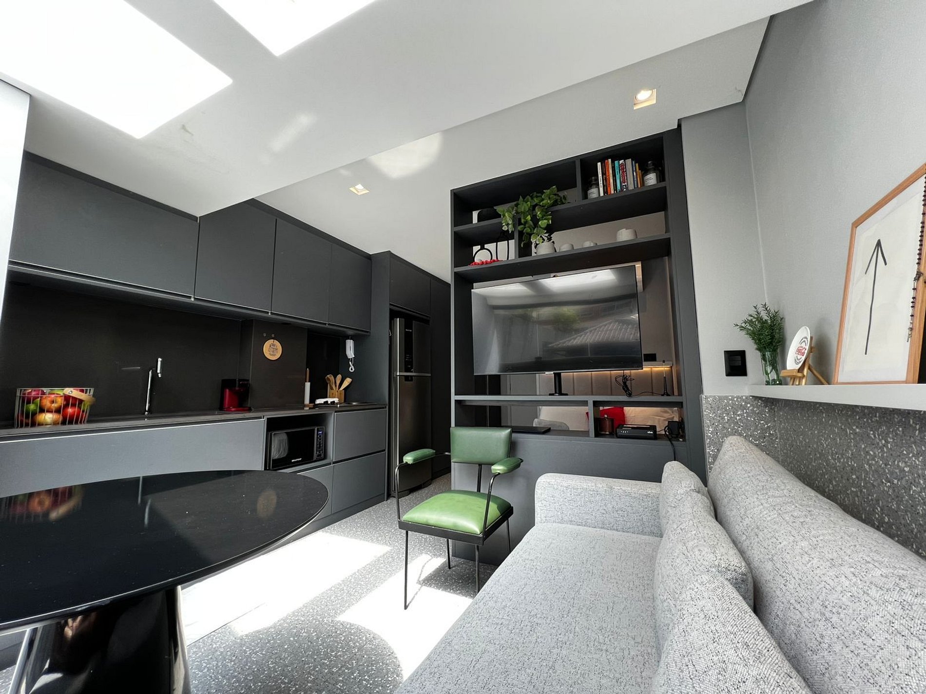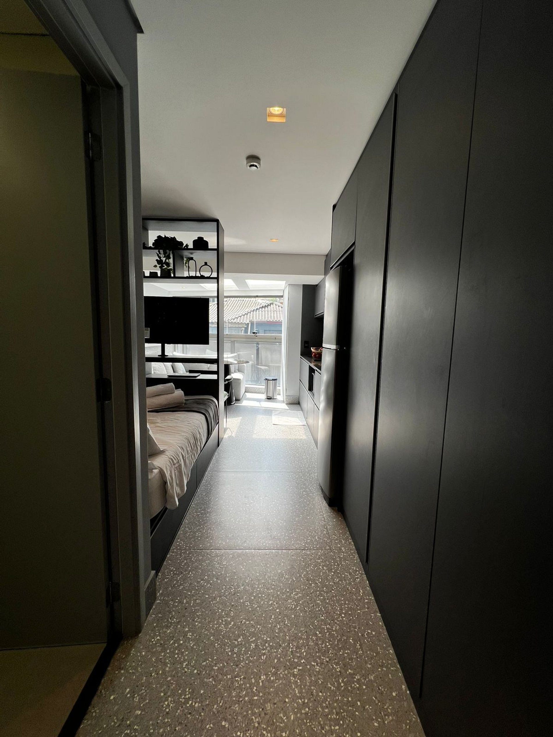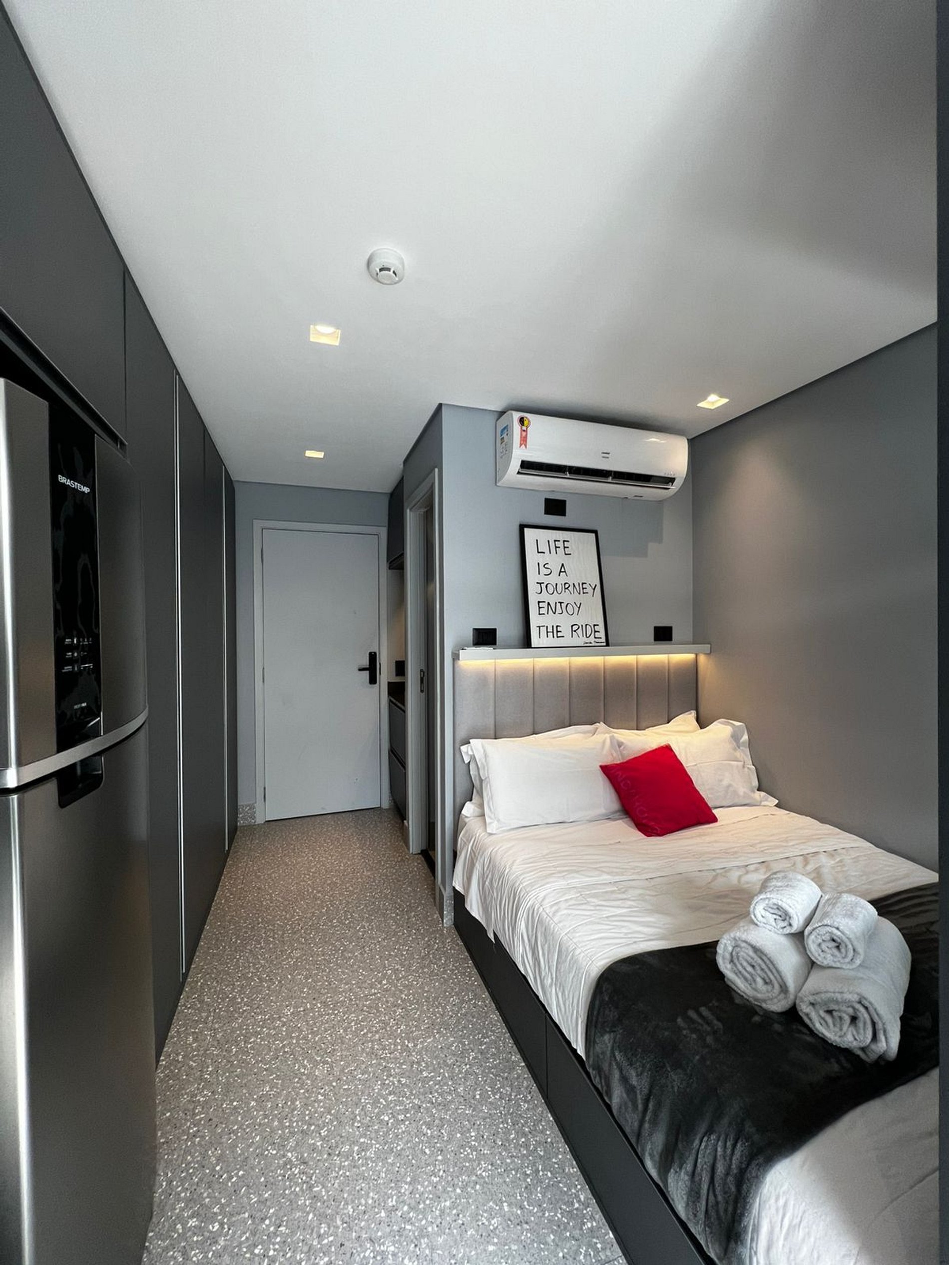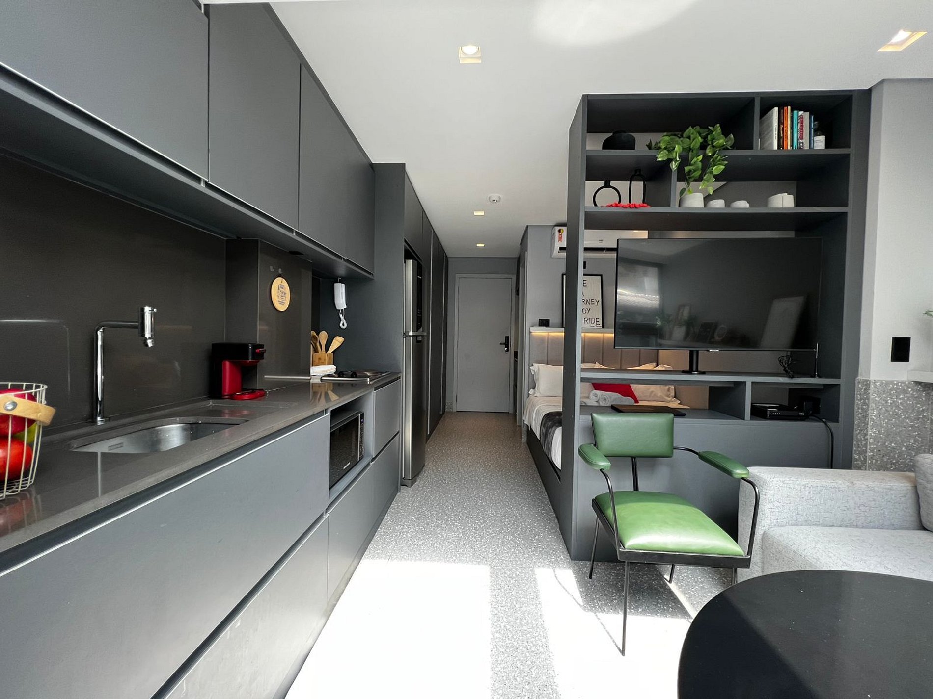 Aqui cada detalhe foi pensado para tornar sua estadia única: cozinha completa com fogão, micro-ondas, cafeteira, frigobar, quarto com cama casal, persiana com blackout, enxoval completo, travesseiros, mantas/edredom para aqueles dias mais frios. O estúdio conta com: wi-fi, ar-condicionado, TV Smart e um espaço para home office.