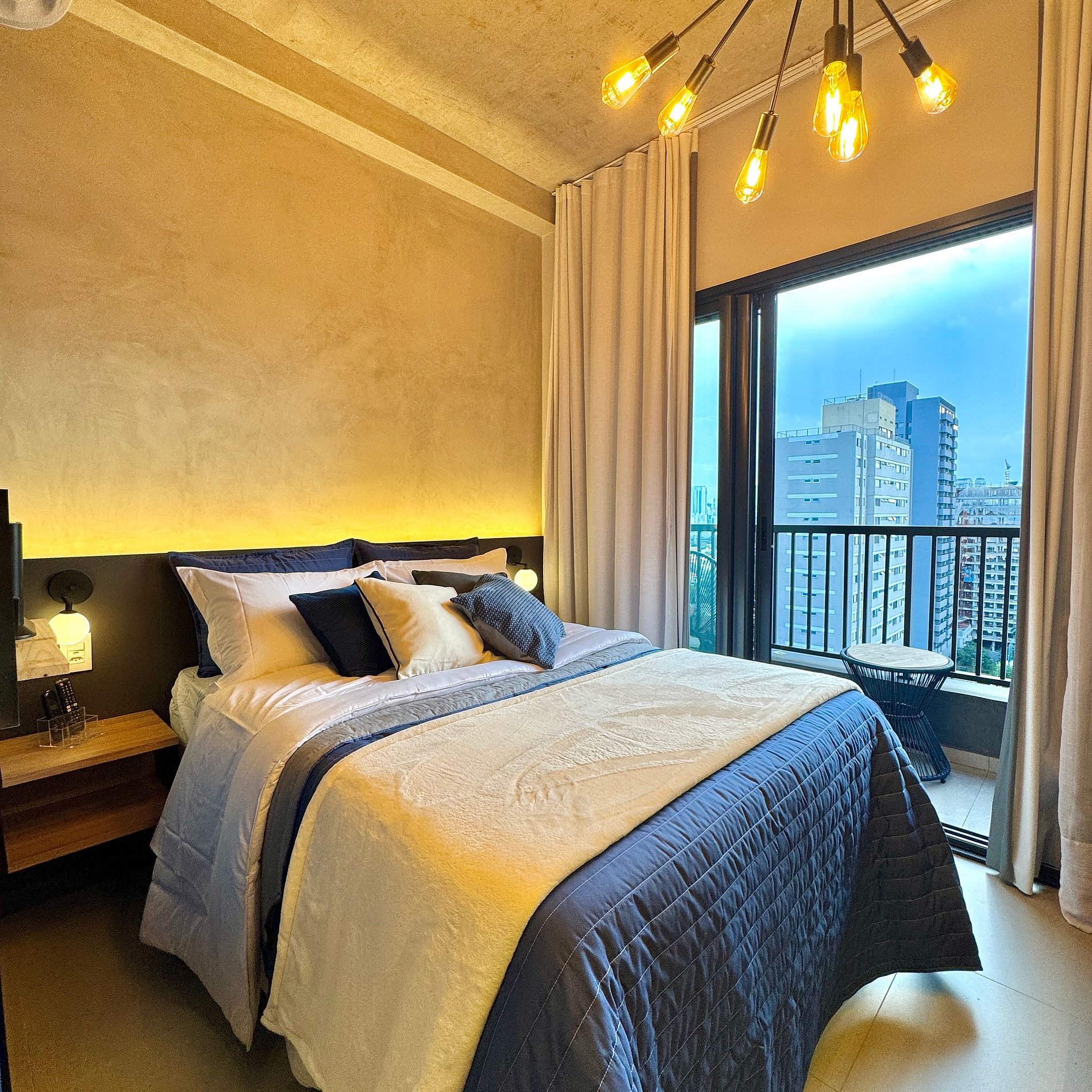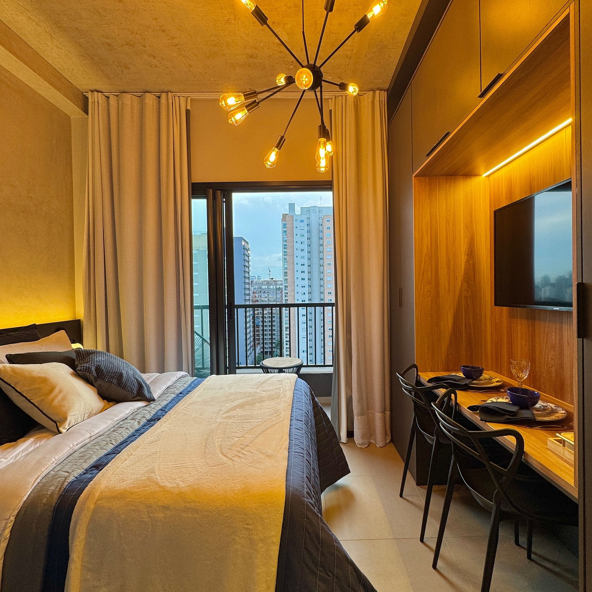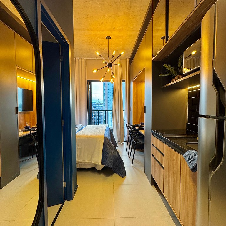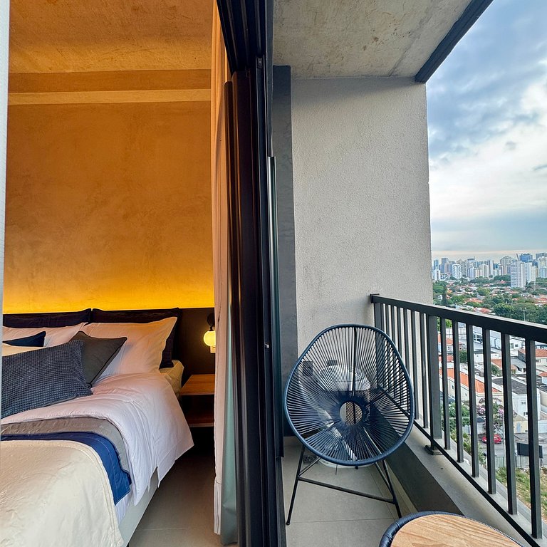 Aqui cada detalhe foi pensado para tornar sua estadia única: cozinha completa com fogão, micro-ondas, cafeteira, geladeira, quarto com cama de casal, blackout, enxoval completo, travesseiros, mantas/edredom para aqueles dias mais frios, Wi-fi, ar-condicionado, TV Smart e um espaço para home office. O grande destaque é a sacada com vista para o bairro Vila Olímpia, perfeita para relaxar, ler um livro ou simplesmente apreciar o por do sol.