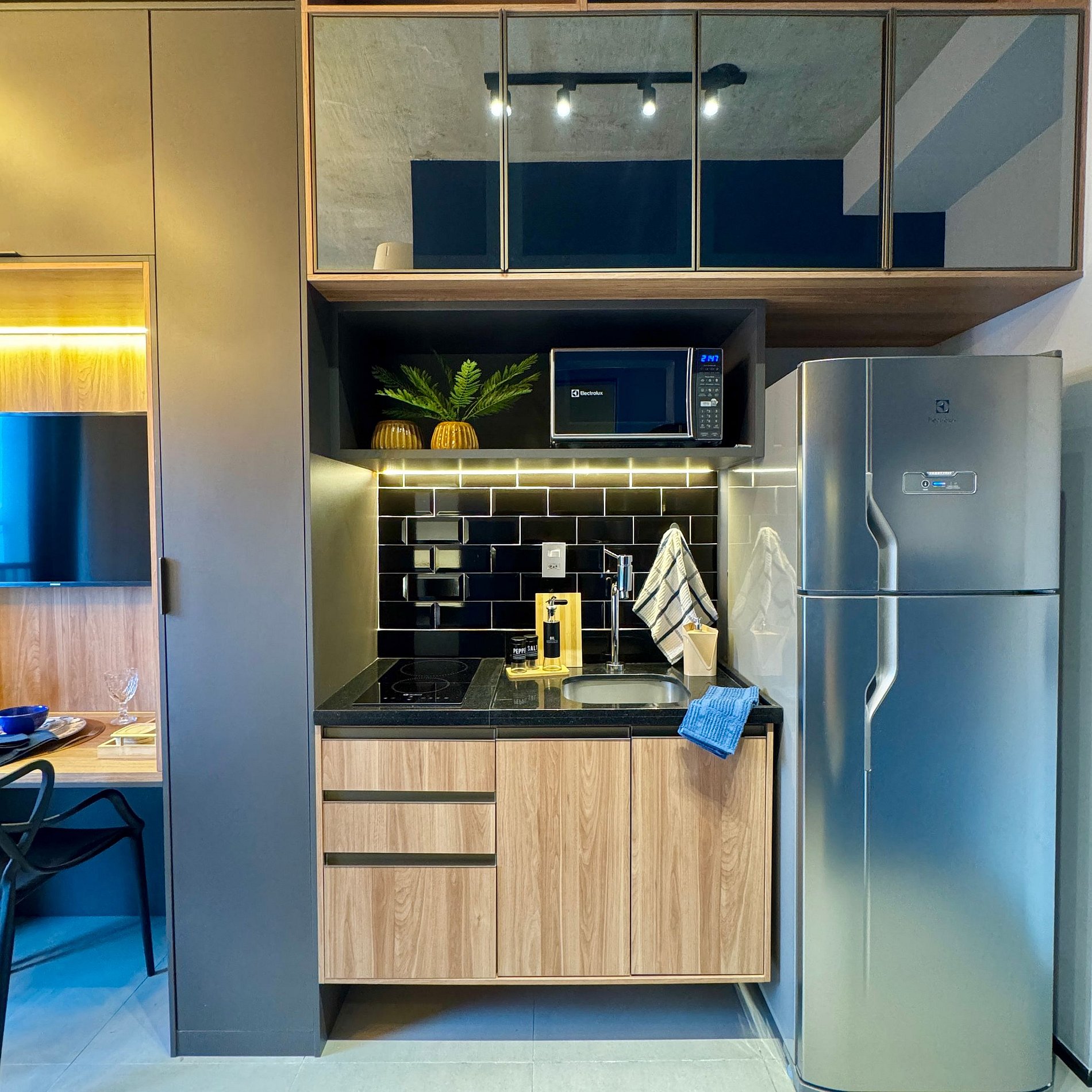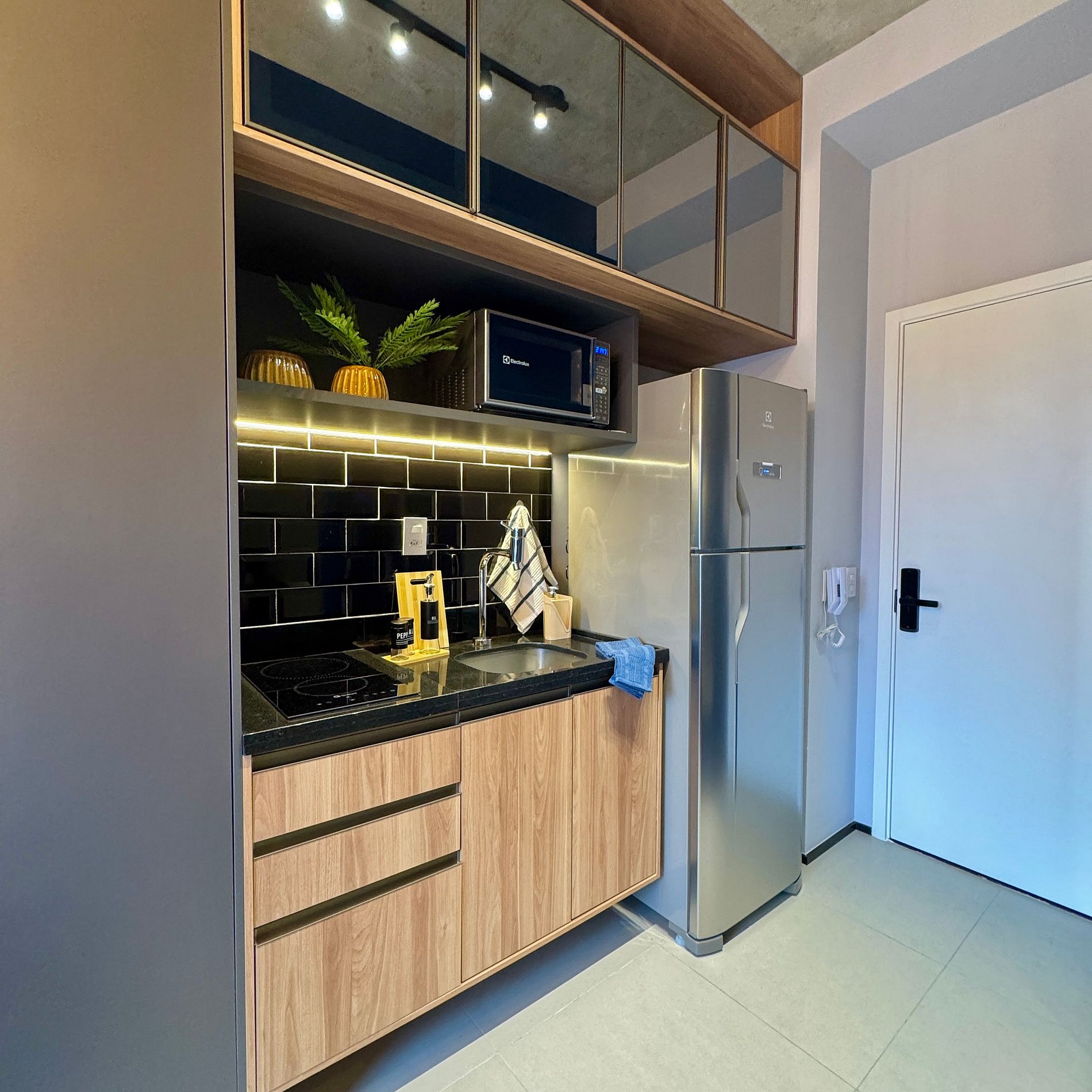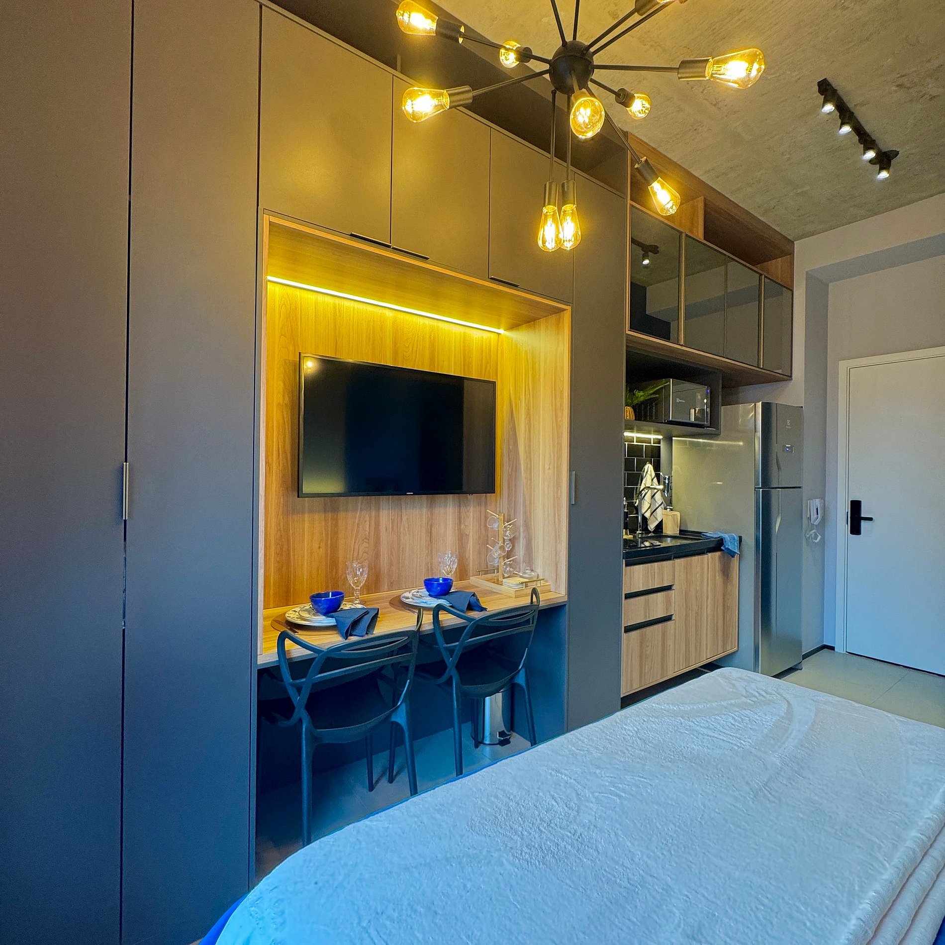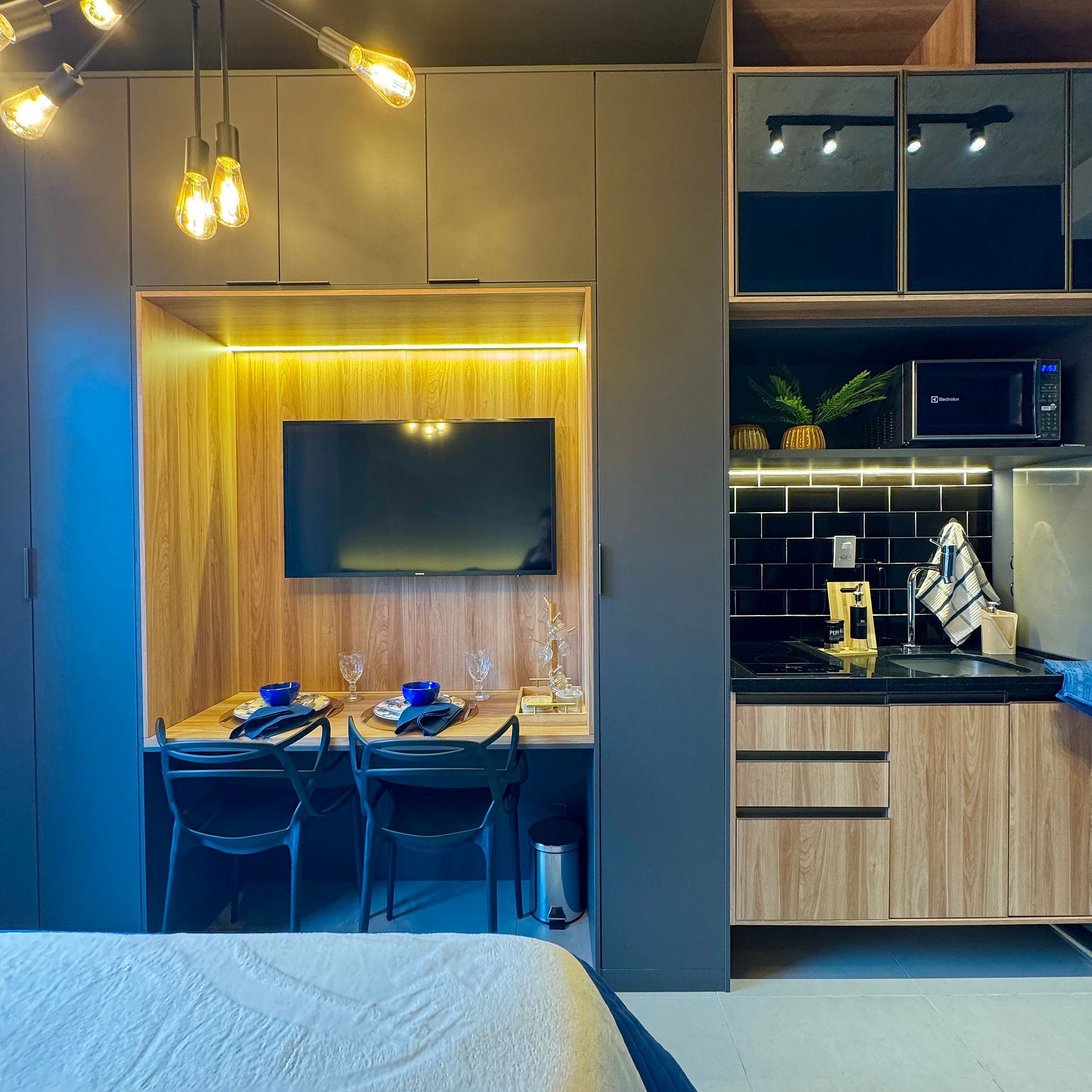Aqui cada detalhe foi pensado para tornar sua estadia única: cozinha completa com fogão, micro-ondas, cafeteira, geladeira, quarto com cama de casal, blackout, enxoval completo, travesseiros, mantas/edredom para aqueles dias mais frios, Wi-fi, ar-condicionado, TV Smart e um espaço para home office. O grande destaque é a sacada com vista para o bairro Vila Olímpia, perfeita para relaxar, ler um livro ou simplesmente apreciar o por do sol.
