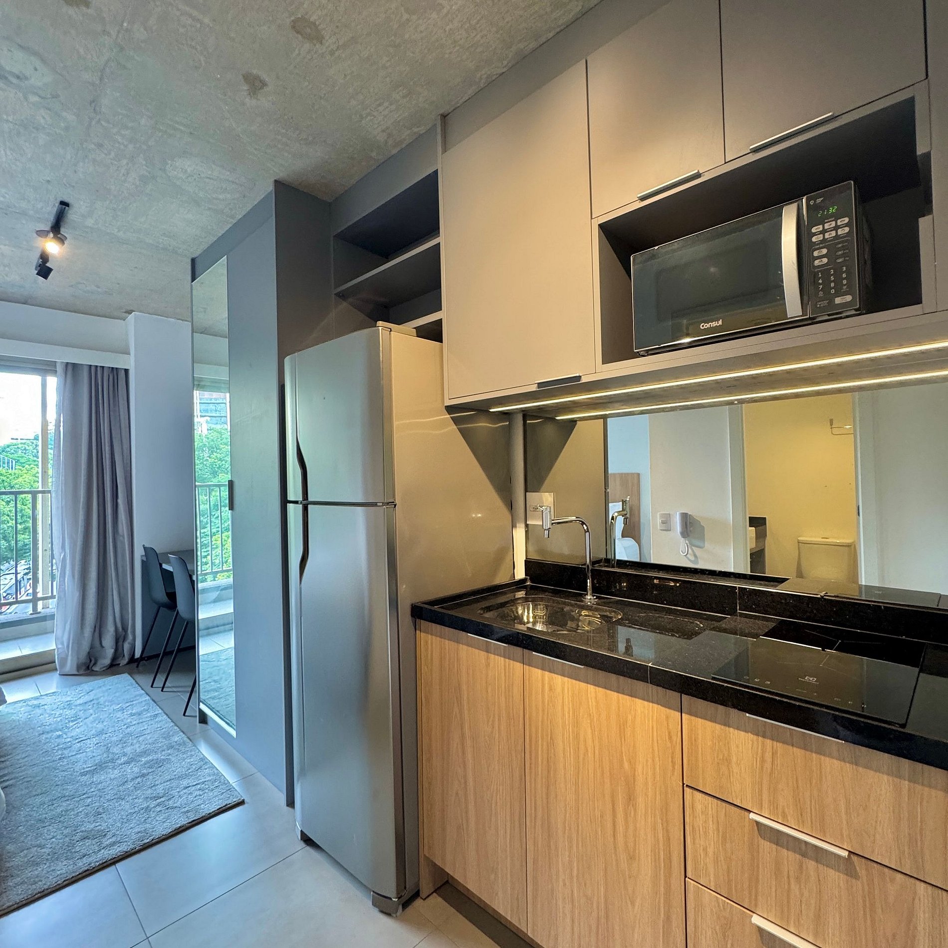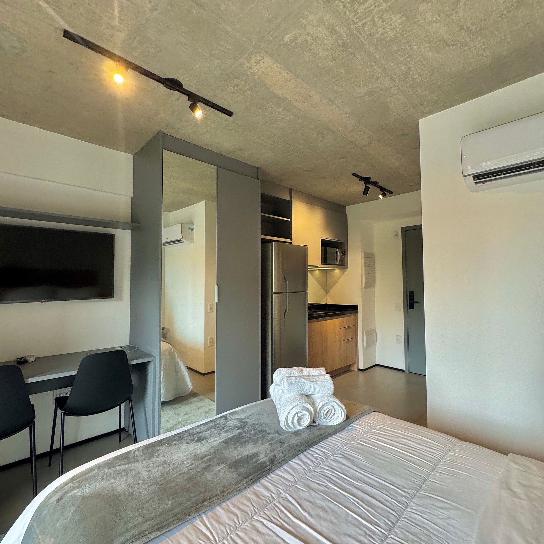 Aqui cada detalhe foi pensado para tornar sua estadia única: cozinha completa com fogão, micro-ondas, cafeteira, geladeira, quarto com cama de casal, blackout, enxoval completo, travesseiros, mantas/edredom para aqueles dias mais frios, sacada, wi-fi, ar-condicionado, TV Smart e um espaço para home office. O grande destaque do estúdio é uma sacada ampla, perfeita para trabalhar, relaxar, ler um livro ou simplesmente apreciar momentos tranquilos.