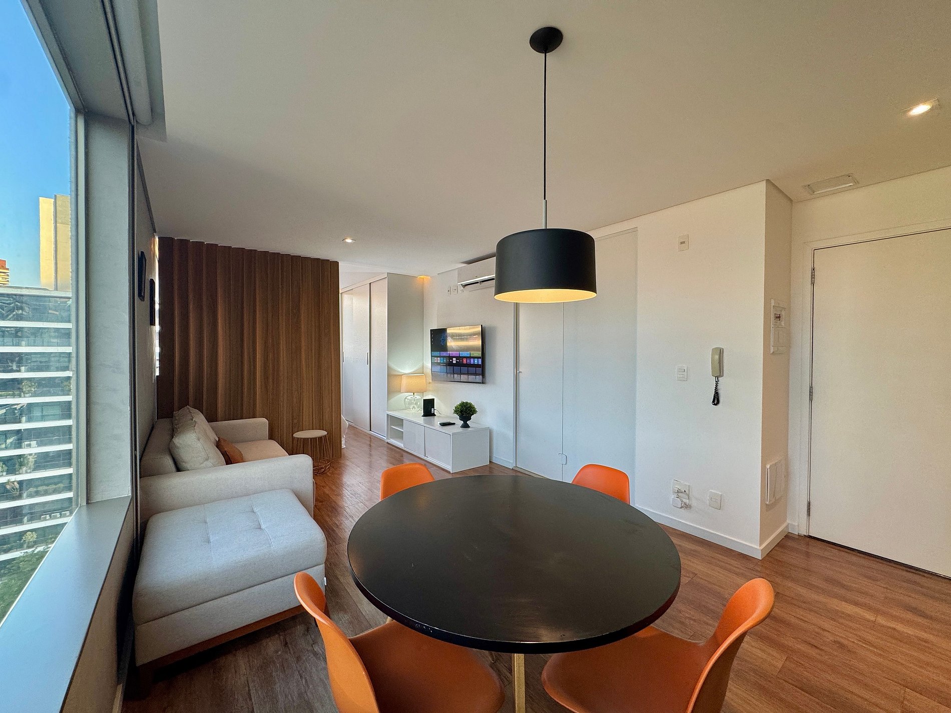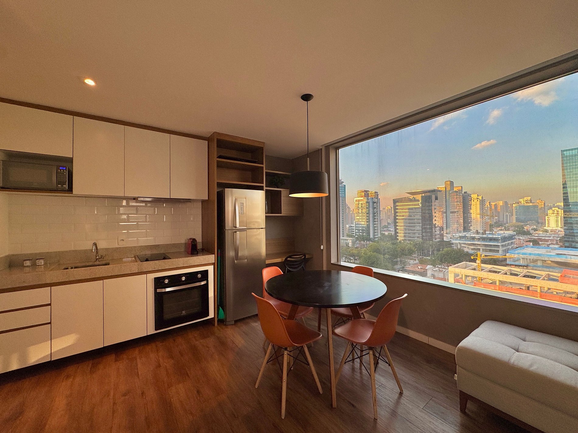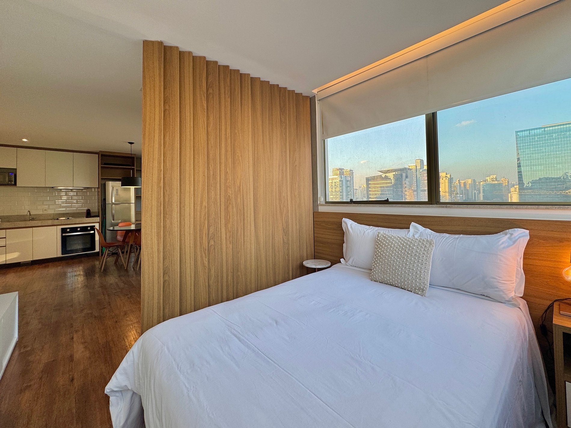 Aqui cada detalhe foi pensado para tornar sua estadia única: cozinha completa com fogão, micro-ondas, forno, cafeteira, geladeira, quarto com cama de casal,sofá, blackout, enxoval completo, travesseiros, mantas/edredom para aqueles dias mais frios, wi-fi, ar-condicionado, TV Smart, espaço para home office e vaga de garagem. O grande destaque do estúdio é sua amplitude e uma moldura na área da sala que capta a vista do bairro e garante iluminação natural. Ideal para quem vem a trabalho ou a passeio devido à sua excelente localização.