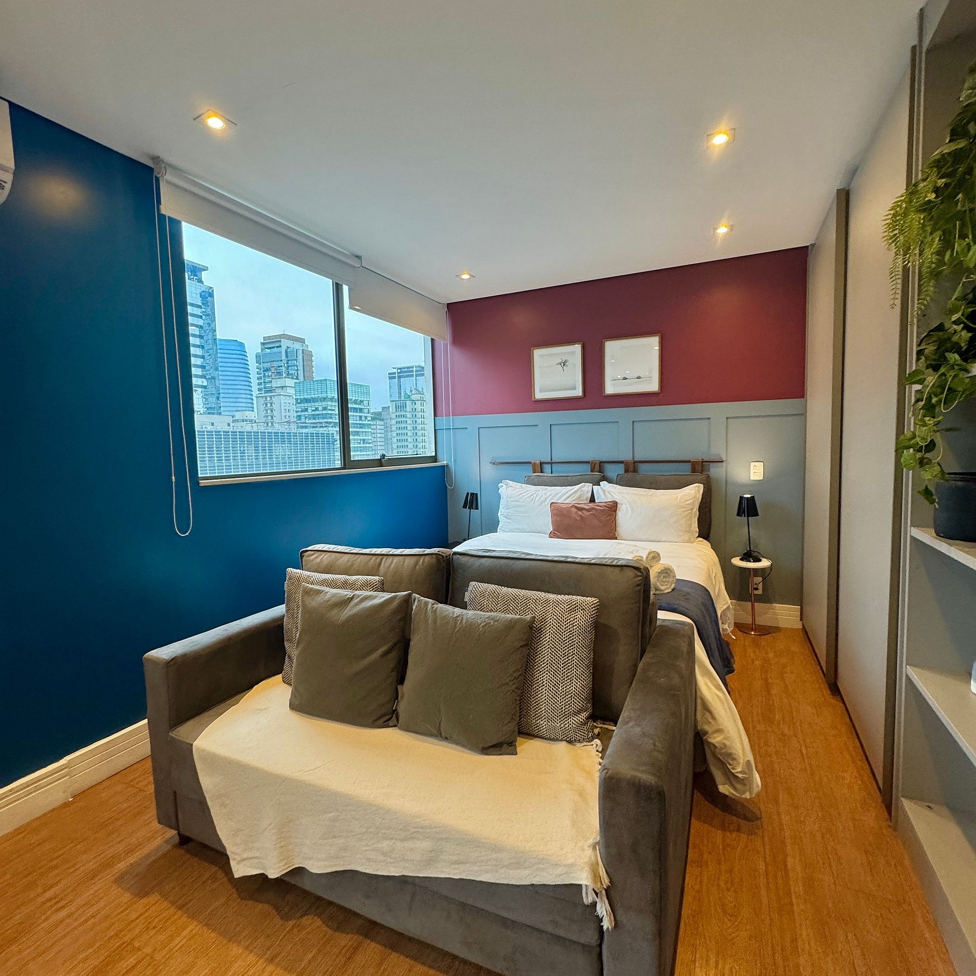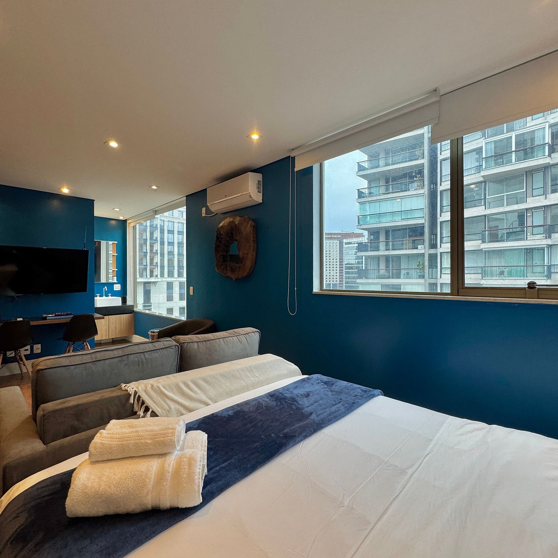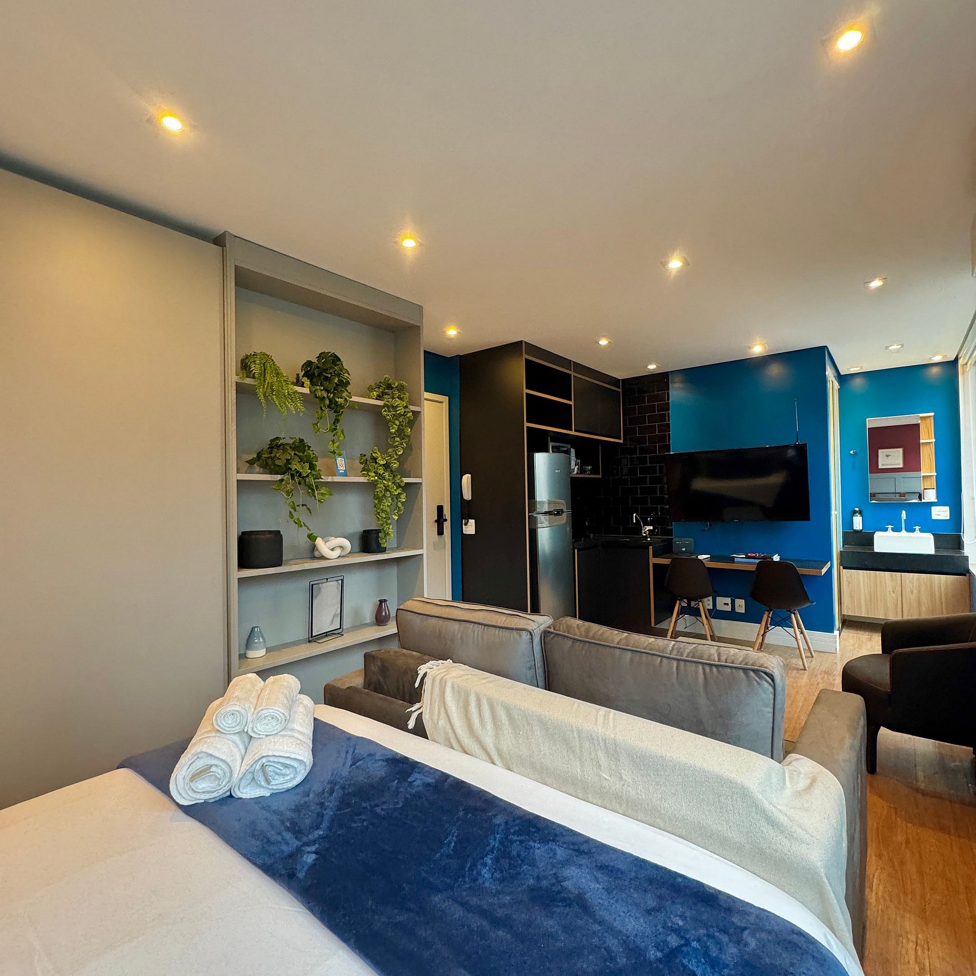 Aqui cada detalhe foi pensado para tornar sua estadia única: cozinha completa com fogão, micro-ondas, cafeteira, geladeira, quarto com cama de casal, sofá cama, blackout, enxoval completo, travesseiros, mantas/edredom para aqueles dias mais frios, wi-fi, ar-condicionado, TV Smart, espaço para home office e vaga de garagem. Ideal para quem vem a trabalho ou a passeio devido à sua excelente localização.