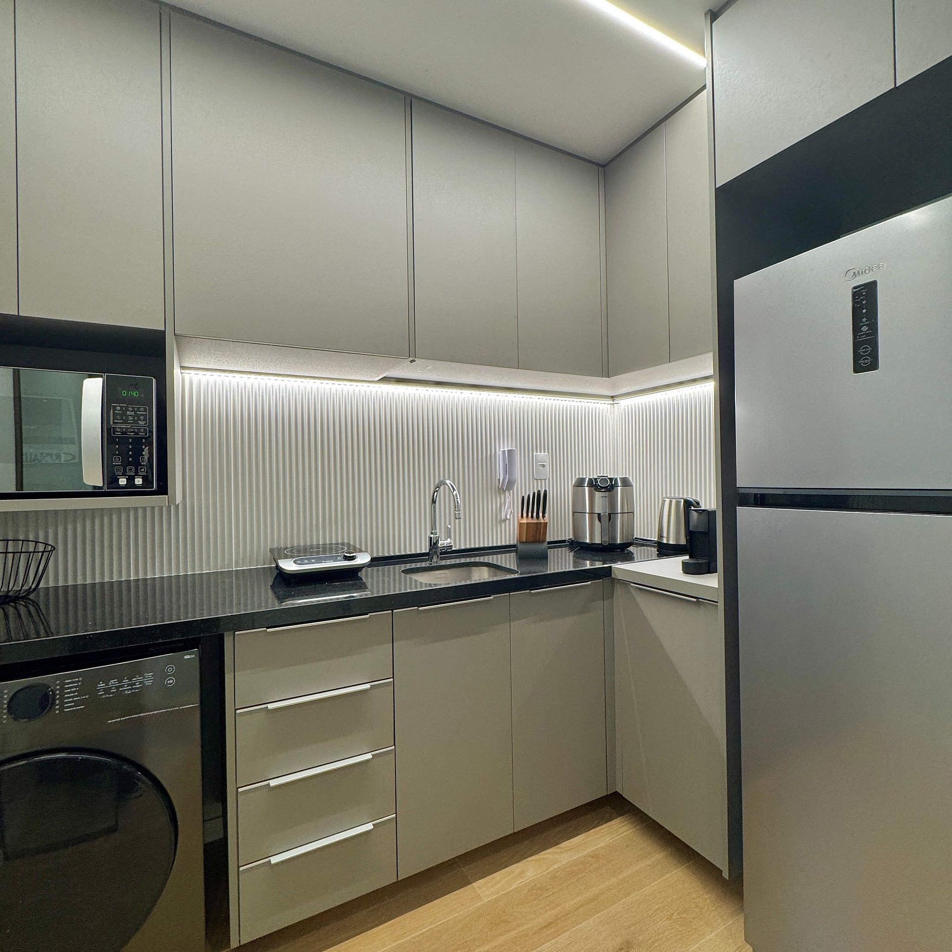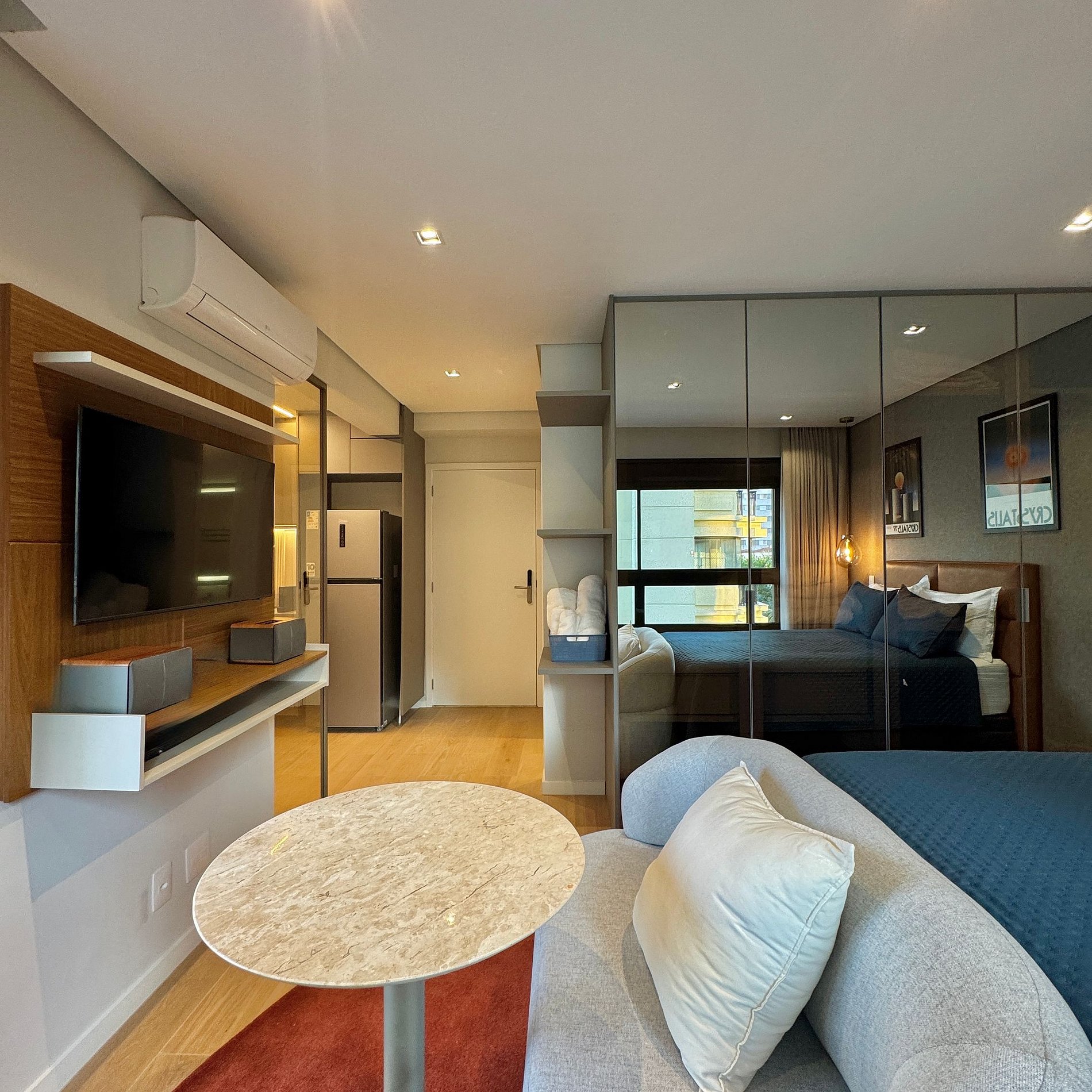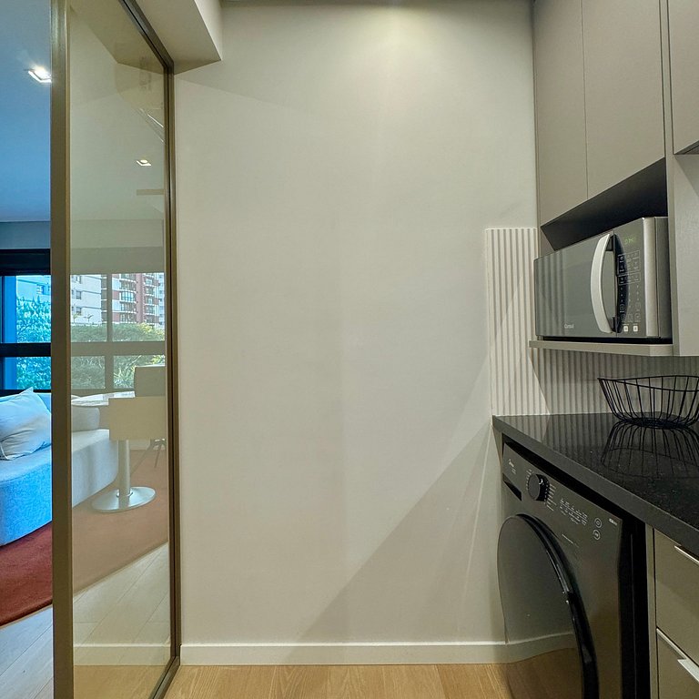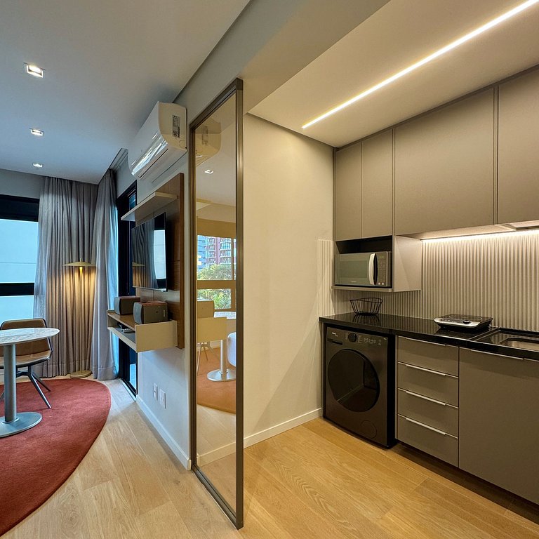 Aqui cada detalhe foi pensado para tornar sua estadia única: cozinha completa com fogão, micro-ondas, cafeteira e geladeira, máquina de lavar. O quarto conta cama queen, sofá, blackout, enxoval completo, travesseiros, mantas/edredom para aqueles dias mais frios, wi-fi, ar-condicionado, TV Smart e um espaço para home office. O grande destaque é a decoração e a infraestrutura completa do estúdio e do prédio.