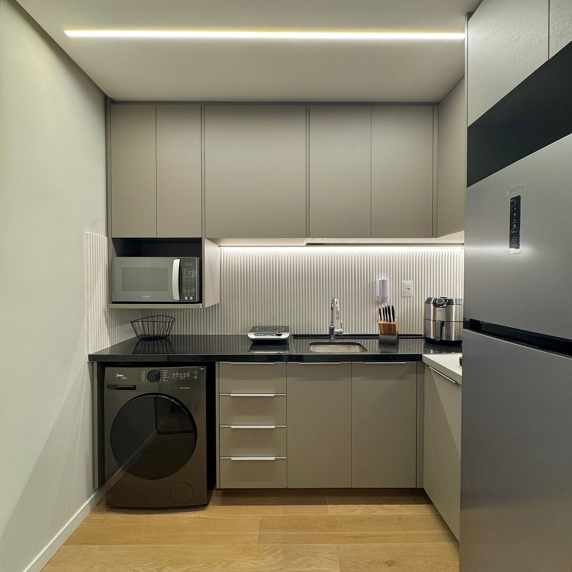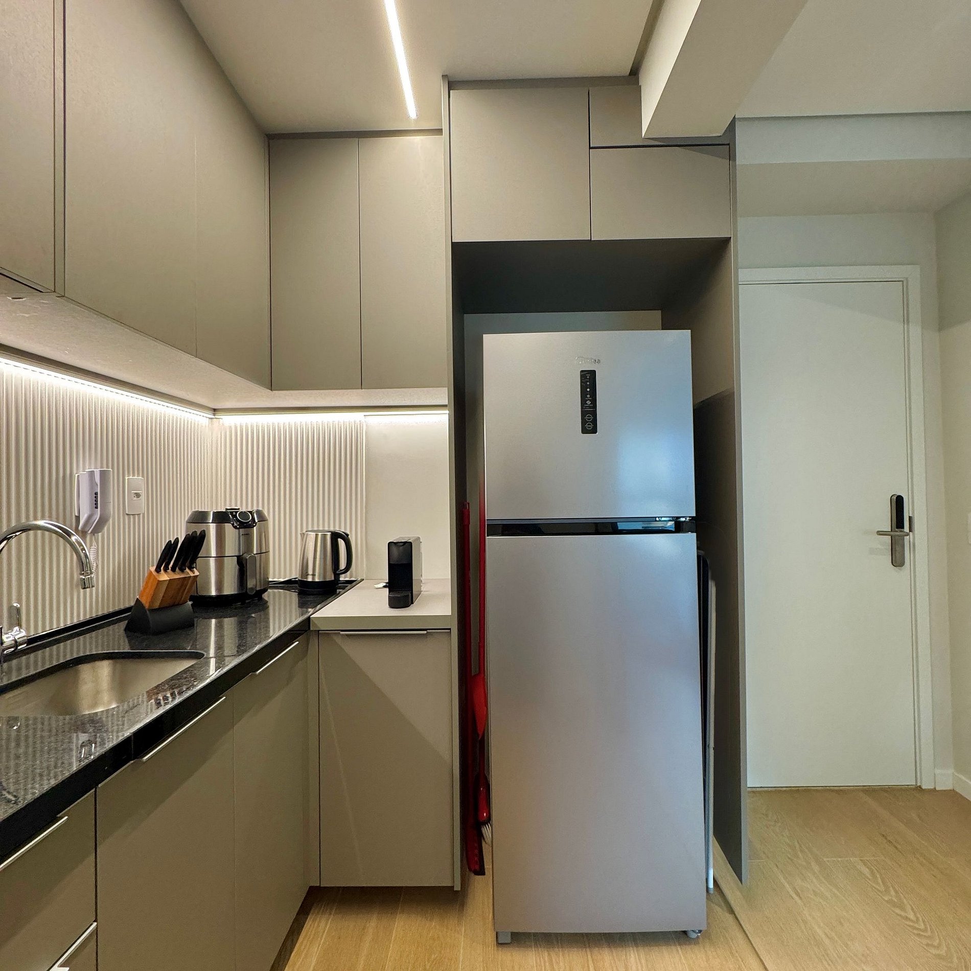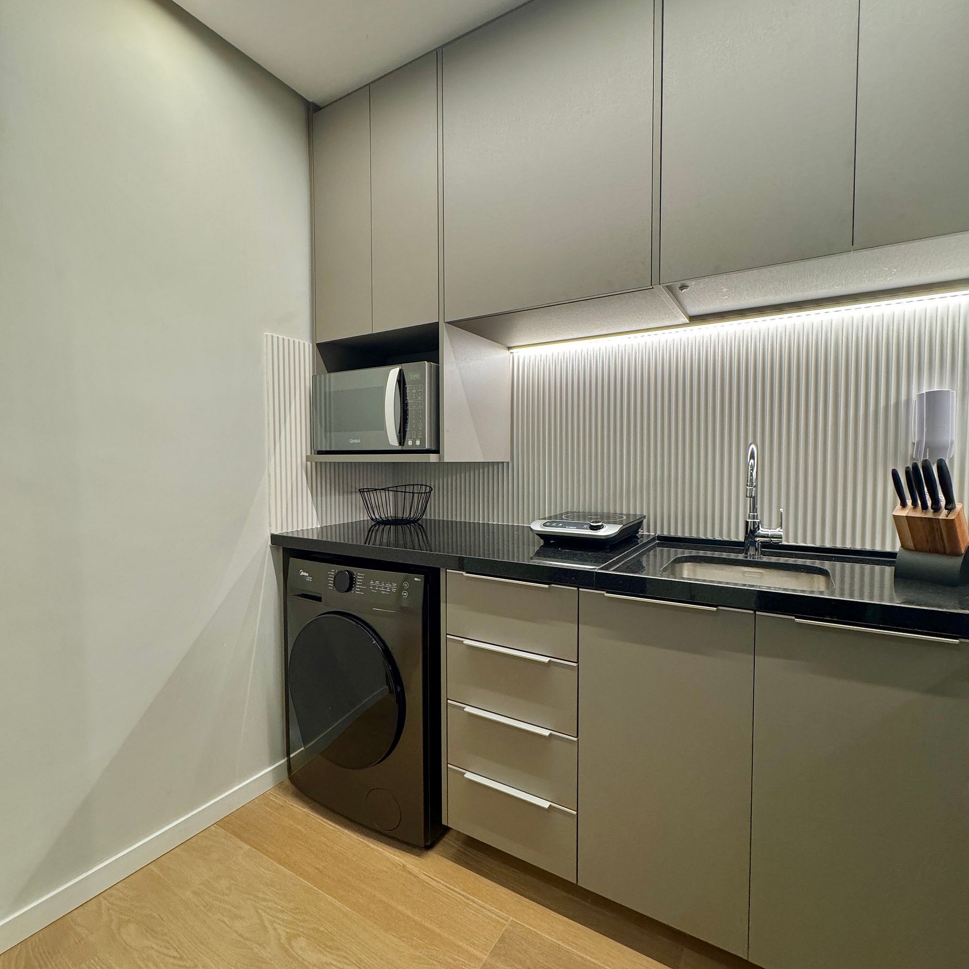 Aqui cada detalhe foi pensado para tornar sua estadia única: cozinha completa com fogão, micro-ondas, cafeteira e geladeira, máquina de lavar. O quarto conta cama queen, sofá, blackout, enxoval completo, travesseiros, mantas/edredom para aqueles dias mais frios, wi-fi, ar-condicionado, TV Smart e um espaço para home office. O grande destaque é a decoração e a infraestrutura completa do estúdio e do prédio.