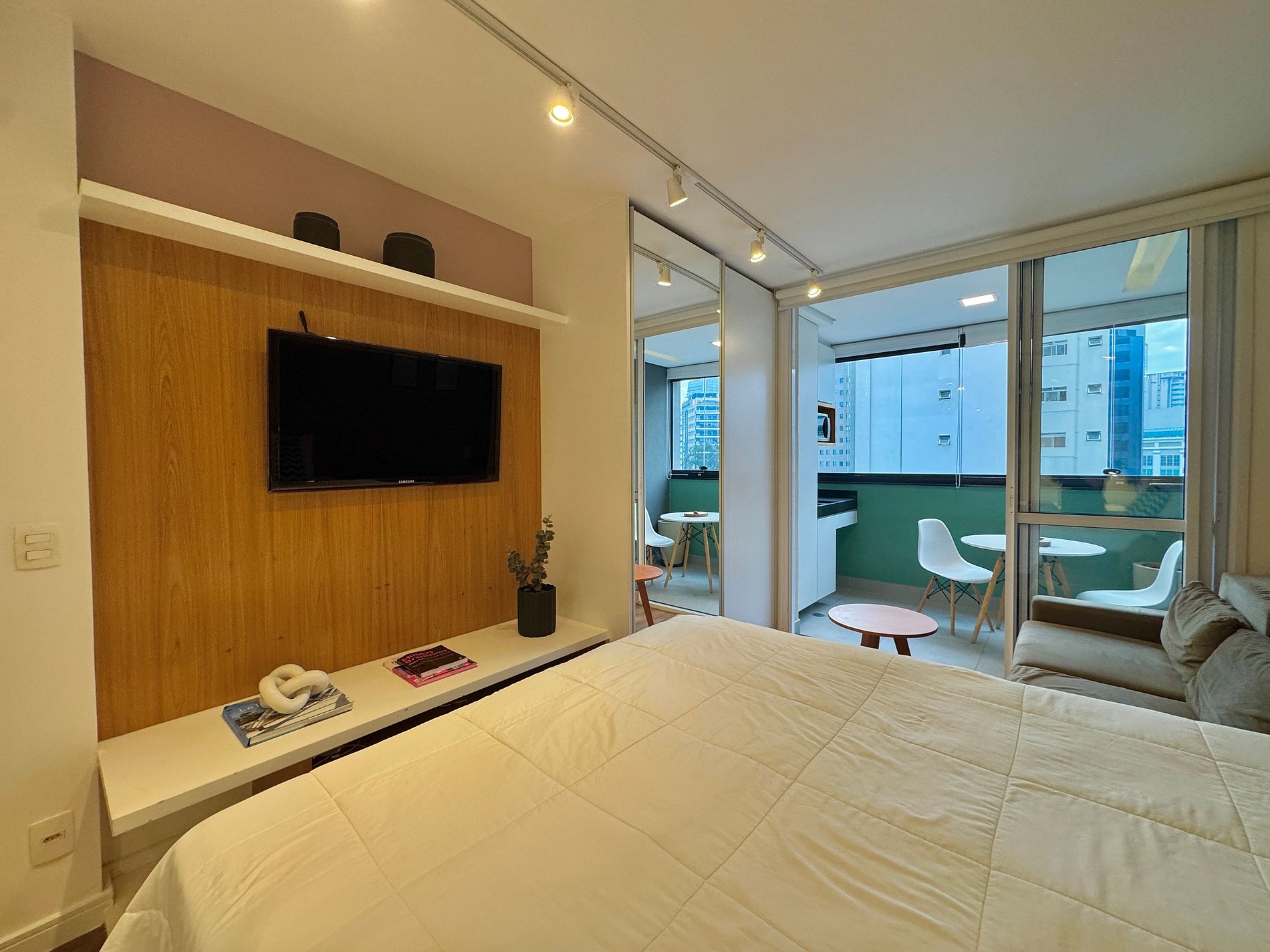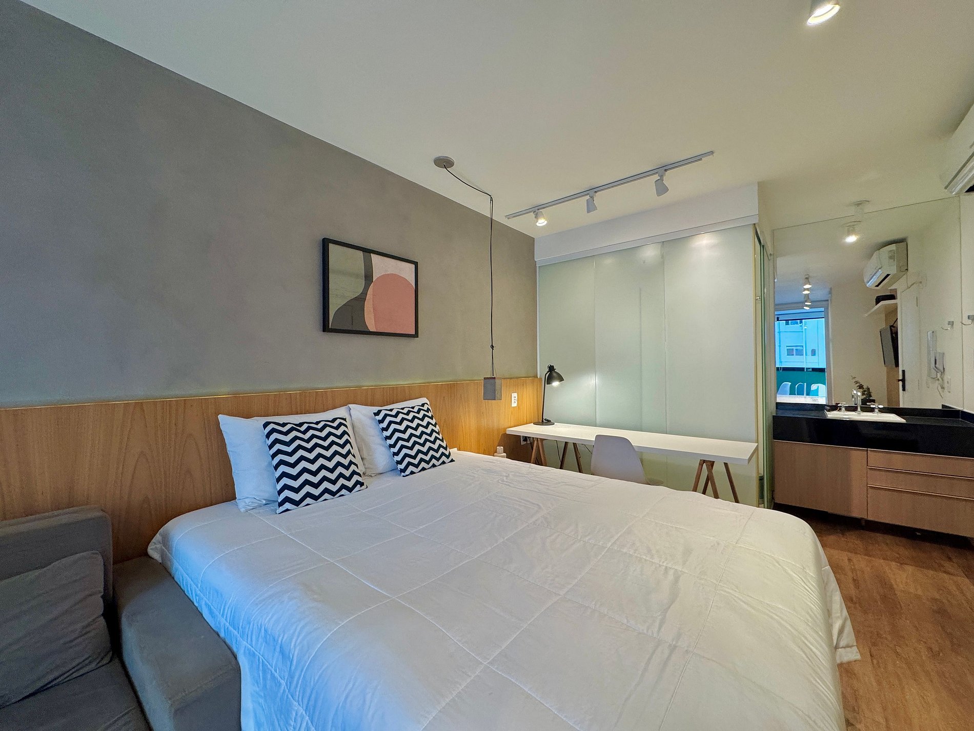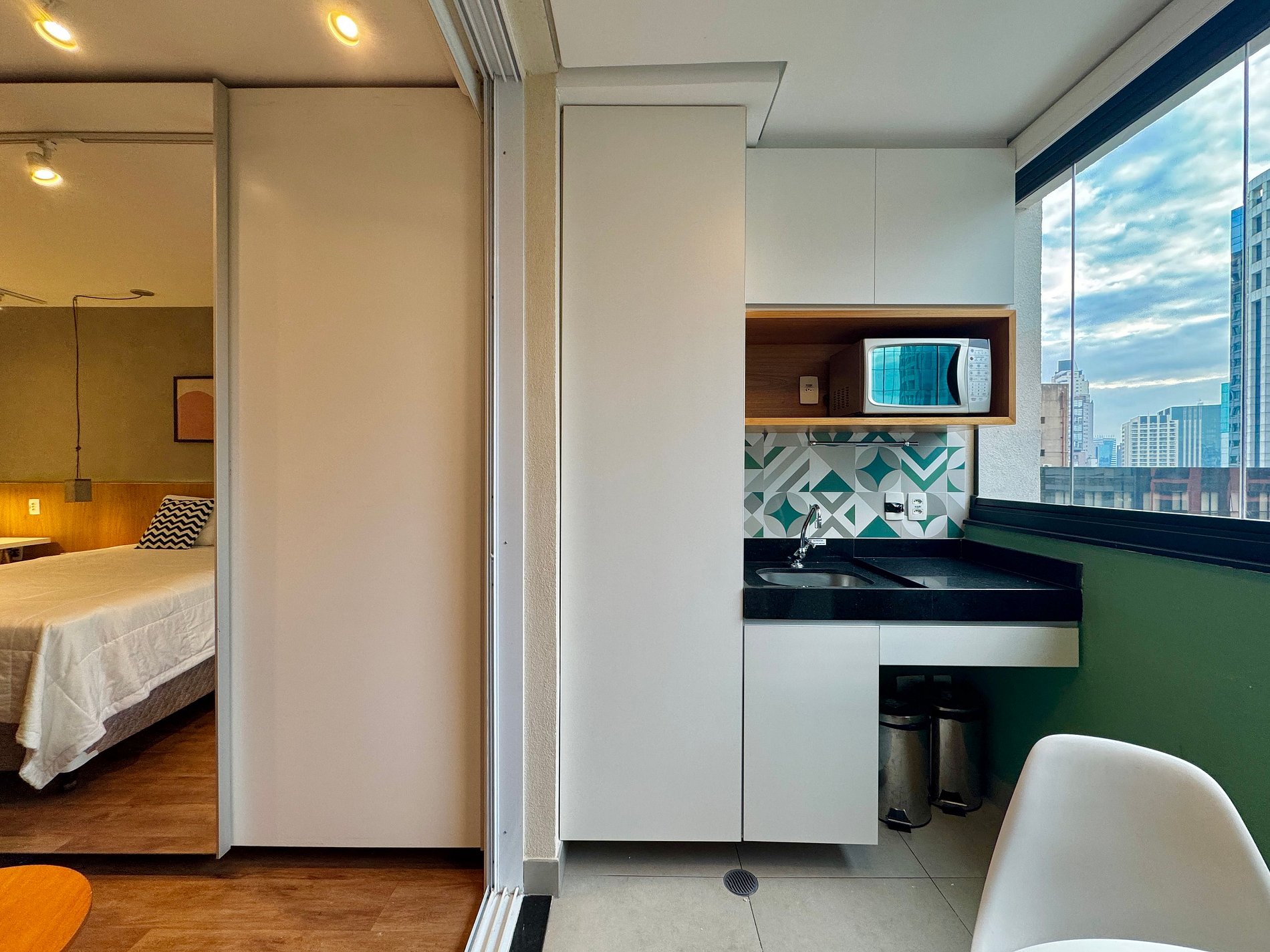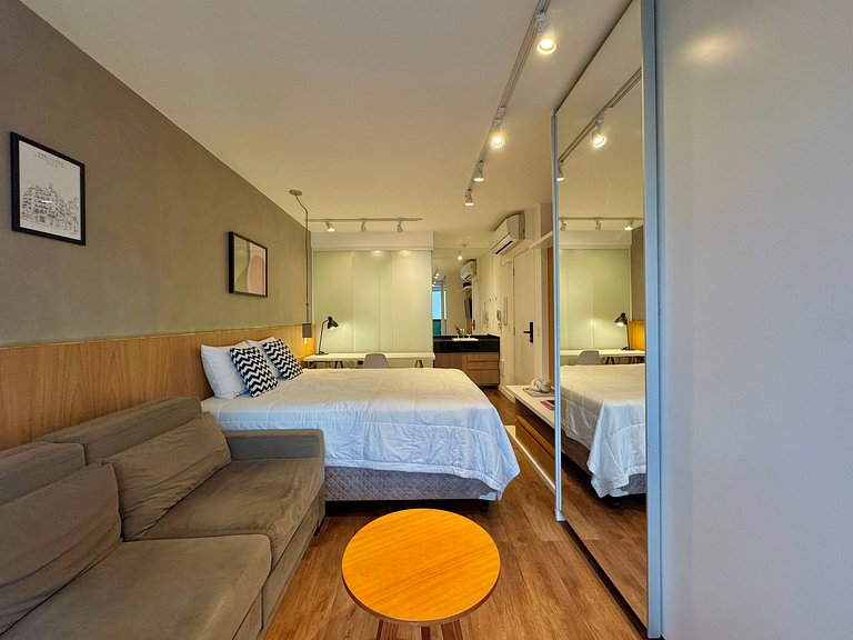 Aqui cada detalhe foi pensado para tornar sua estadia única: cozinha completa com fogão, micro-ondas, cafeteira, frigobar, quarto com cama de casal, sofa cama, blackout, enxoval completo, travesseiros e mantas/edredom para aqueles dias mais frios, wi-fi, ar-condicionado, TV Smart e um espaço para home office. O grande destaque é a sacada integrada que garante mais espaço para o studio e separa a área da cozinha.