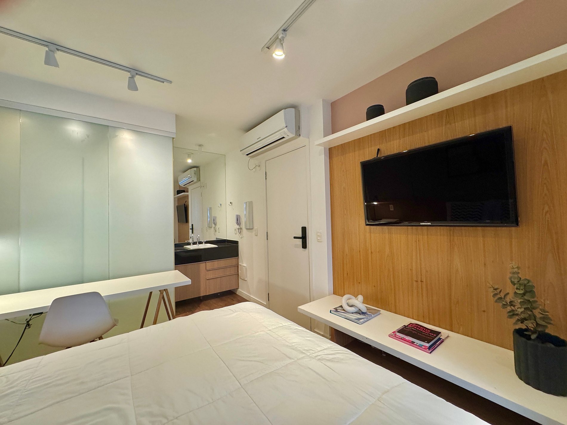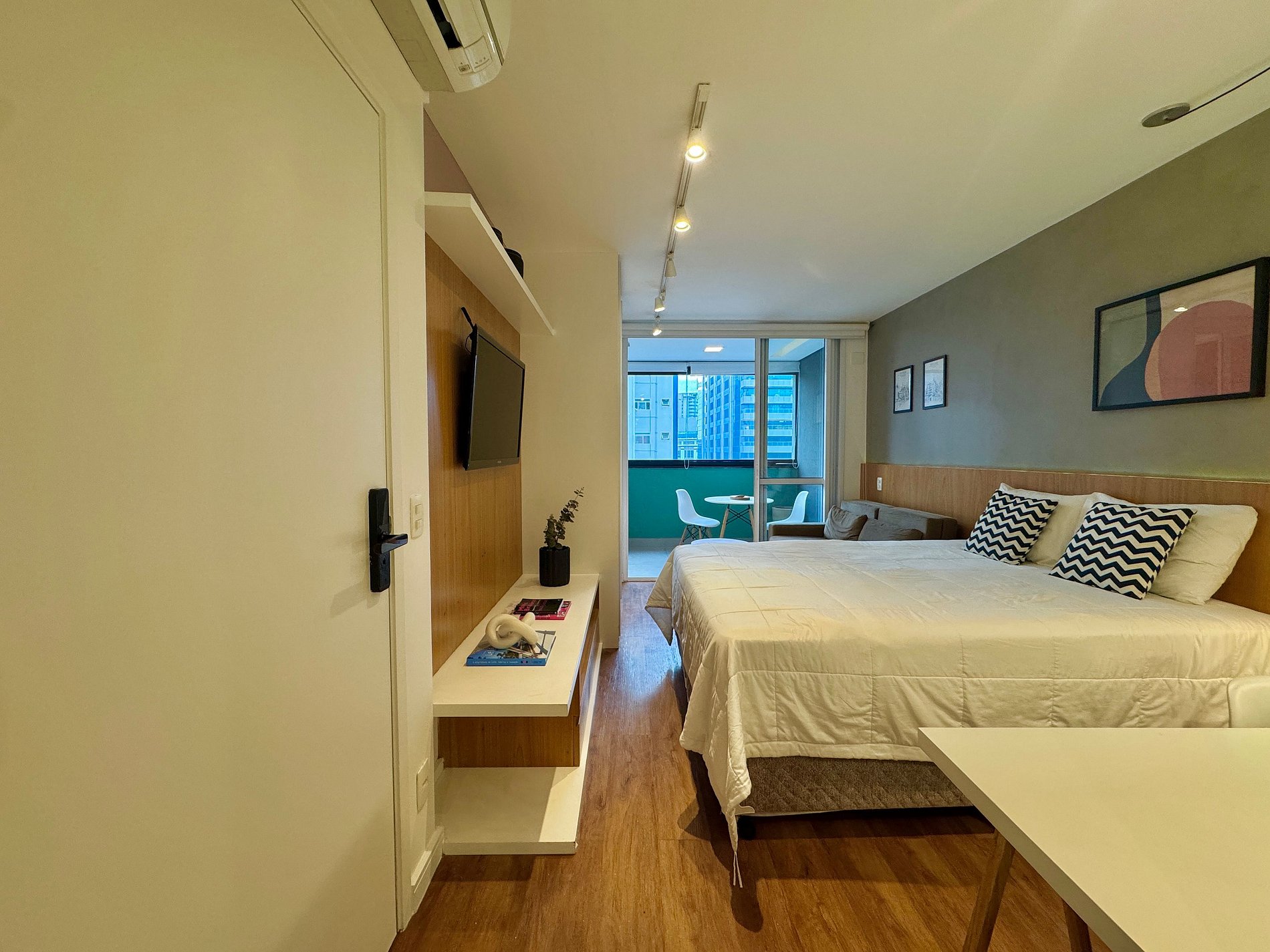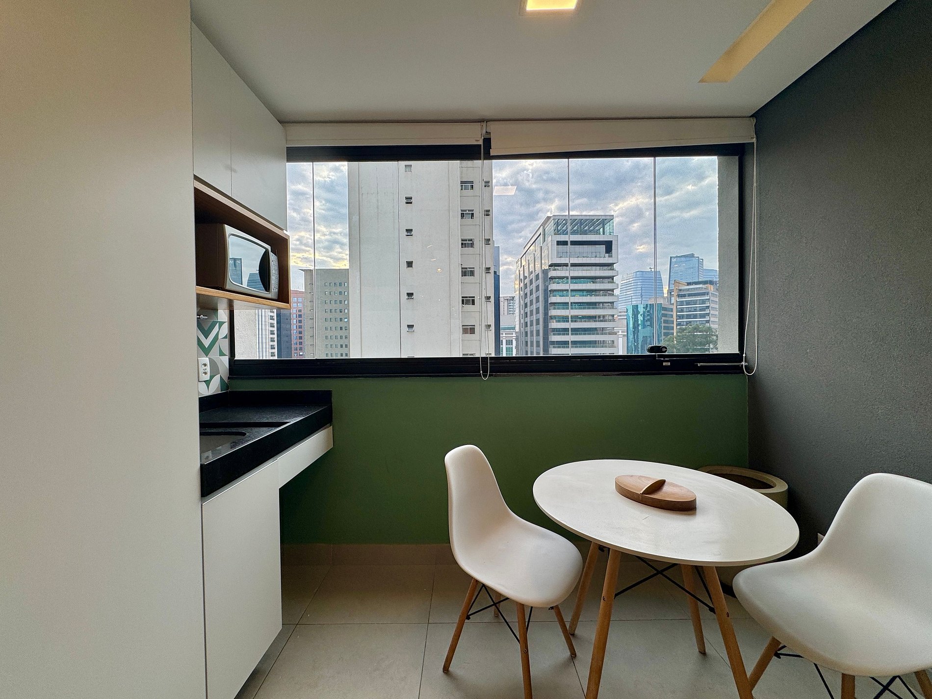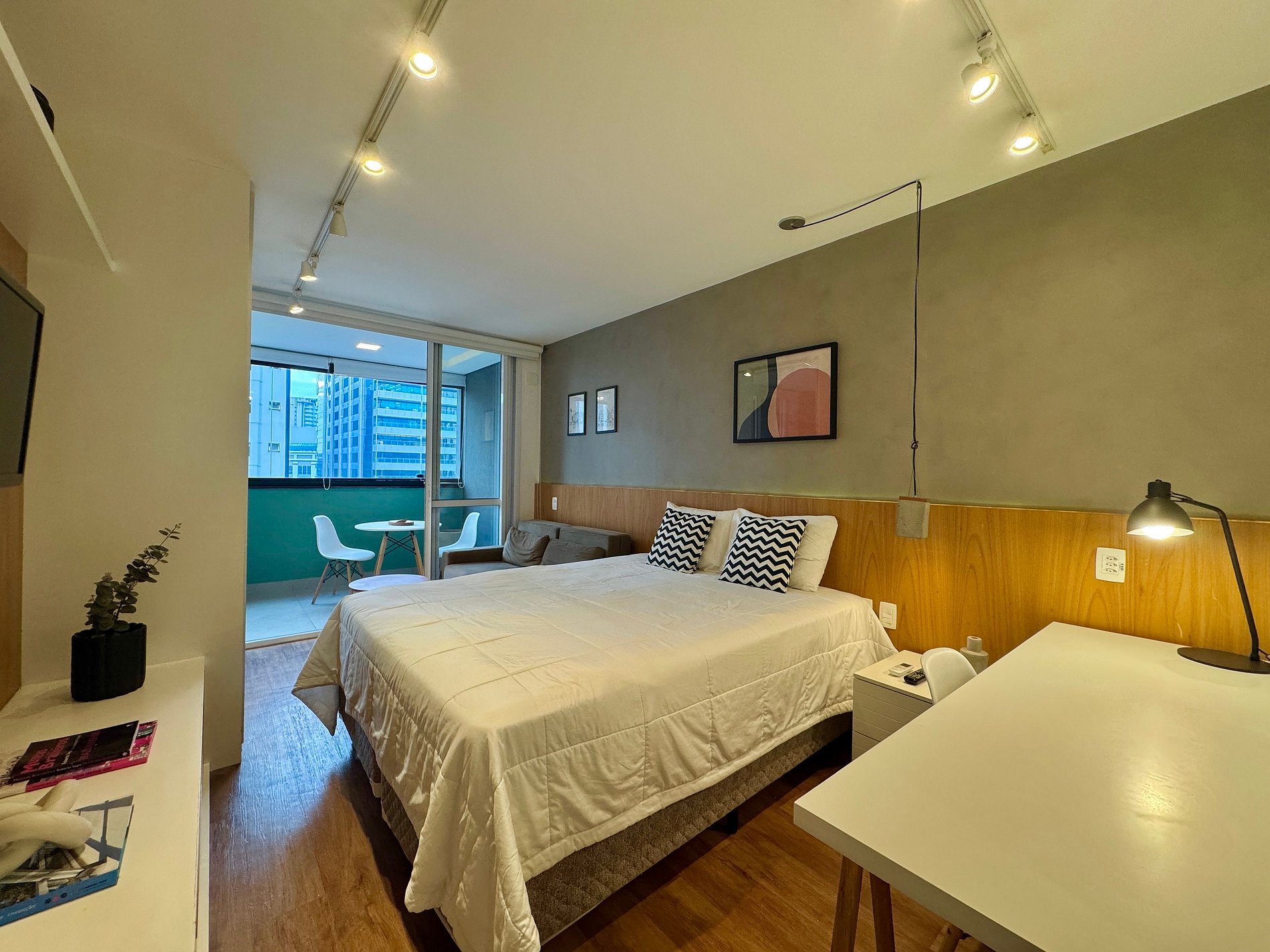 Aqui cada detalhe foi pensado para tornar sua estadia única: cozinha completa com fogão, micro-ondas, cafeteira, frigobar, quarto com cama de casal, sofa cama, blackout, enxoval completo, travesseiros e mantas/edredom para aqueles dias mais frios, wi-fi, ar-condicionado, TV Smart e um espaço para home office. O grande destaque é a sacada integrada que garante mais espaço para o studio e separa a área da cozinha.