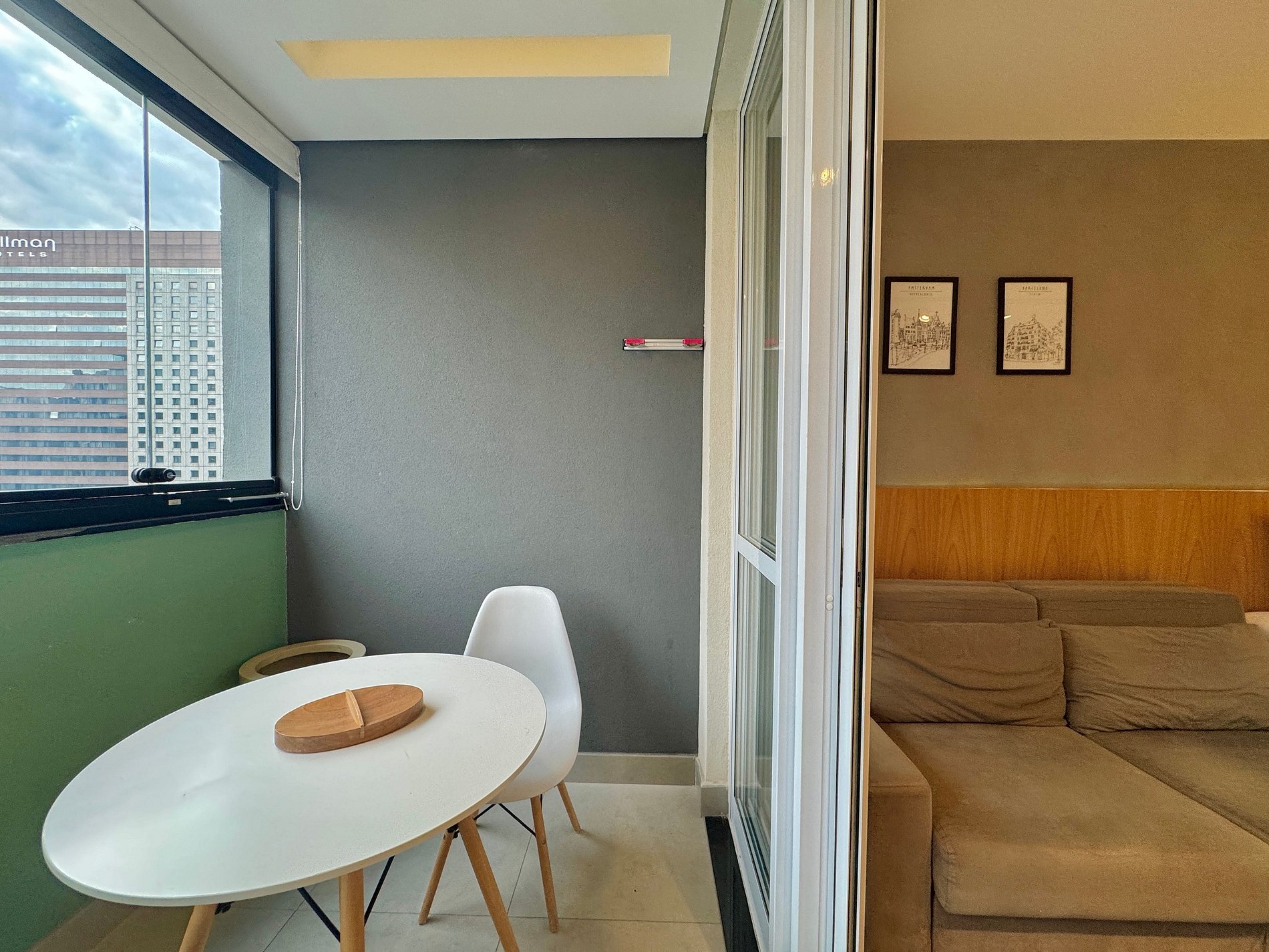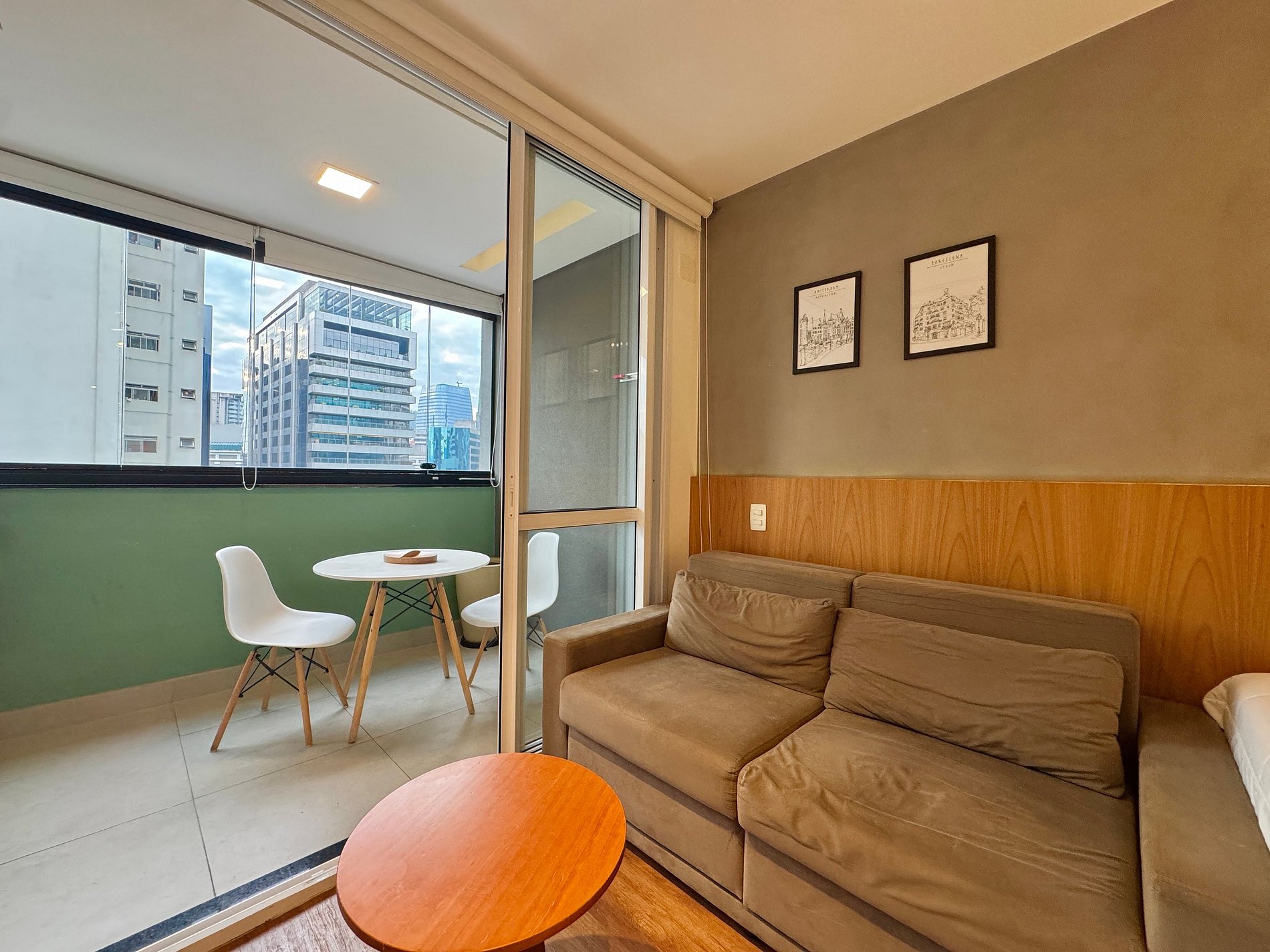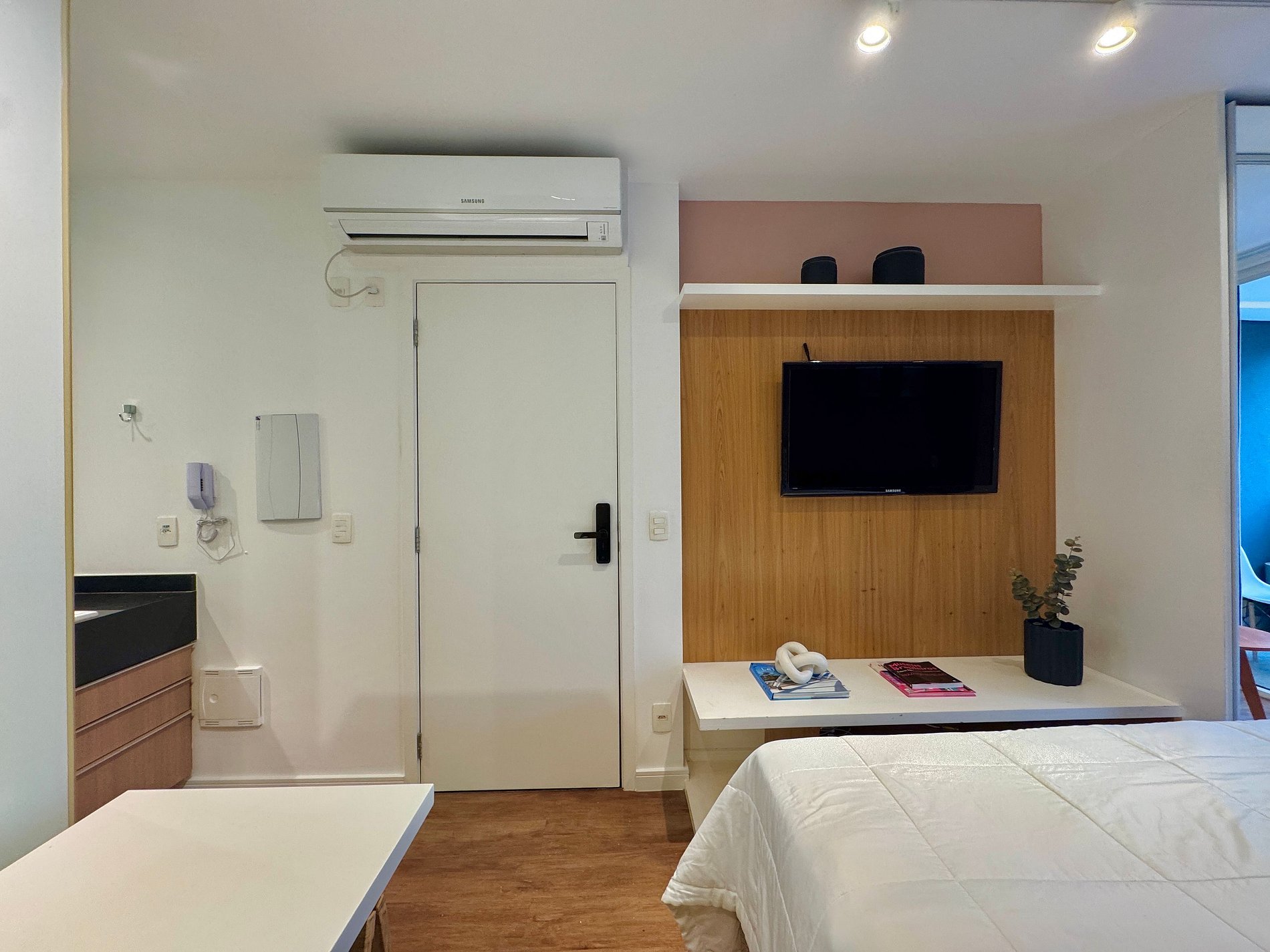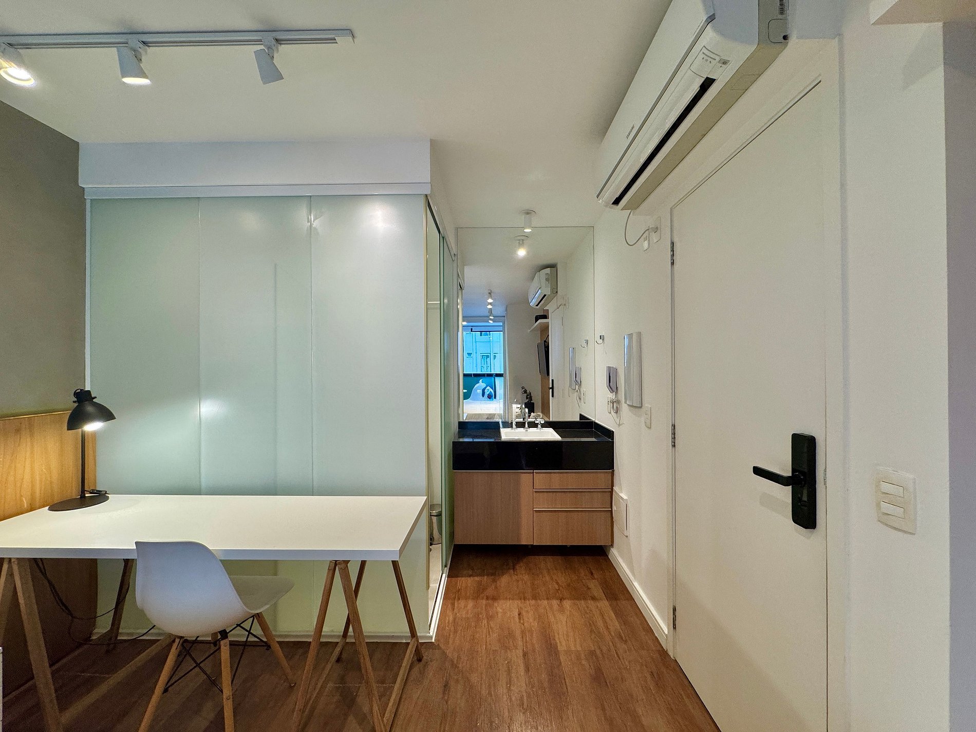 Aqui cada detalhe foi pensado para tornar sua estadia única: cozinha completa com fogão, micro-ondas, cafeteira, frigobar, quarto com cama de casal, sofa cama, blackout, enxoval completo, travesseiros e mantas/edredom para aqueles dias mais frios, wi-fi, ar-condicionado, TV Smart e um espaço para home office. O grande destaque é a sacada integrada que garante mais espaço para o studio e separa a área da cozinha.