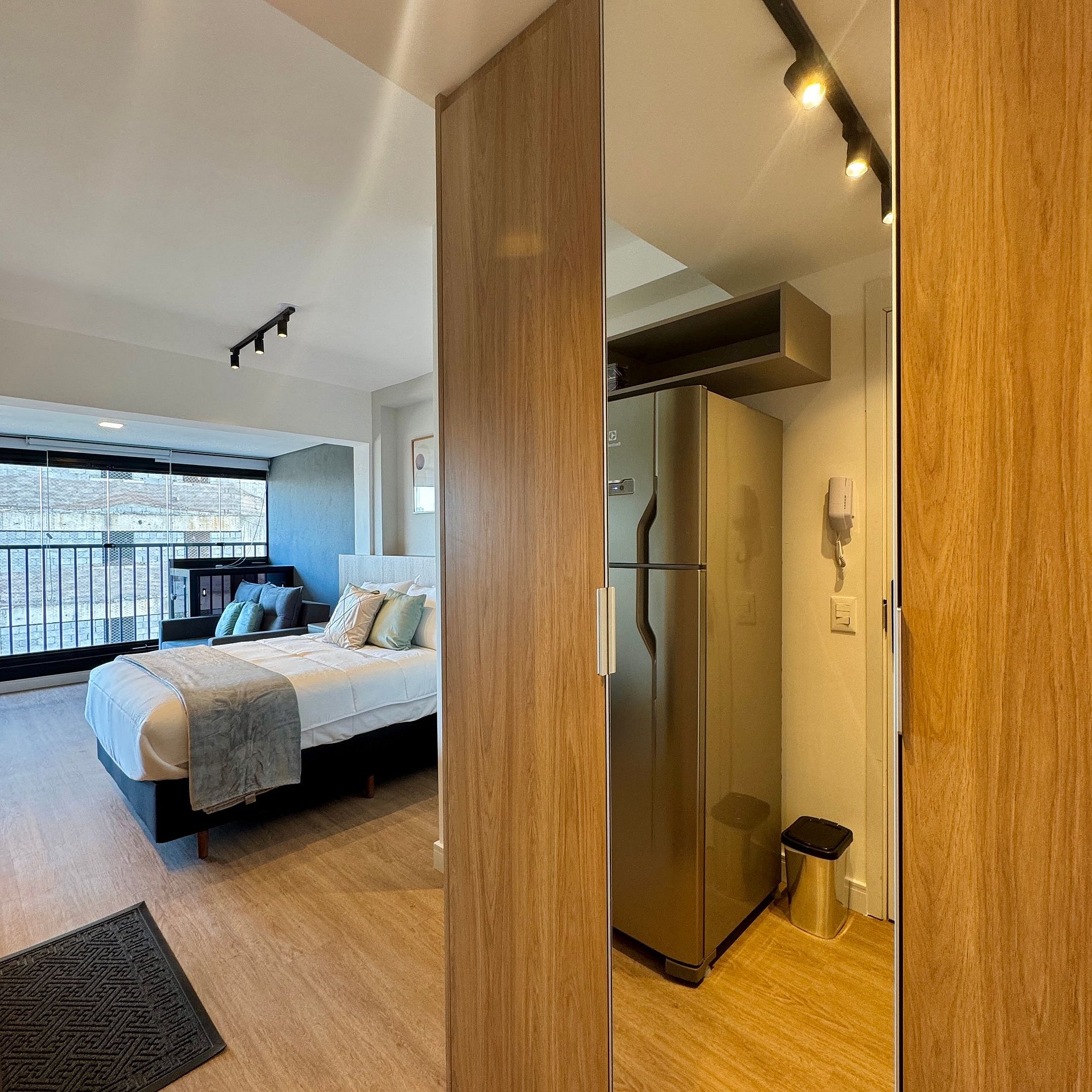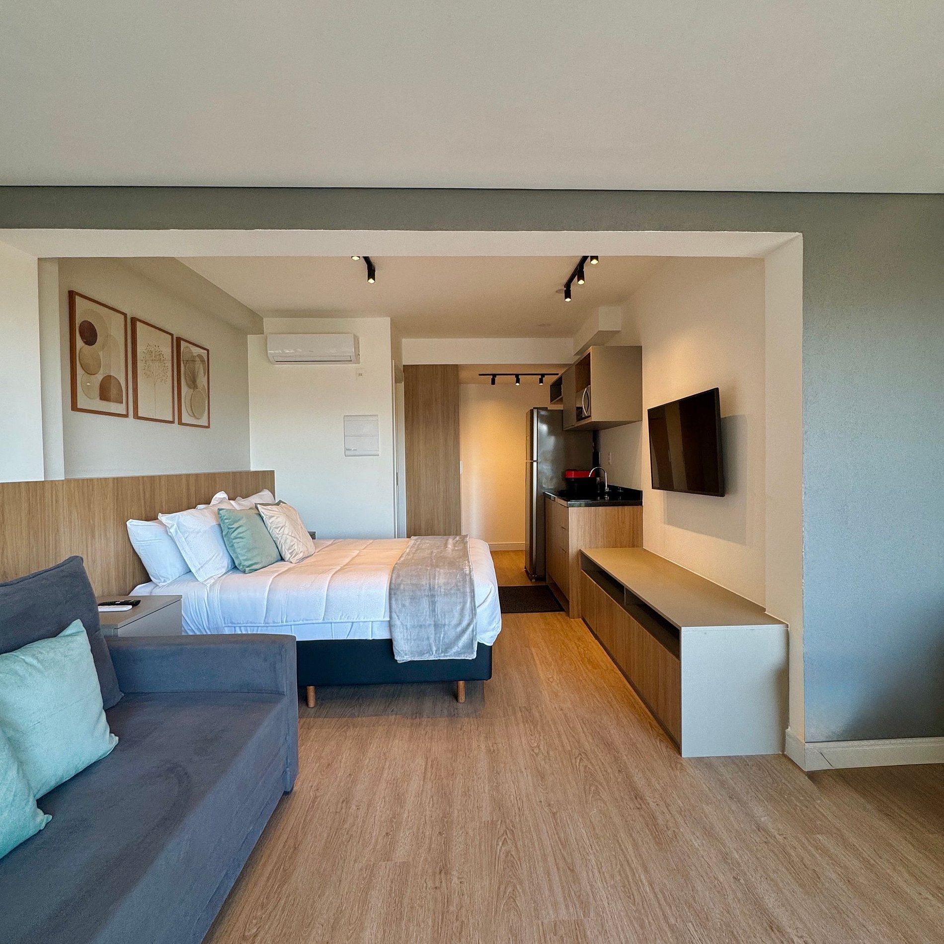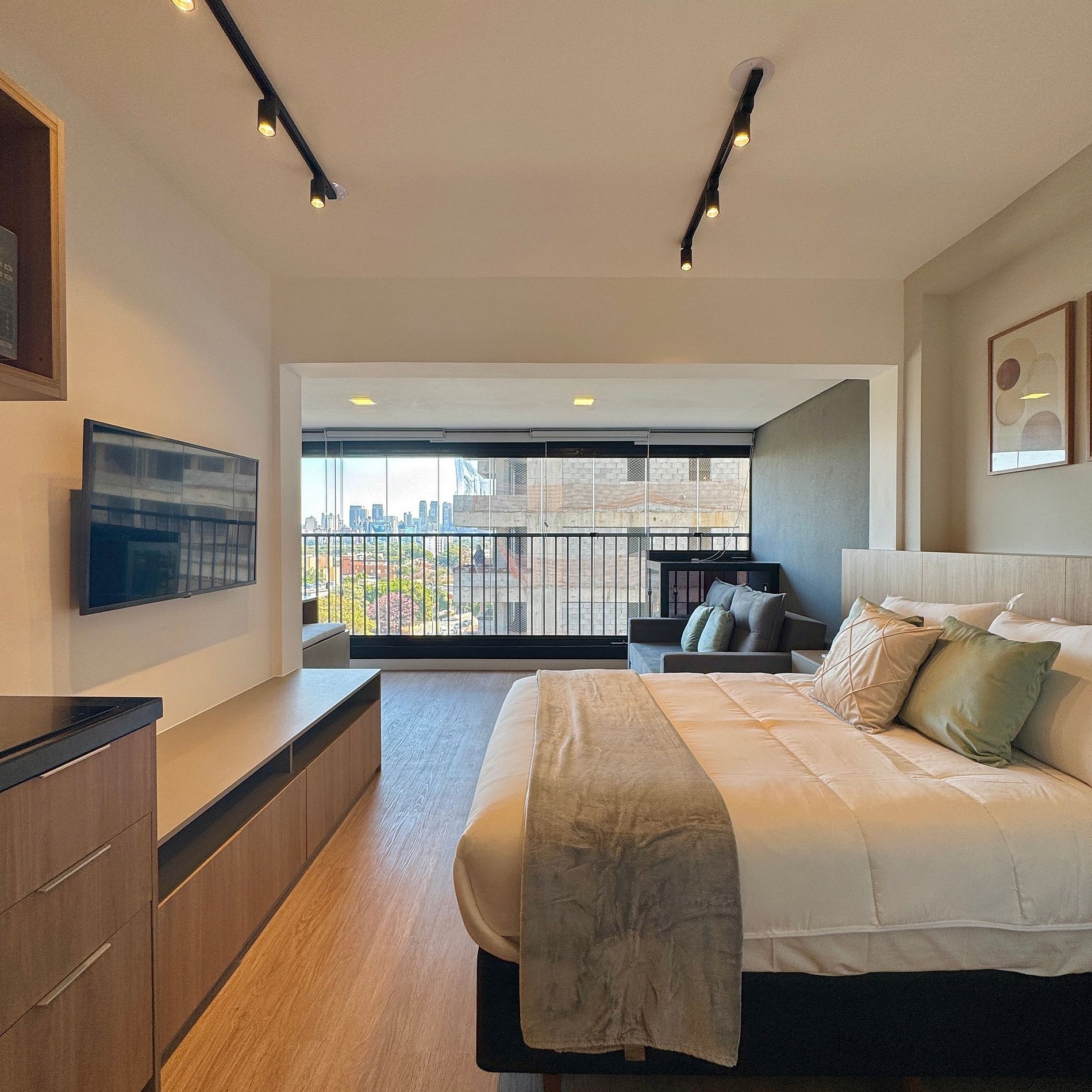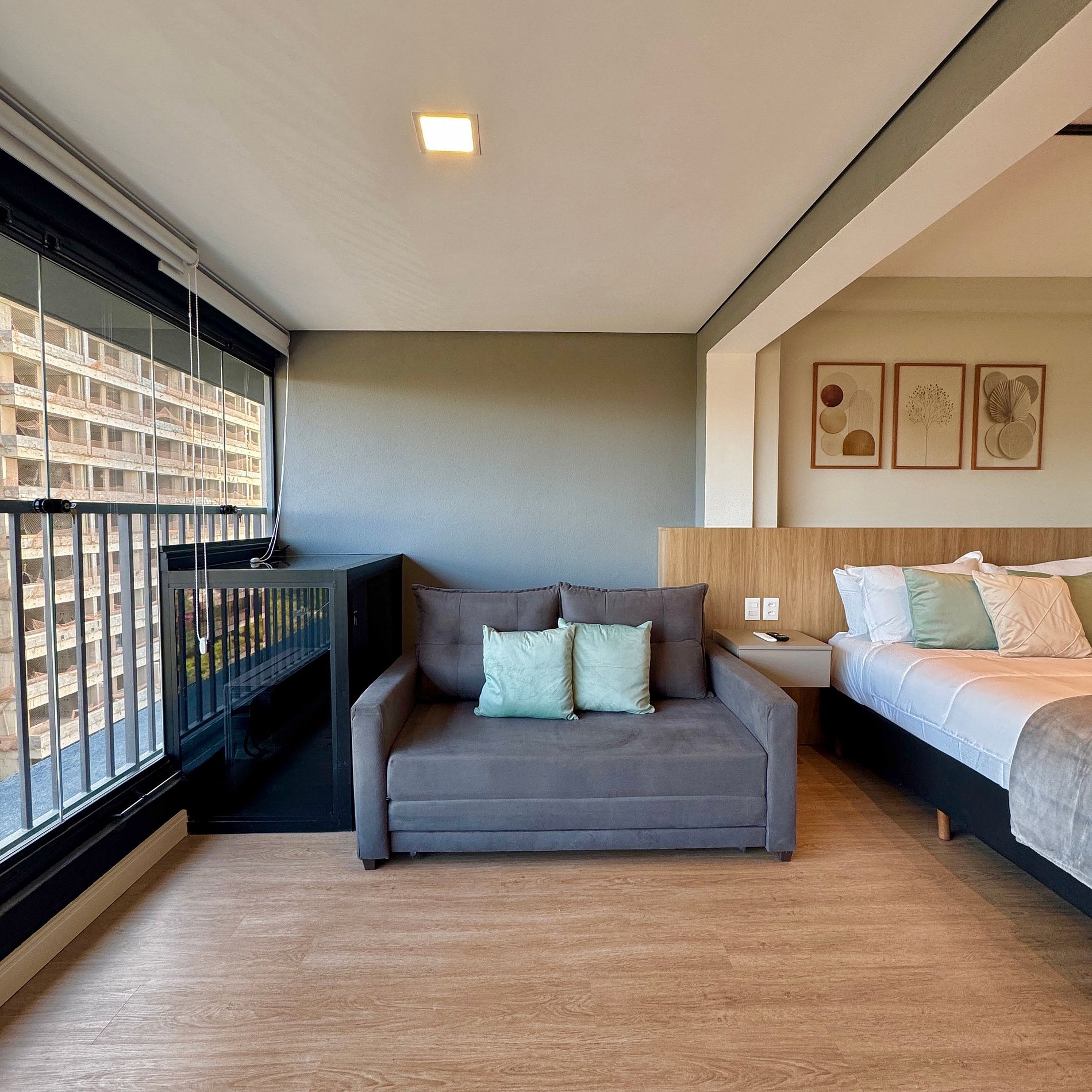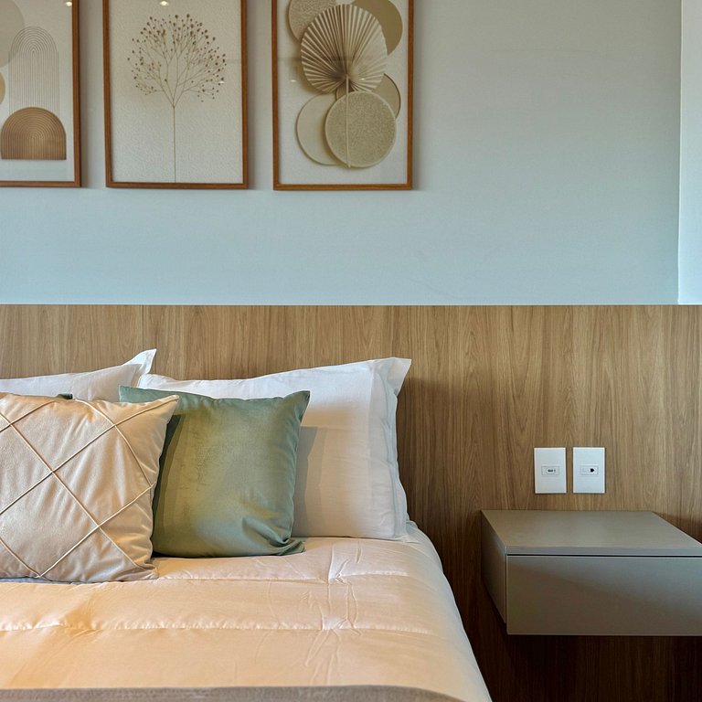 Aqui cada detalhe foi pensado para tornar sua estadia única: cozinha completa com fogão, micro-ondas, cafeteira e geladeira. O quarto com cama casal além de um sofá cama, blackout, wi-fi, ar-condicionado, TV Smart e um espaço para home office. O grande destaque é a sacada integrada que garante maior iluminação natural e espaço. O studio é perfeito para quem vem a trabalho ou a passeio, devido à excelente localização e facilidade de locomoção.