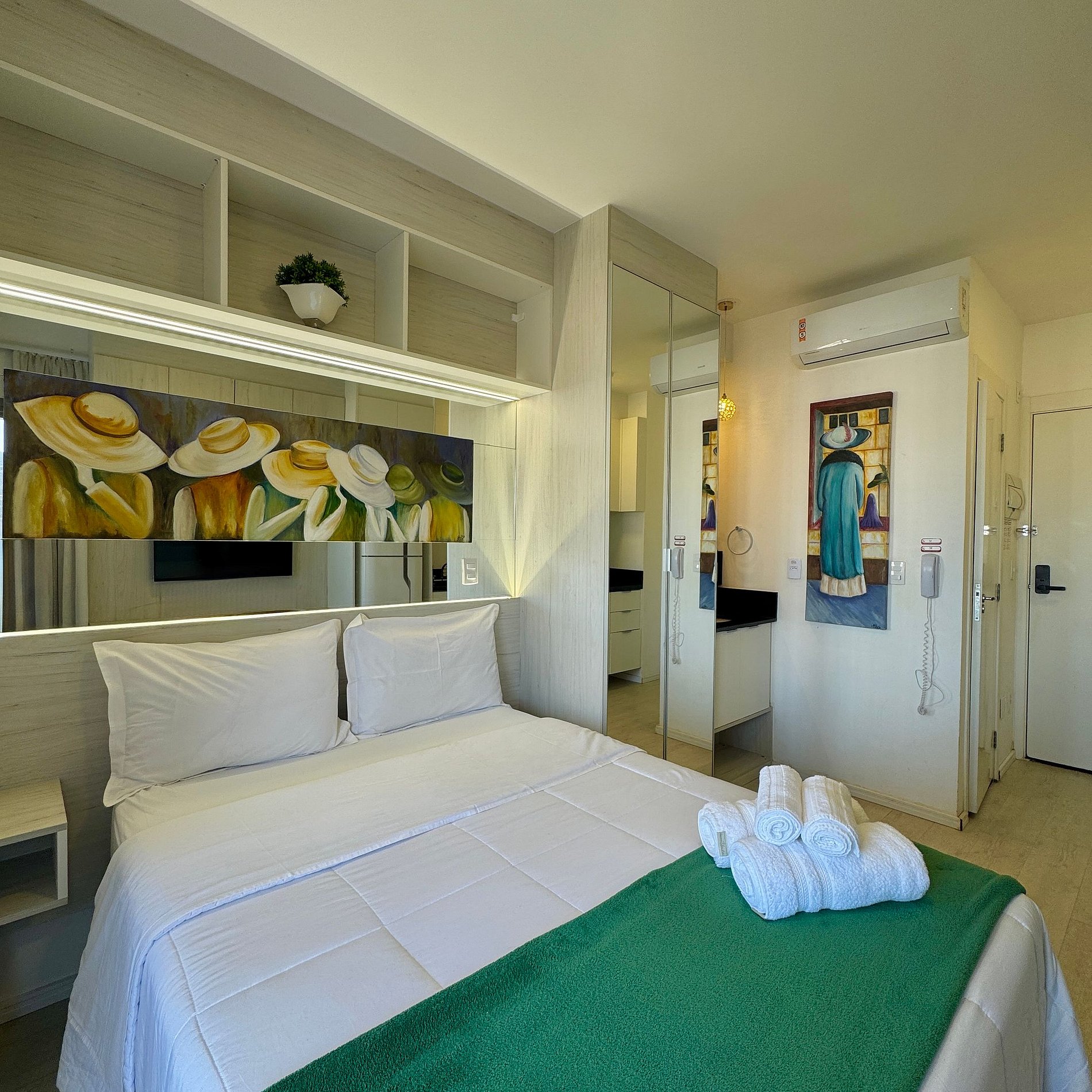 Aqui cada detalhe foi pensado para tornar sua estadia única: Cozinha completa com fogão, micro-ondas, cafeteira, geladeira, quarto com cama de casal, persiana com blackout, enxoval completo, travesseiros e mantas/edredom para aqueles dias mais frios, banheiro com chuveiro térmico a gás, secador de cabelo, ar-condicionado, TV Smart, wi-fi e uma varanda charmosa, ideal para desfrutar do café da manhã ou relaxar no fim da tarde. O grande destaque é a localização privilegiada e as áreas de lazer.