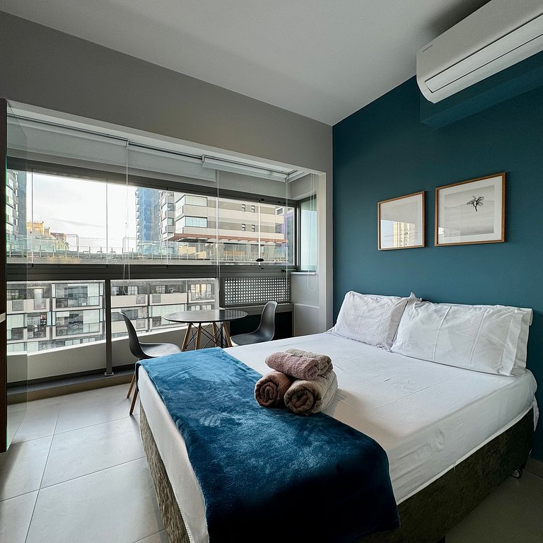Aqui cada detalhe foi pensado para tornar sua estadia única: cozinha completa com fogão, micro-ondas, cafeteira, frigobar, quarto com cama casal, persiana com blackout, enxoval completo, travesseiros, mantas/edredom para aqueles dias mais frios. O estúdio conta com: wi-fi, ar-condicionado, TV Smart e um espaço para home office.