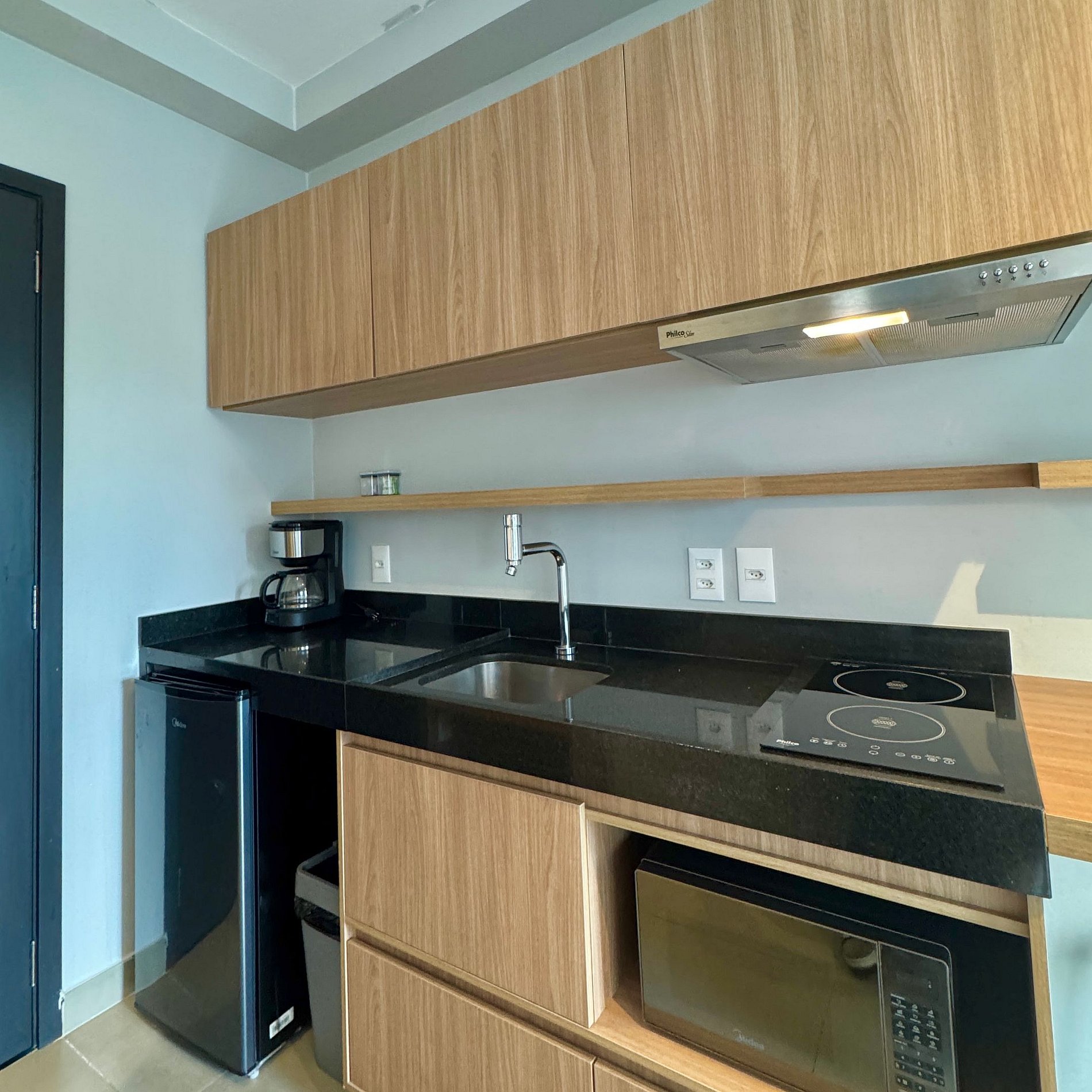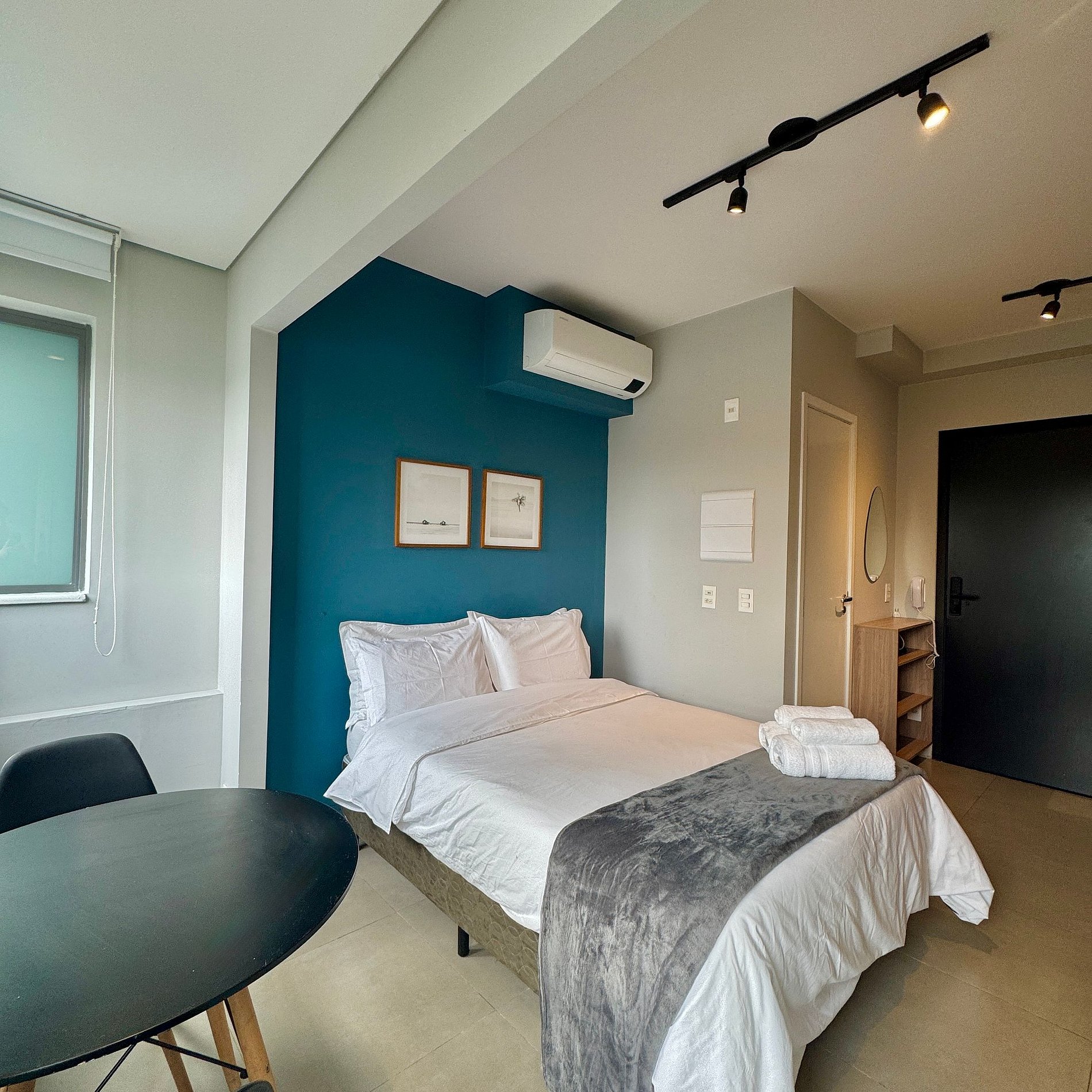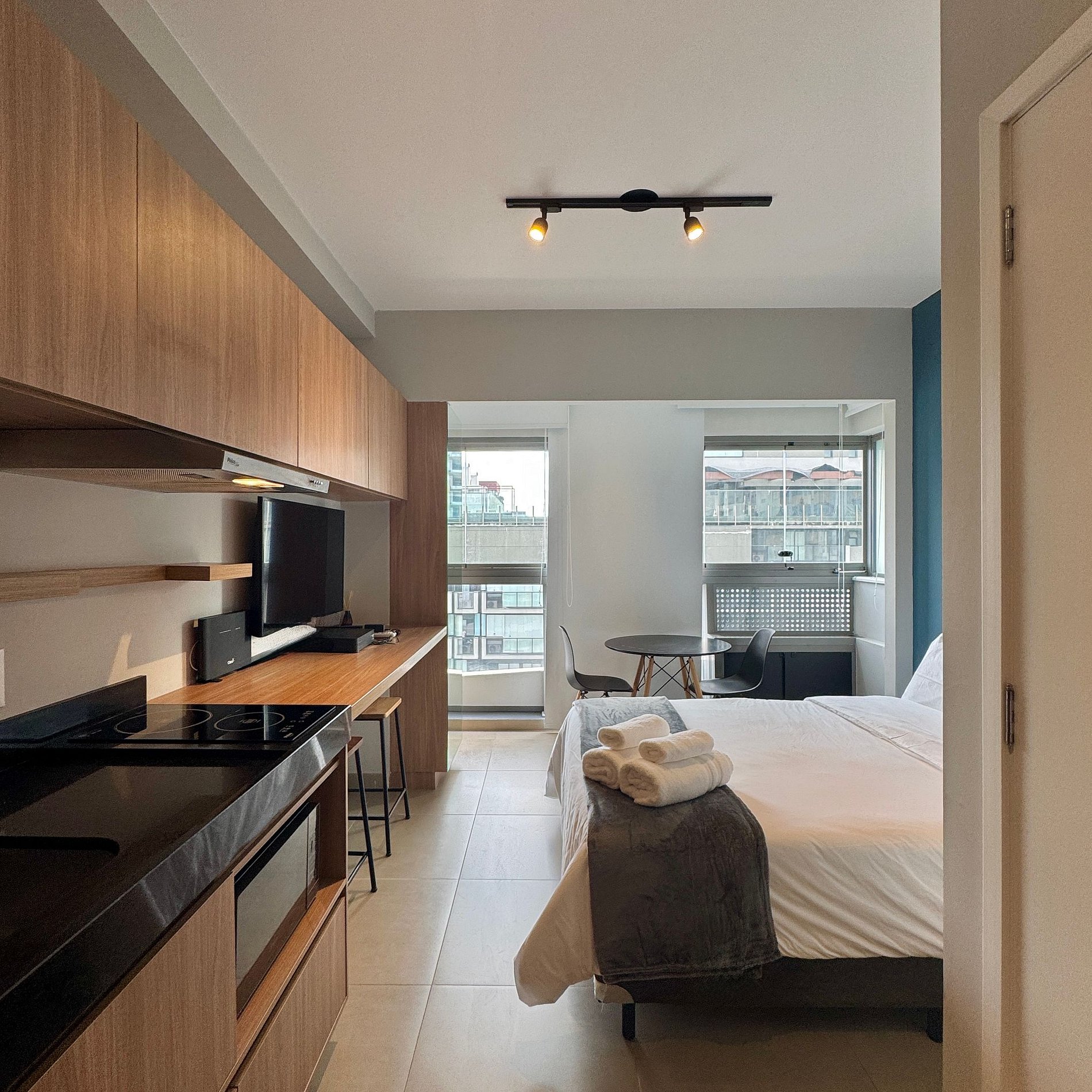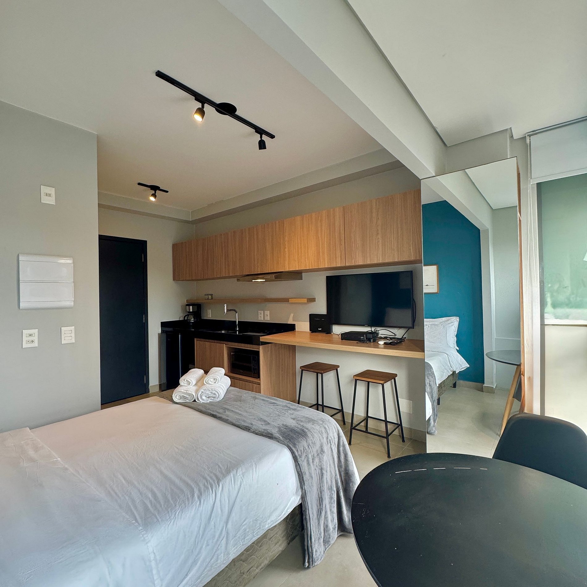 Aqui cada detalhe foi pensado para tornar sua estadia única: cozinha completa com fogão, micro-ondas, cafeteira, frigobar, quarto com cama casal, persiana com blackout, enxoval completo, travesseiros, mantas/edredom para aqueles dias mais frios. O estúdio conta com: wi-fi, ar-condicionado, TV Smart e um espaço para home office.