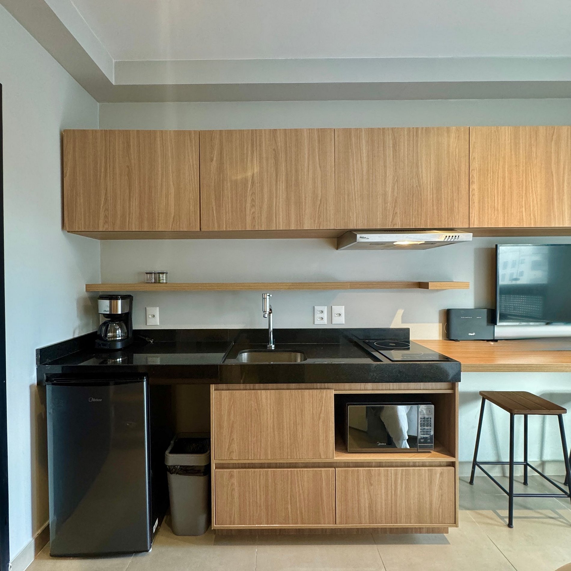 Aqui cada detalhe foi pensado para tornar sua estadia única: cozinha completa com fogão, micro-ondas, cafeteira, frigobar, quarto com cama casal, persiana com blackout, enxoval completo, travesseiros, mantas/edredom para aqueles dias mais frios. O estúdio conta com: wi-fi, ar-condicionado, TV Smart e um espaço para home office.